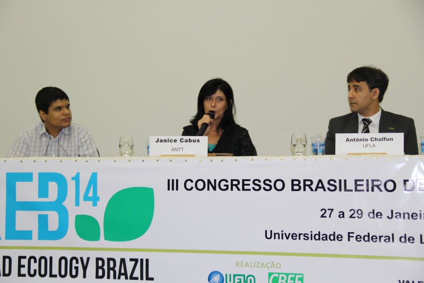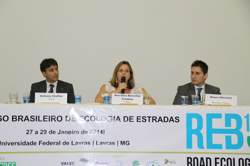 A terceira edição do Road Ecology Brazil (REB 2014) teve hoje (27/01) sua abertura oficial. Com um público envolvido de cerca de 180 pessoas, a cerimônia iniciou-se às 10h, com a presença do diretor de Relações Internacionais da UFLA, professor Antonio Chalfun Júnior (representando o reitor da UFLA, professor José Roberto Soares Scolforo); da coordenadora de Apoio à Pesquisa do Instituto Chico Mendes de Conservação da Biodiversidade, Ana Elisa Schittini; da representante do Núcleo de Meio Ambiente da Agência Nacional de Transportes Terrestres (ANTT), Janice Cabus; do Promotor de Justiça da Coordenadoria Regional das Promotorias de Justiça do Meio Ambiente das Bacias dos rios das Velhas e Paraopebas, Mauro da Fonseca Ellovitch; e do representante da Superintendência de Meio Ambiente da Valec, Daniel Silva Diniz. Como organizador do evento e coordenador do Centro Brasileiro de Estudos em Ecologia de Estradas (CBEE), o professor Alex Bager deu início aos pronunciamentos da mesa de honra.