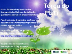 O PETI Engenharia Florestal realizará hoje, às 18h, a palestra: “Restauração Ecológica vs. Reabilitação: qual técnica adotar em áreas mineradas?”, no Anfiteatro do Departamento de Ciências Florestais (DCF).