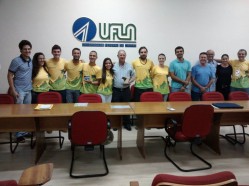 A discente Ana Carolina Rozenberg (Engenharia Ambiental e Sanitária) entregou o certificado da UFLA para o professor Alcides. Também estavam presentes o pró-reitor de Extensão e Cultura, prof. Nilson Salvador; e os docentes coordenadores da missão do Rondon na UFLA, Celso Vallin (DED) e Luiz Antônio de Bastos Andrade (DAG).