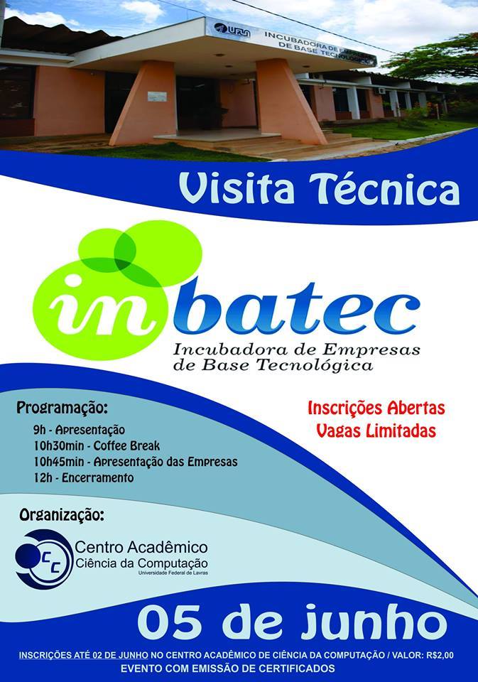 O Centro Acadêmico de Ciência da Computação da Universidade Federal de Lavras (CACC/ UFLA) está organizando visita técnica à Incubadora de Empresas de Base Tecnológica (Inbatec) para o dia 5 de junho.