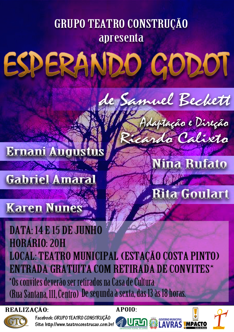 Contando com o apoio da Universidade Federal de Lavras (UFLA), o Grupo Teatro Construção apresentará mais uma peça na cidade: “Esperando Godot”, de Samuel Beckett. As sessões ocorrerão neste final de semana (14/6 e 15/6), às 20h, no Teatro Municipal (Estação Costa Pinho). A entrada é franca. Para participar, os interessados devem retirar os convites na Casa de Cultura (Rua Santana, 111, Centro, Lavras/MG), das 13h às 18h.