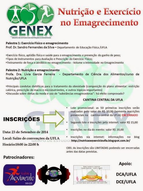 “Nutrição e exercício no emagrecimento” é o tema do evento que será promovido pelo Grupo de Estudo em Nutrição e Exercício (Genex) no dia 23/9. Os interessados em participar devem se apressar, já que o prazo para inscrições termina em 19/9. É possível inscrever-se na Cantina Central, das 12h30 às 14h, ou pela Internet. Nesse último caso, é necessário depositar em conta bancária a taxa de inscrição (R$ 15,00) e enviar o comprovante digitalizado para o e-mail inscricoes.genex@gmail.com.
