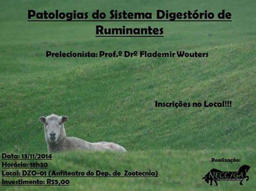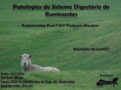Nesta quinta-feira (13/11), às 18h30, o Núcleo de Estudos em Clínica e Cirurgia de Grandes Animais (Necciga) promove a palestra “Patologias do sistema digestório de ruminantes”. Os interessados em participar podem se inscrever no local do evento (Anfiteatro do Departamento de Zootecnia da Universidade Federal de Lavras – DZO/UFLA), pouco antes do início das atividades.