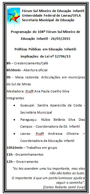 programacao-forum-educacao-infantil 19 de março de 2015 315 × 678 UFLA sedia 108ª edição do Fórum Sul-Mineiro de Educação Infantil – inscrições abertas