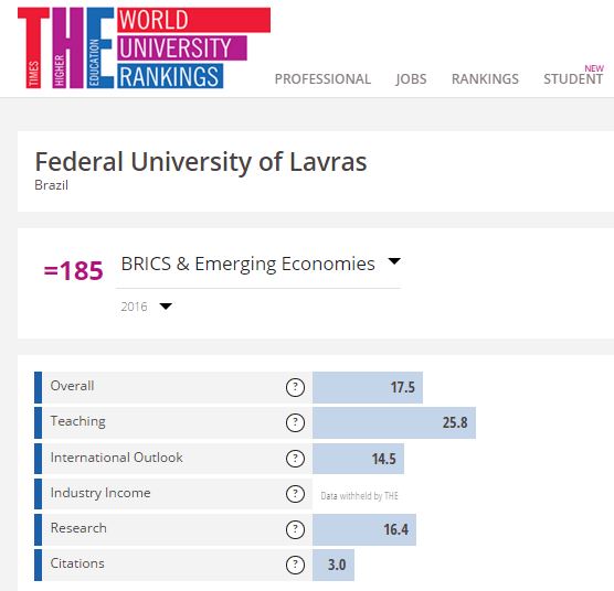 Em mensagem encaminhada à UFLA, o editor do THE World University Rankings, Phil Baty destacou: “A inclusão da Universidade Federal de Lavras no Brics & Emerging Economies rankings 2016 é uma conquista significativa, já que nós classificamos apenas as melhores universidades de 48 países emergentes. Das instituições avaliadas, apenas 35 países compõe a lista final ‘top 200’”.