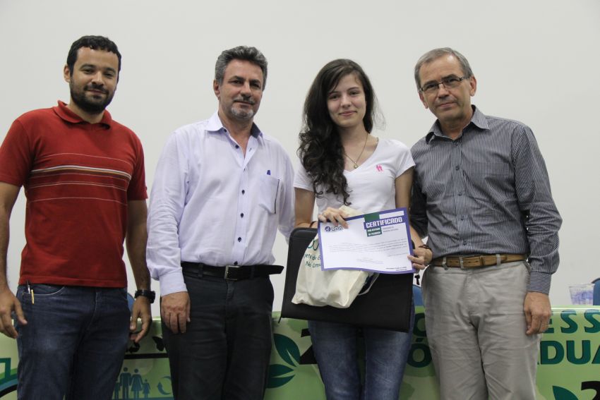 A coordenadora do Programa Bic Júnior na UFLA, professora Débora Cristina de Carvalho, estava presente para homenagear o trabalho que se destacou entre aqueles apresentados por membros do BIC Júnior. Intitulado “Caracterização anatômica de fibras do pseudocaule da musa sp”, o trabalho tem como autores Williano Rezende do Carmo Souza, Bárbara Maria Ribeiro Guimarães, Ellison Rosário de Oliveira, Mário Vanoli Scatolino e Gustavo Henrique Denzin Tonoli.