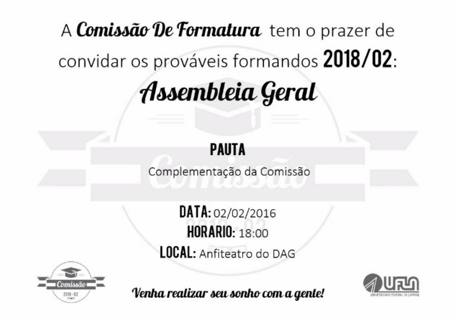 No dia 2 de fevereiro, os prováveis formandos do 2º semestre de 2018 realizarão uma nova assembleia com o objetivo de eleger membros para complementarem a Comissão de Formatura. A assembleia ocorrerá às 18 horas, no Anfiteatro do Departamento de Agricultura (DAG).