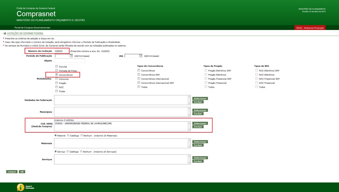 A abertura da licitação será em 16/05, às 8h30, na Diretoria de Gestão de Materiais (DGM), localizada no câmpus universitário. Poderão participar desta Concorrência os interessados cadastrados no Sistema de Cadastramento Unificado de Fornecedores – Sicaf ou que atenderem a todas as condições exigidas para cadastramento até o terceiro dia anterior à data do recebimento das propostas.
