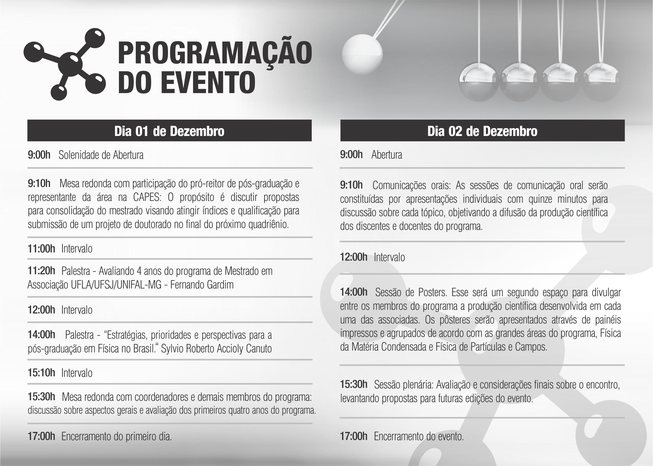 Nos dias 1º e 2 de dezembro será realizado o “Encontro de Integração de Membros do Programa de Pós-Graduação em Física” no Salão dos Conselhos, prédio da Reitoria da Universidade Federal de Lavras (UFLA). Durantes os dois dias de eventos, o início das atividades será às 9h e o término às 17h. Estão incluídas na programação mesas-redondas, palestras, sessões de pôsteres e comunicações orais.