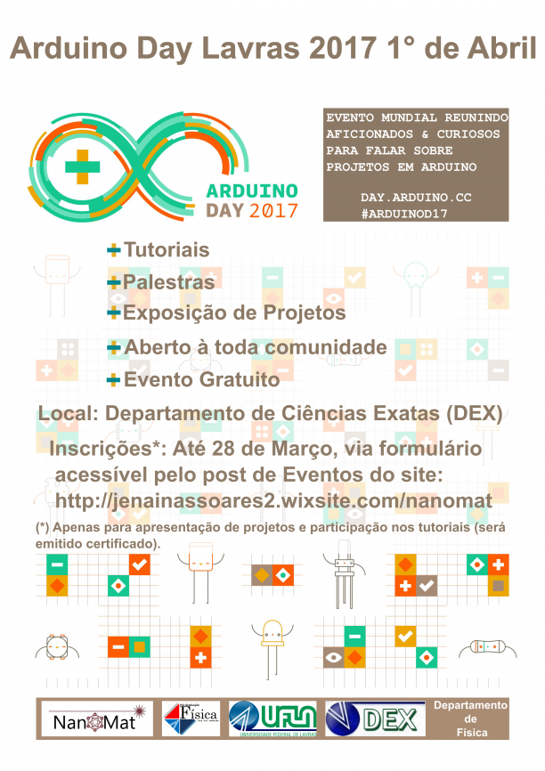 O Grupo de Pesquisa NanoMat do Departamento de Física da Universidade Federal de Lavras (DFI/UFLA) promoverá no dia 1º de abril o Arduino Day 2017 – Lavras. Em sua primeira edição local de Lavras, o evento contará com tutoriais, palestras e espaços para mostra de projetos e troca de experiências.