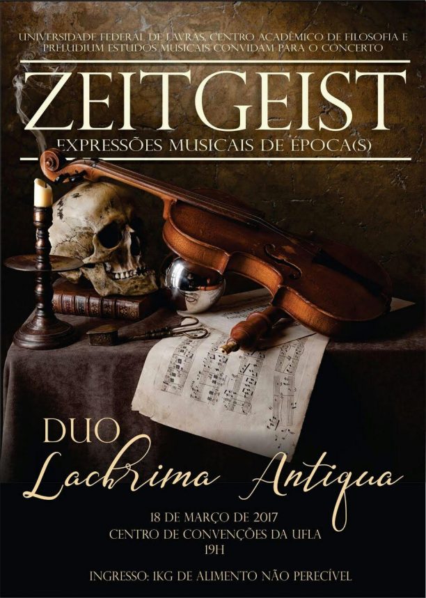 Será realizado no Salão de Convenções da Universidade Federal de Lavras (UFLA) o concerto “Zeitgeist: expressões musicais de época(s)”, promovido pelo Centro Acadêmico de Filosofia e o Preludium Estudos Musicais. O evento ocorrerá às 19h deste sábado (18/3).