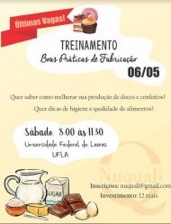 Em 6/5, das 8 às 11h30, ocorrerá na sala da Pós-Graduação do Departamento de Ciência dos Alimentos o “I Treinamento de Boas Práticas de Fabricação para Doceiros”. Membros da comunidade interna e externa à UFLA podem se inscrever.