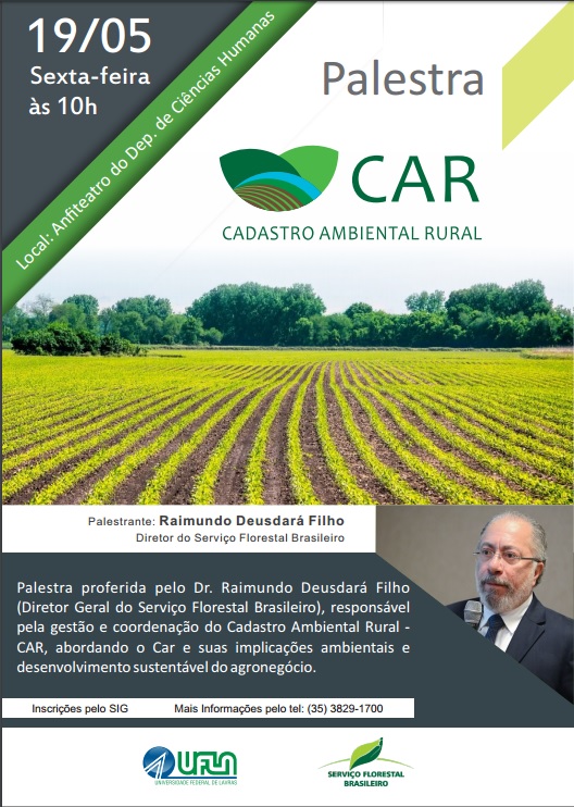 O diretor do Serviço Florestal Brasileiro e responsável pela gestão e coordenação do Cadastro Ambiental Rural (CAR), Raimundo Deusdará Filho, irá proferir palestra na Universidade Federal de Lavras (UFLA) na próxima sexta-feira (19/5). O evento é aberto à participação da comunidade acadêmica e inscrições podem ser feitas no local do evento.