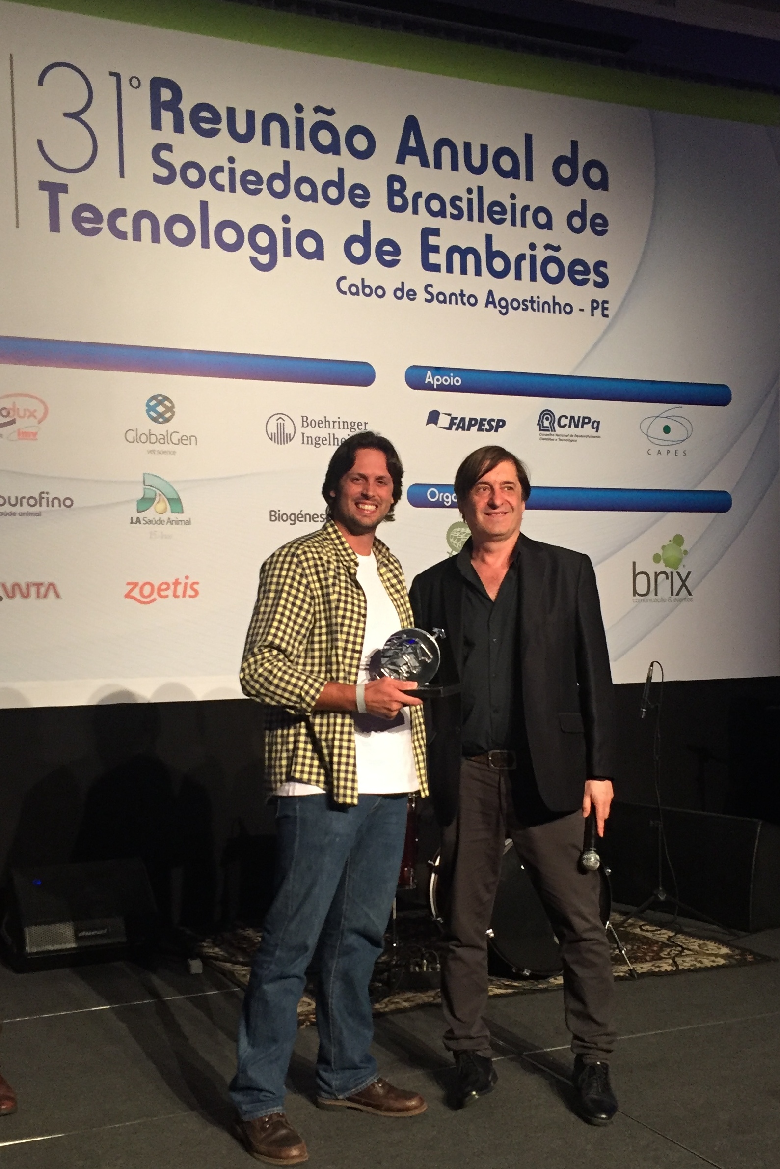 Os estudantes de pós-graduação em Ciências Veterinárias (DMV) da Universidade Federal de Lavras (UFLA), Luiz Augusto Capellari Leite Silva, Miguel Pizzolante Bottino, Luiz Manoel Souza Simões, Gabriella Santos e Ingris Martinez, receberam a premiação pelo melhor trabalho na área aplicada durante a XXXI Reunião da Sociedade Brasileira de Tecnologia de Embriões (SBTE), principal congresso internacional de reprodução animal realizado no Brasil. O evento foi realizado em agosto, na cidade de Cabo de Santo Agostinho, em Pernambuco.