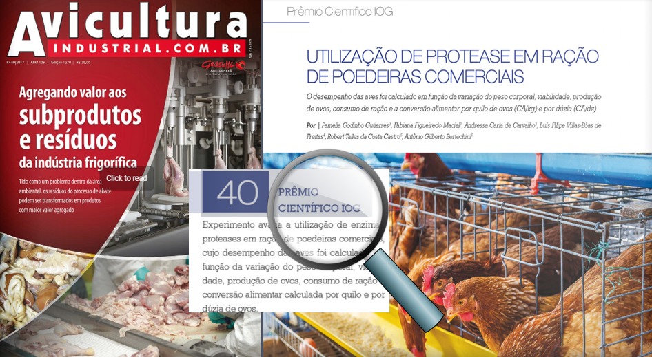 O estudo realizado “Utilização de protease em ração de poedeiras comerciais” foi publicado na íntegra pela Revista Avicultura Industrial, edição 1270. Participaram da pesquisa os estudantes: Pamella Godinho Gutierres, Fabiana Figueiredo Maciel, Andressa Carla de Carvalho, Luís Filipe Villas-Bôas de Freitas, e Robert Talles da Costa Castro. Todos integrantes do Núcleo de Estudos em Ciência e Tecnologia Avícola (NECTA).