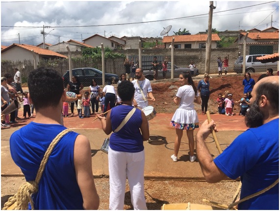 A oportunidade foi de interação com as crianças da escola, a partir de uma oficina percussiva de maracatu, teatro, brincadeiras e entrega de brinquedos, além de um lanche coletivo com os participantes.