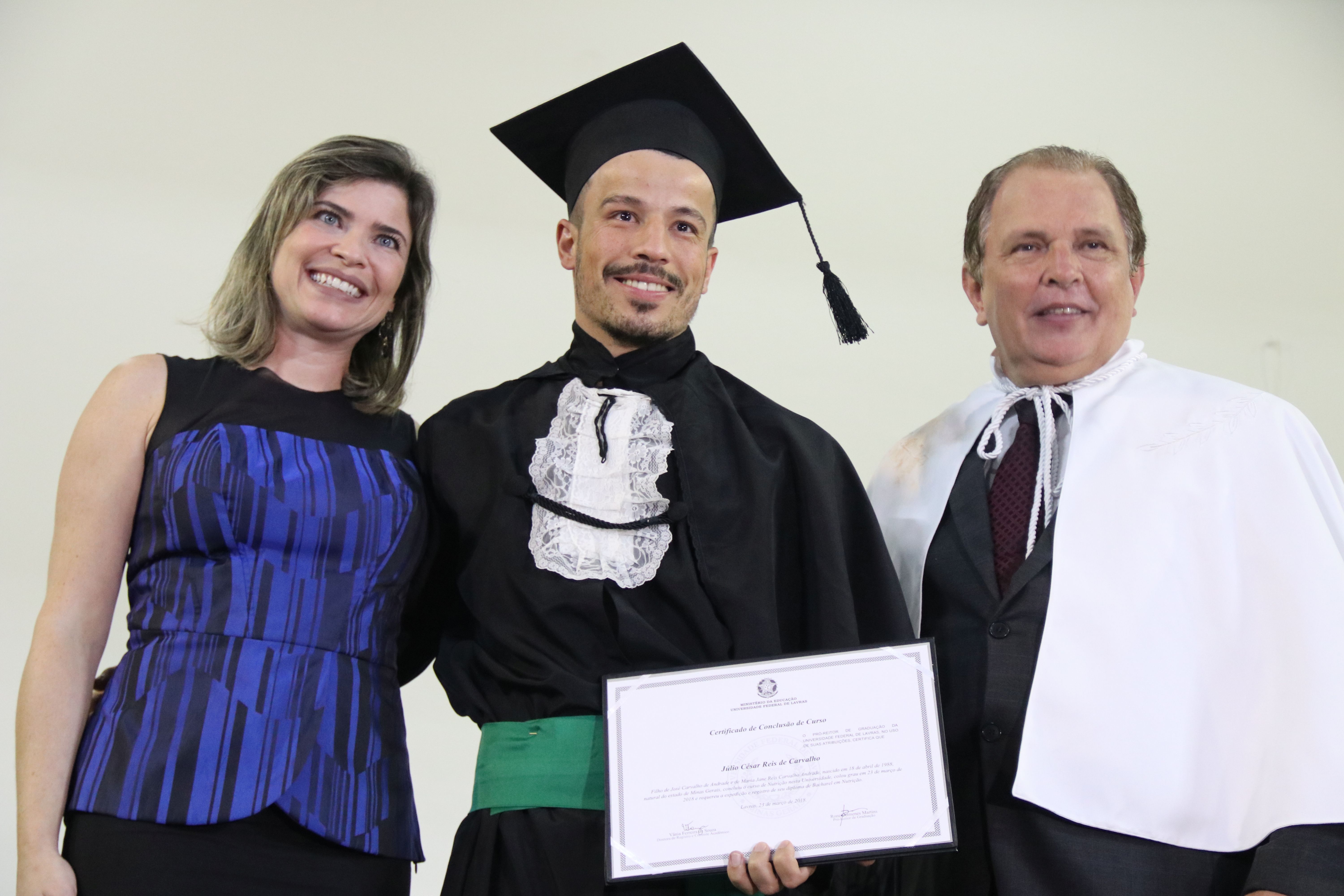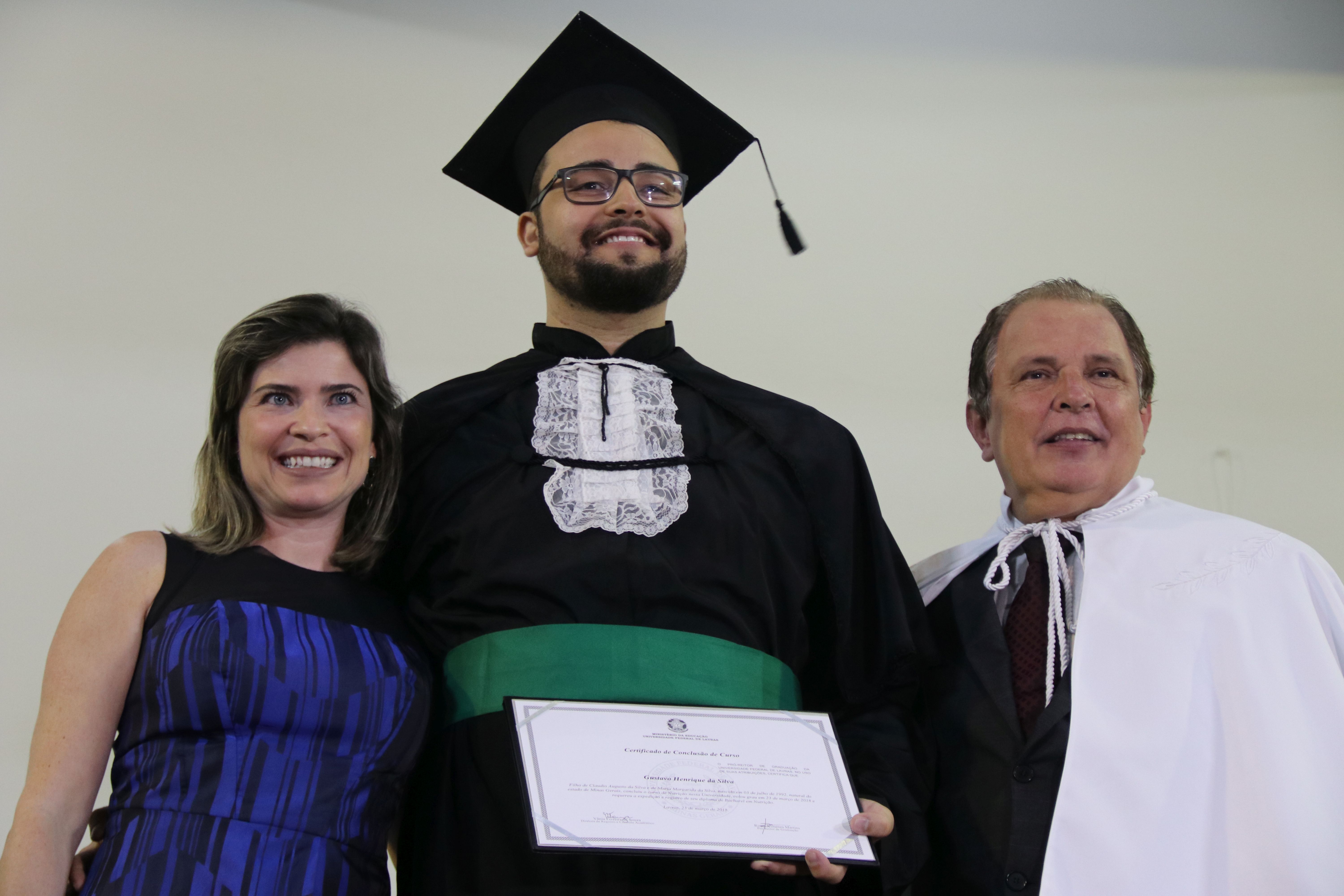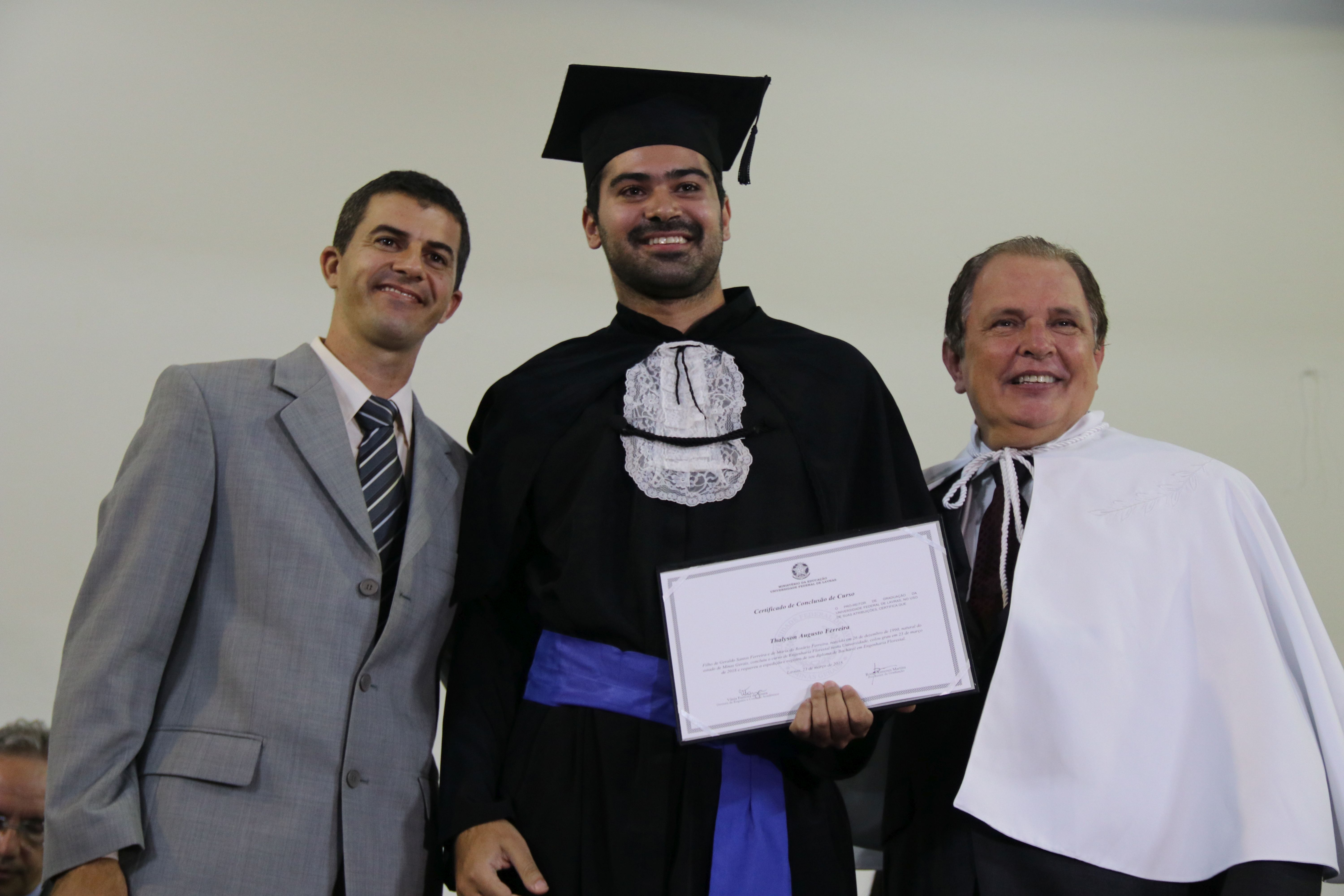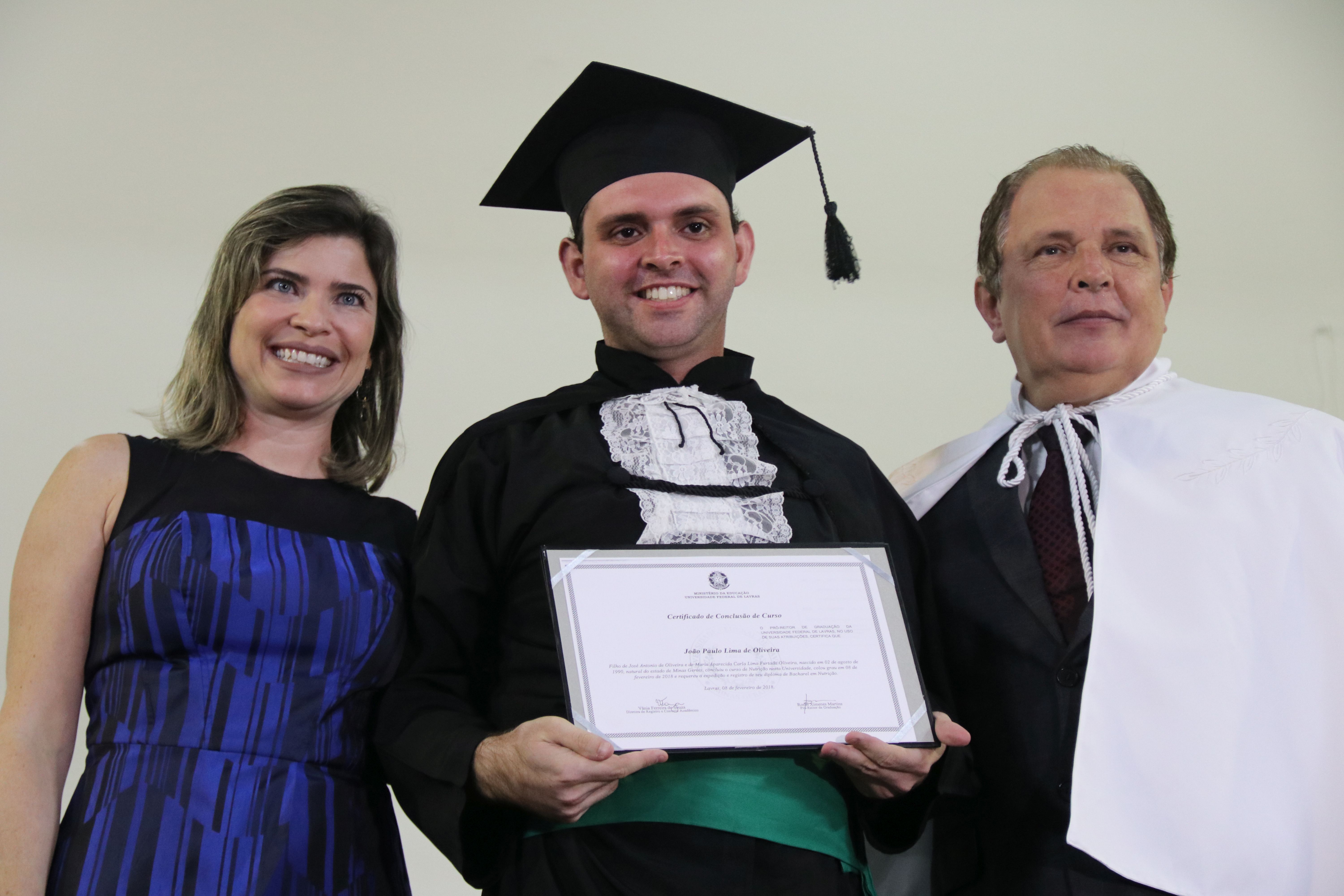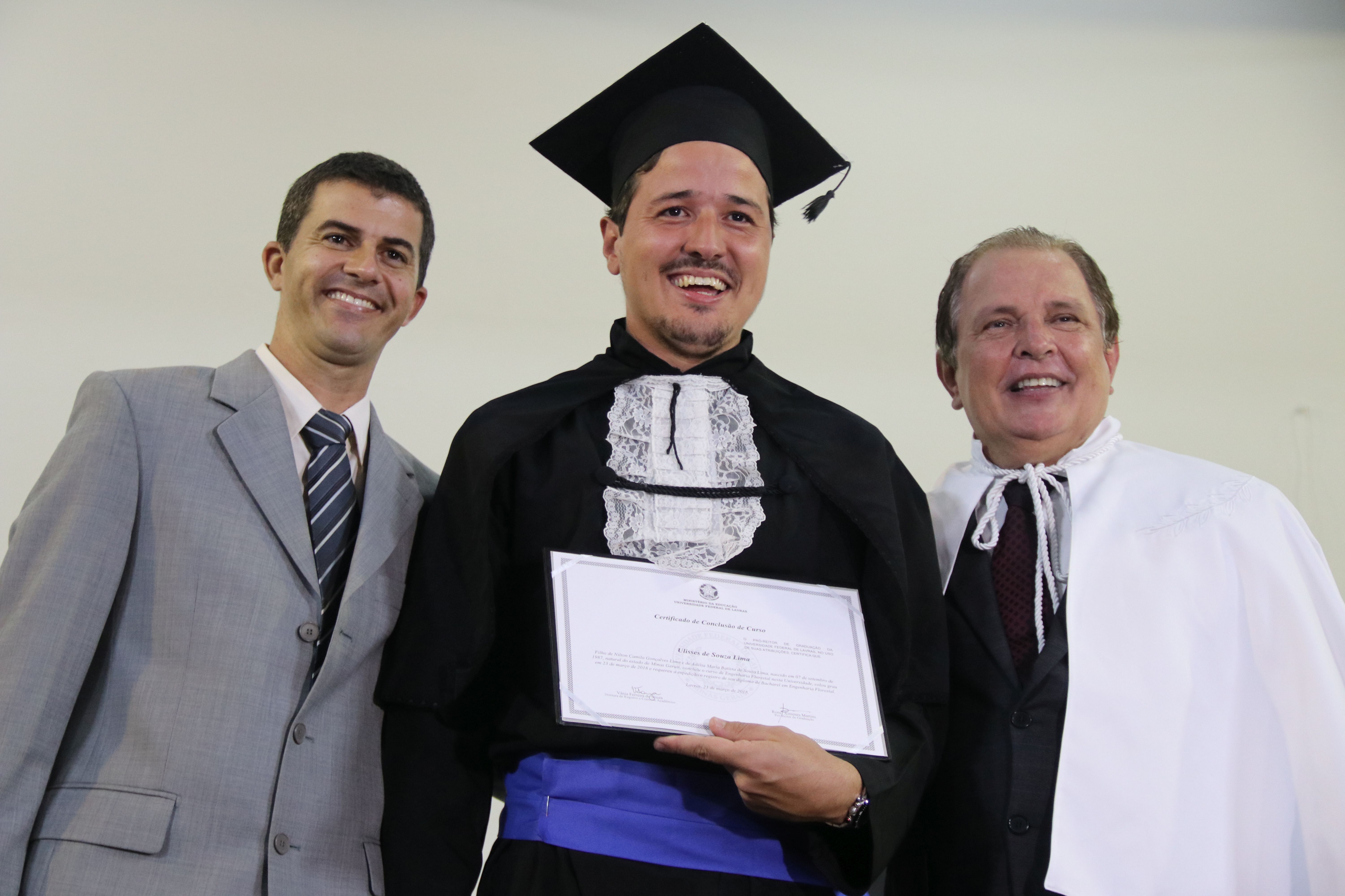 As solenidades foram presididas pelo reitor e presidente do CUNI, professor José Roberto Soares Scolforo. Após fazer referência à tradução das cerimônias na Língua Brasileira de Sinais (Libras), manifestou orgulho pelo fato de a UFLA trabalhar primando pela inclusão e pelo respeito às diversidades. Para os formandos, reforçou a importância do juramento que fizeram, especialmente pelo compromisso com a ética, a justiça e a defesa da liberdade e da paz. “Vocês tiveram a felicidade de se formar sob o investimento do povo brasileiro. Por isso devem se empenhar em cumprir esses compromissos carregados de valores que são hoje tão necessários à sociedade brasileira”. Scolforo também incentivou os novos profissionais a seguirem em frente: “vençam o medo deste momento posterior à conclusão do curso e lutem, busquem alcançar seus sonhos, sejam cidadãos de valor, pratiquem solidariedade e continuem a caminhada com garra e persistência, sempre respeitando as diferenças”.