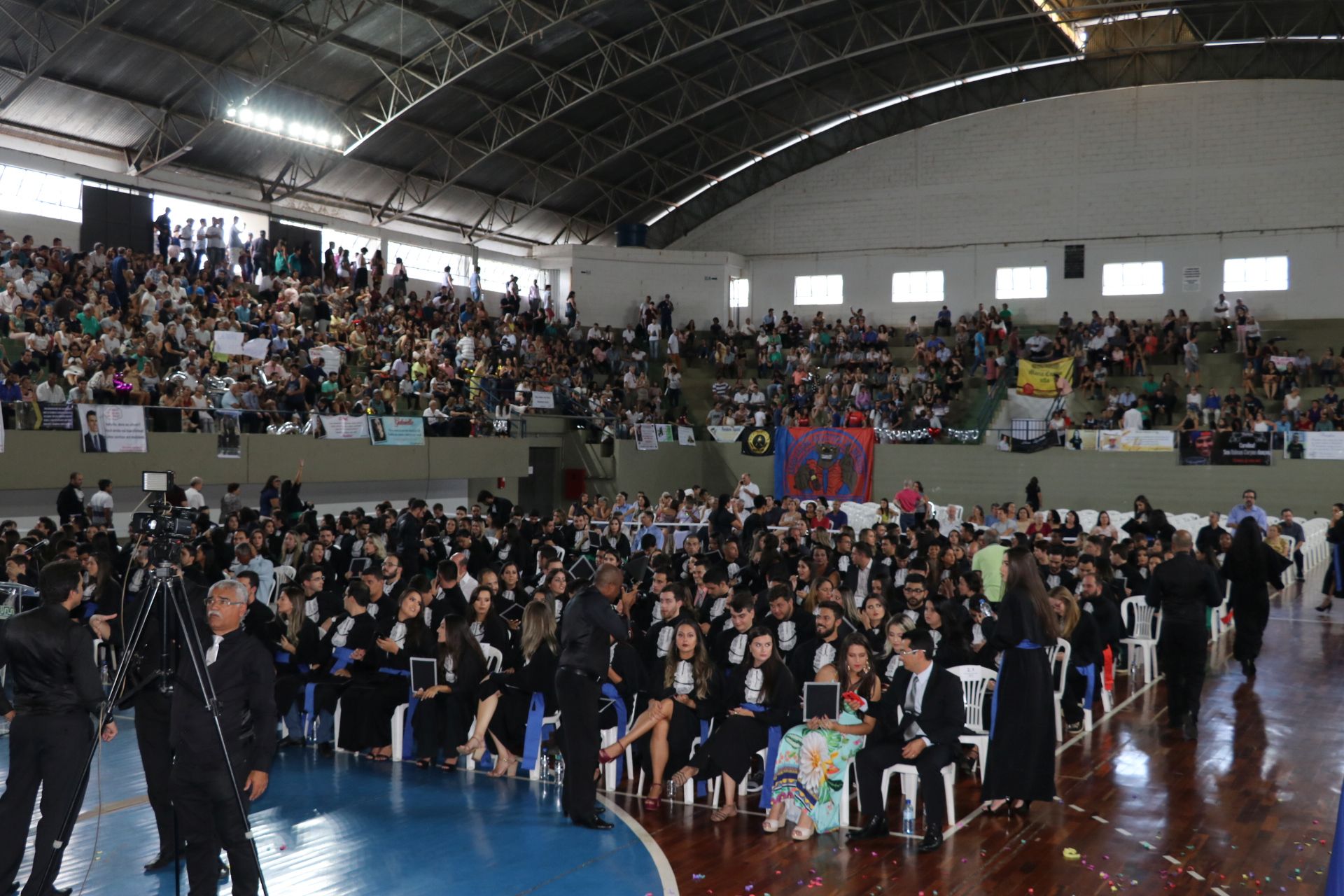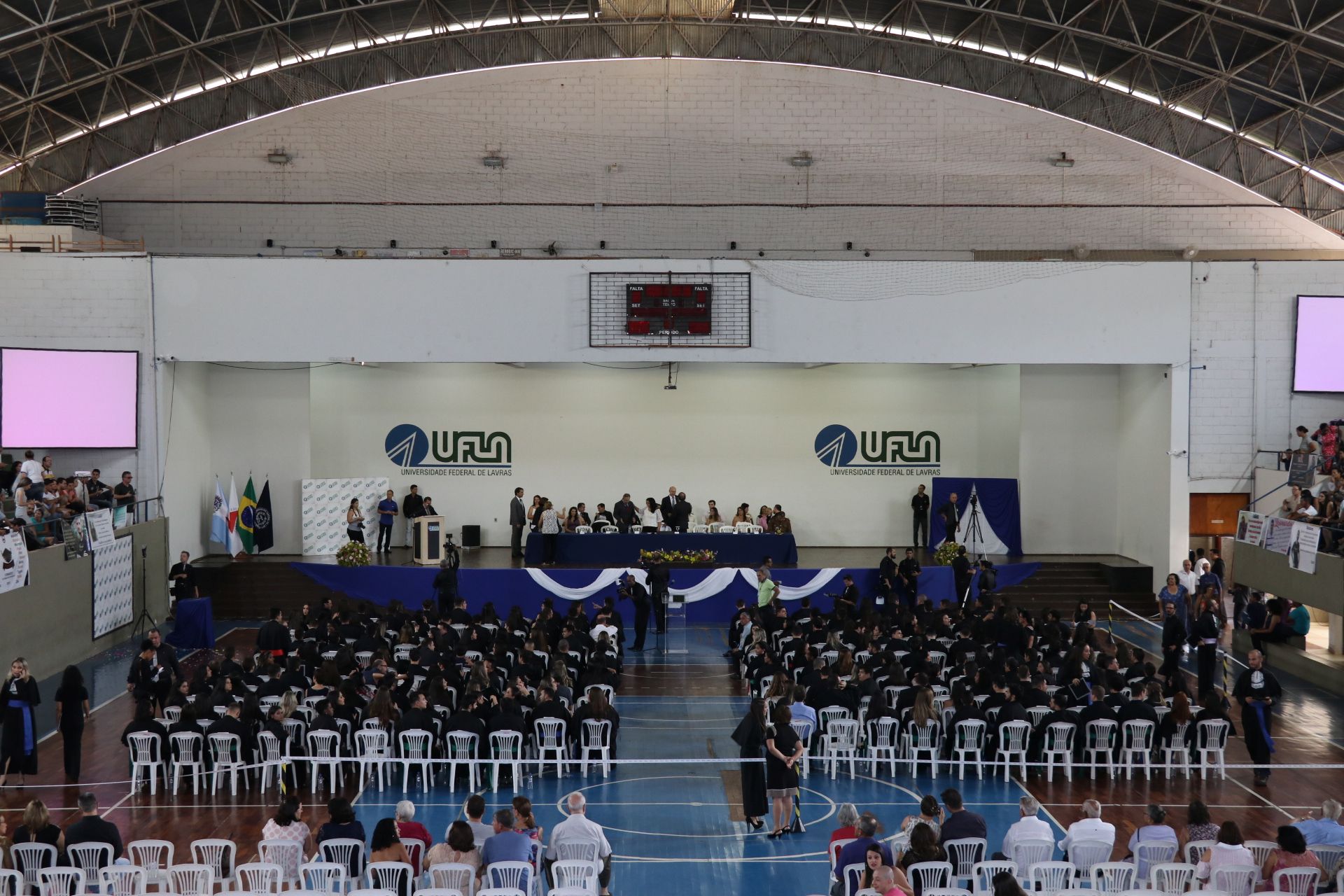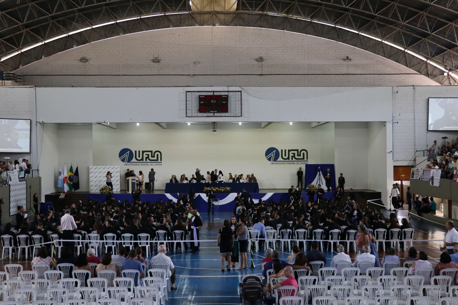 A sexta-feira (23/3) foi de celebração para a Universidade Federal de Lavras (UFLA) e para os 464 formandos que colaram grau durante sessão solene do Conselho Universitário (CUNI). A cerimônia foi realizada no ginásio poliesportivo da instituição, em dois horários – às 14h e às 18h. A outorga de grau garantiu o ingresso no mercado de trabalho de profissionais que concluíram sua formação em 24 cursos.
