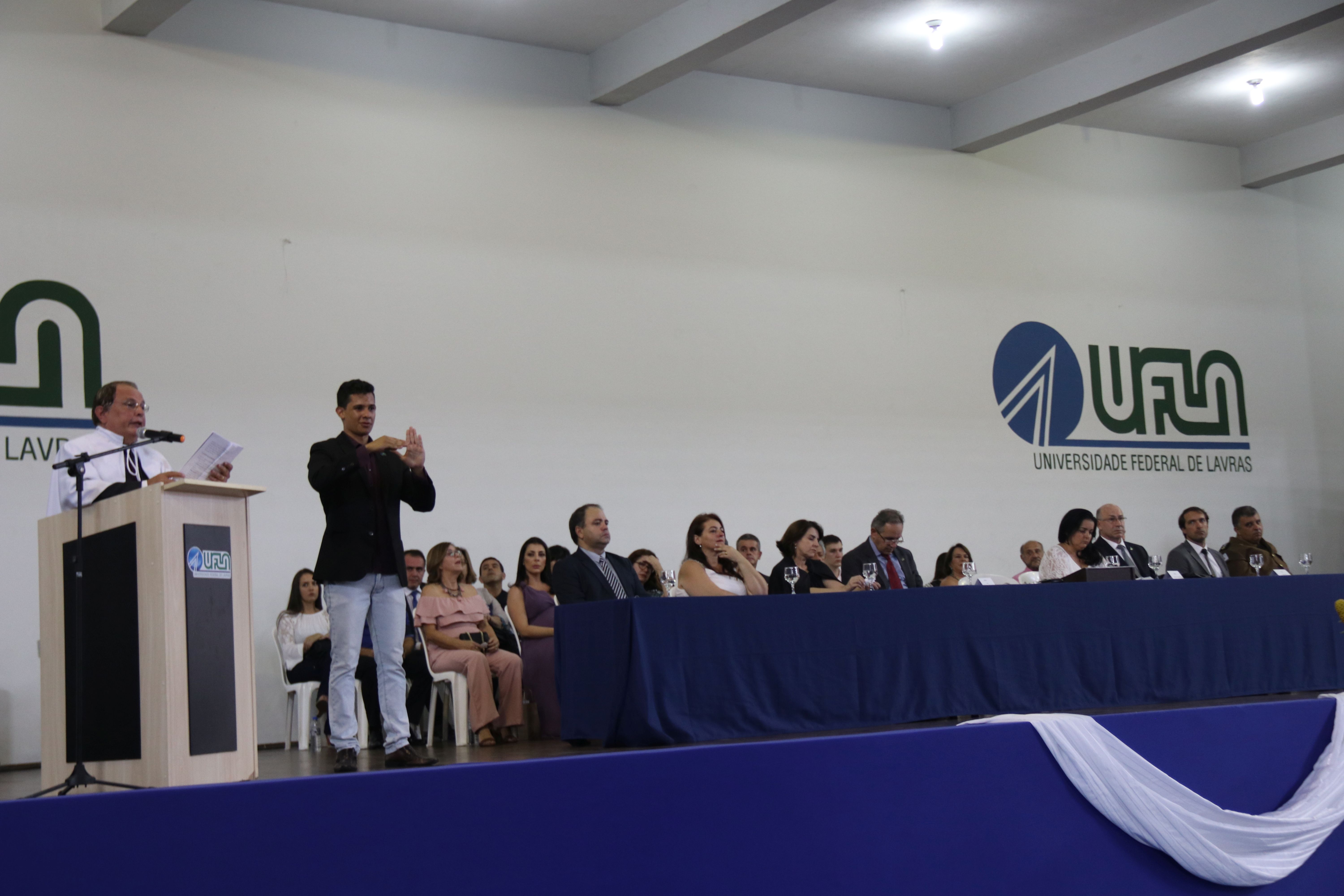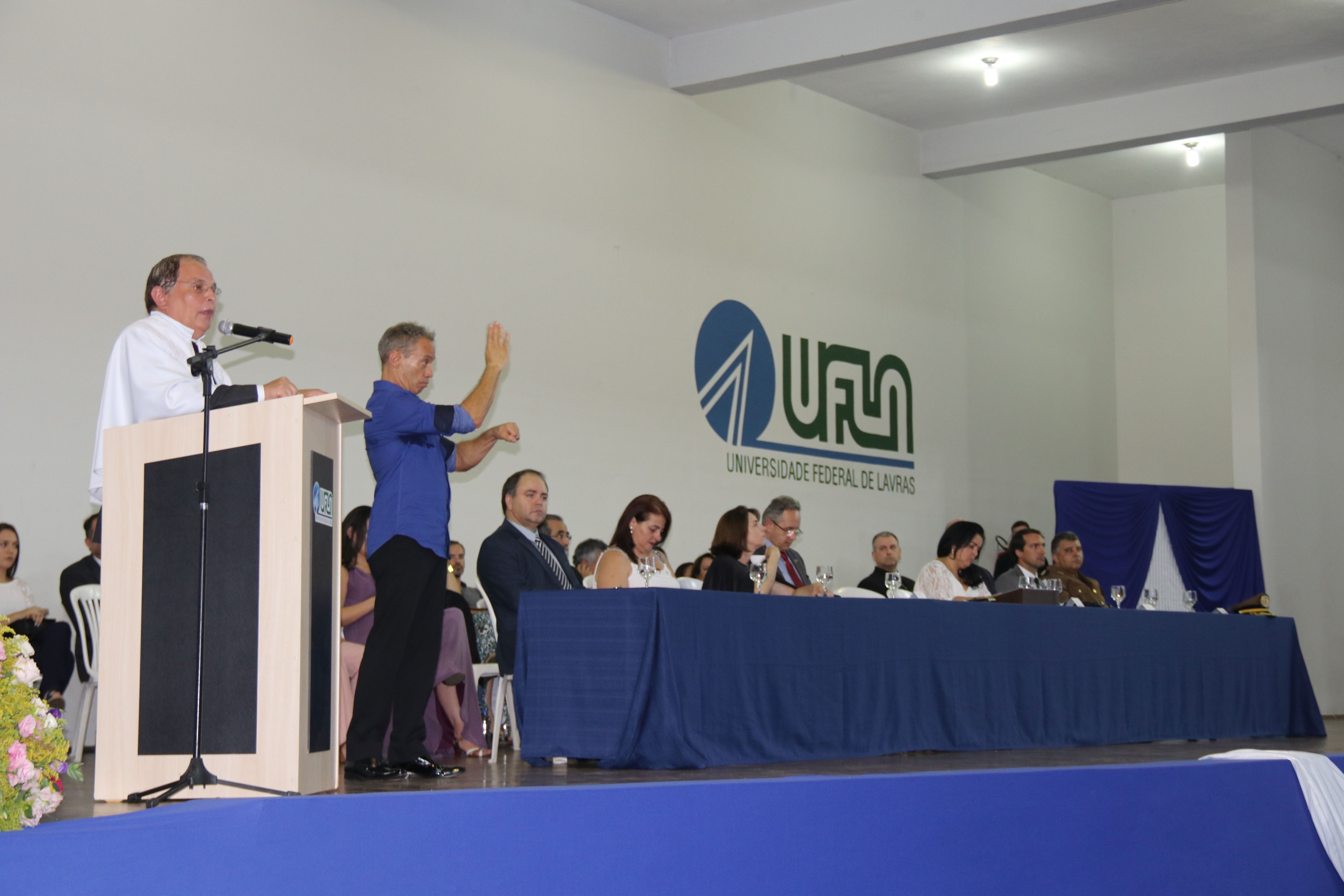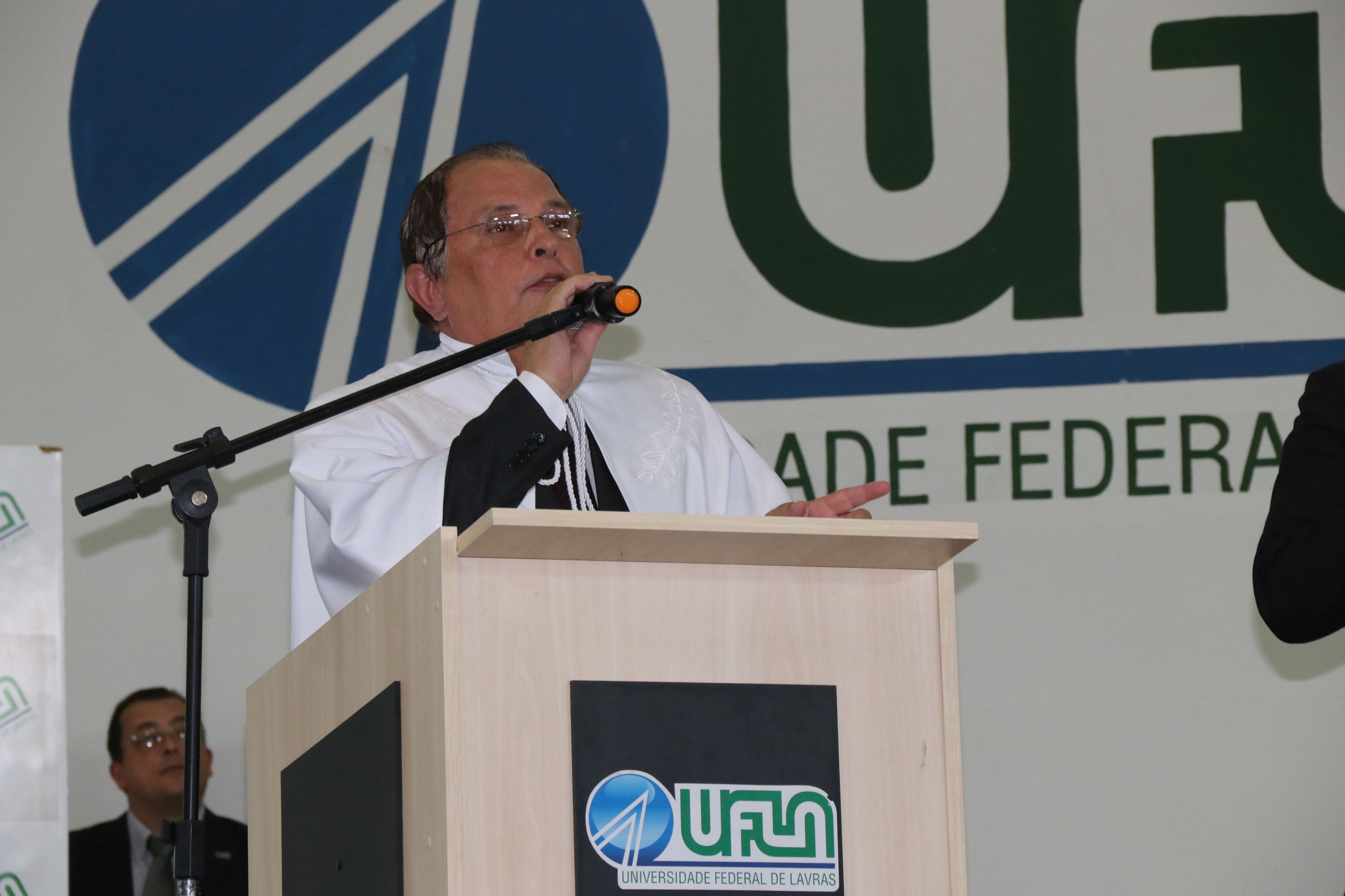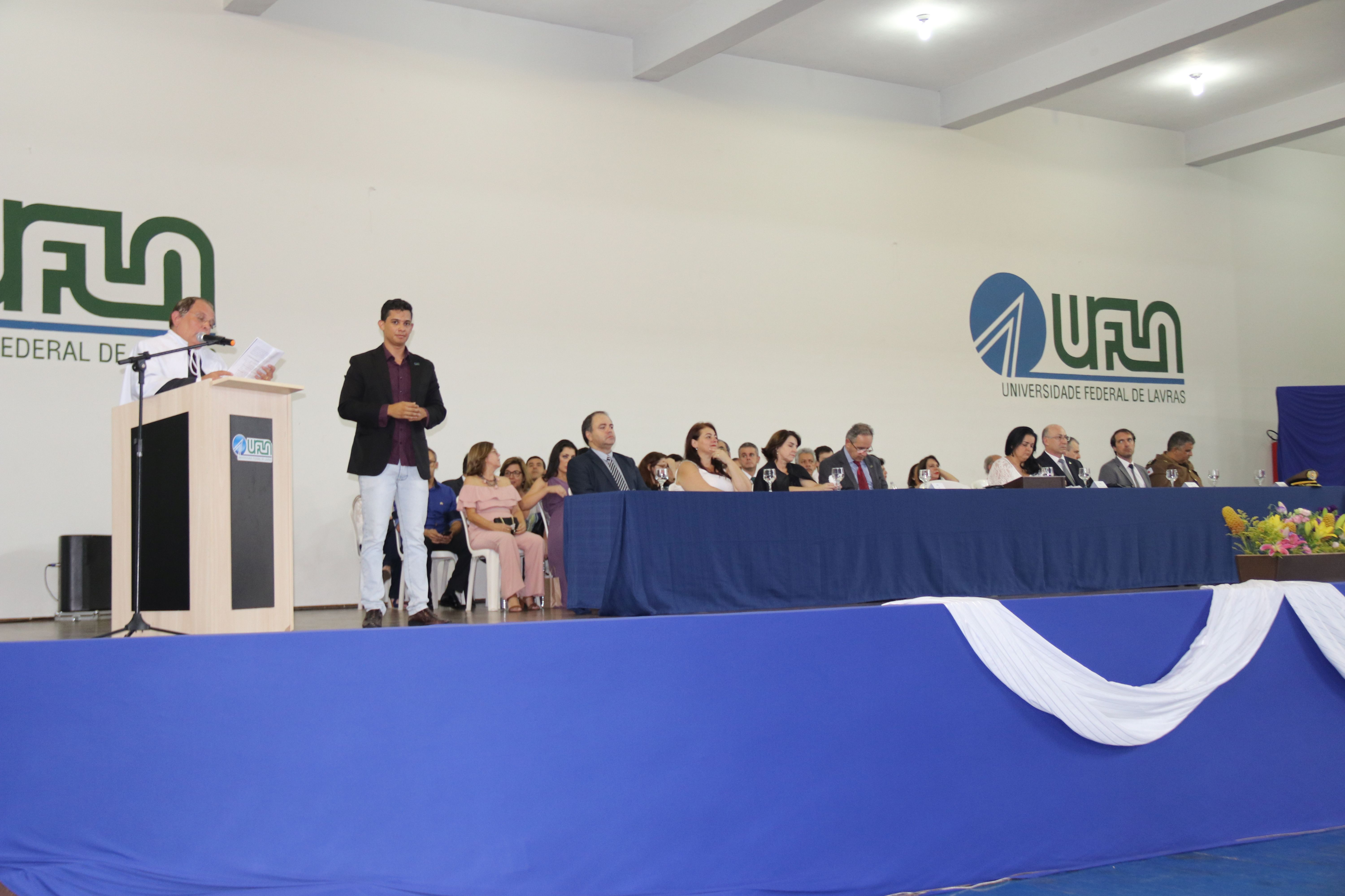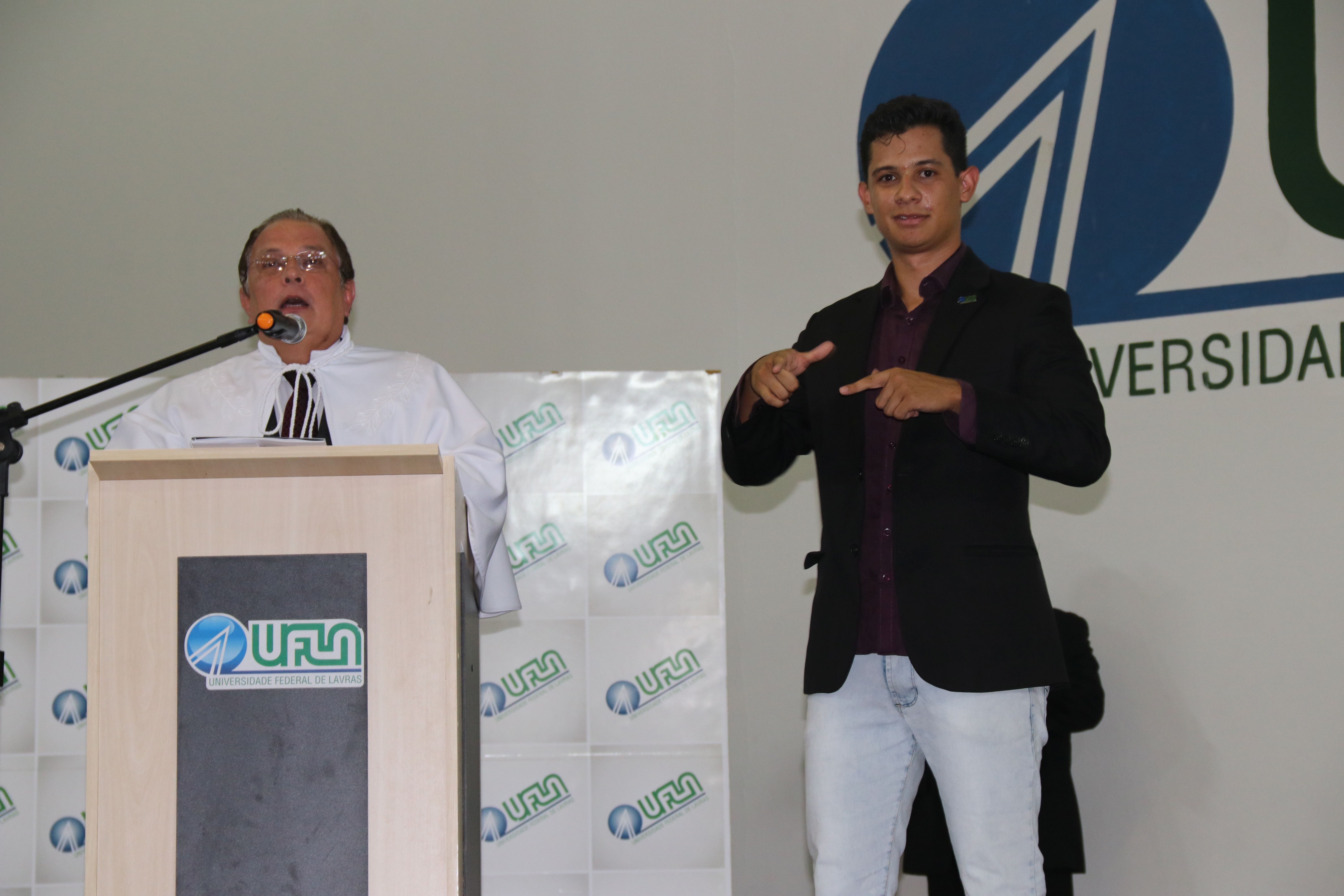 As solenidades foram presididas pelo reitor e presidente do CUNI, professor José Roberto Soares Scolforo. Após fazer referência à tradução das cerimônias na Língua Brasileira de Sinais (Libras), manifestou orgulho pelo fato de a UFLA trabalhar primando pela inclusão e pelo respeito às diversidades. Para os formandos, reforçou a importância do juramento que fizeram, especialmente pelo compromisso com a ética, a justiça e a defesa da liberdade e da paz. “Vocês tiveram a felicidade de se formar sob o investimento do povo brasileiro. Por isso devem se empenhar em cumprir esses compromissos carregados de valores que são hoje tão necessários à sociedade brasileira”. Scolforo também incentivou os novos profissionais a seguirem em frente: “vençam o medo deste momento posterior à conclusão do curso e lutem, busquem alcançar seus sonhos, sejam cidadãos de valor, pratiquem solidariedade e continuem a caminhada com garra e persistência, sempre respeitando as diferenças”.
