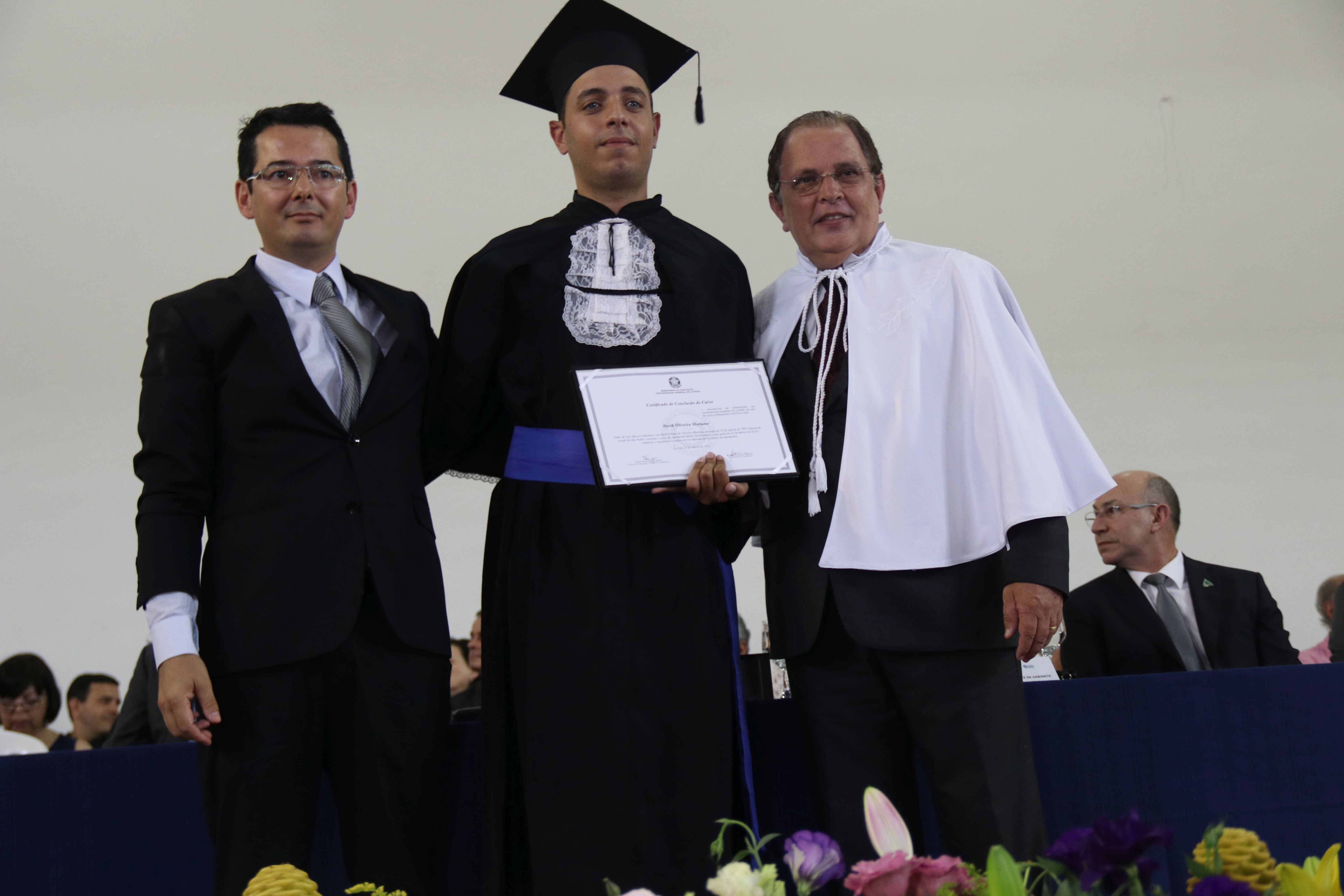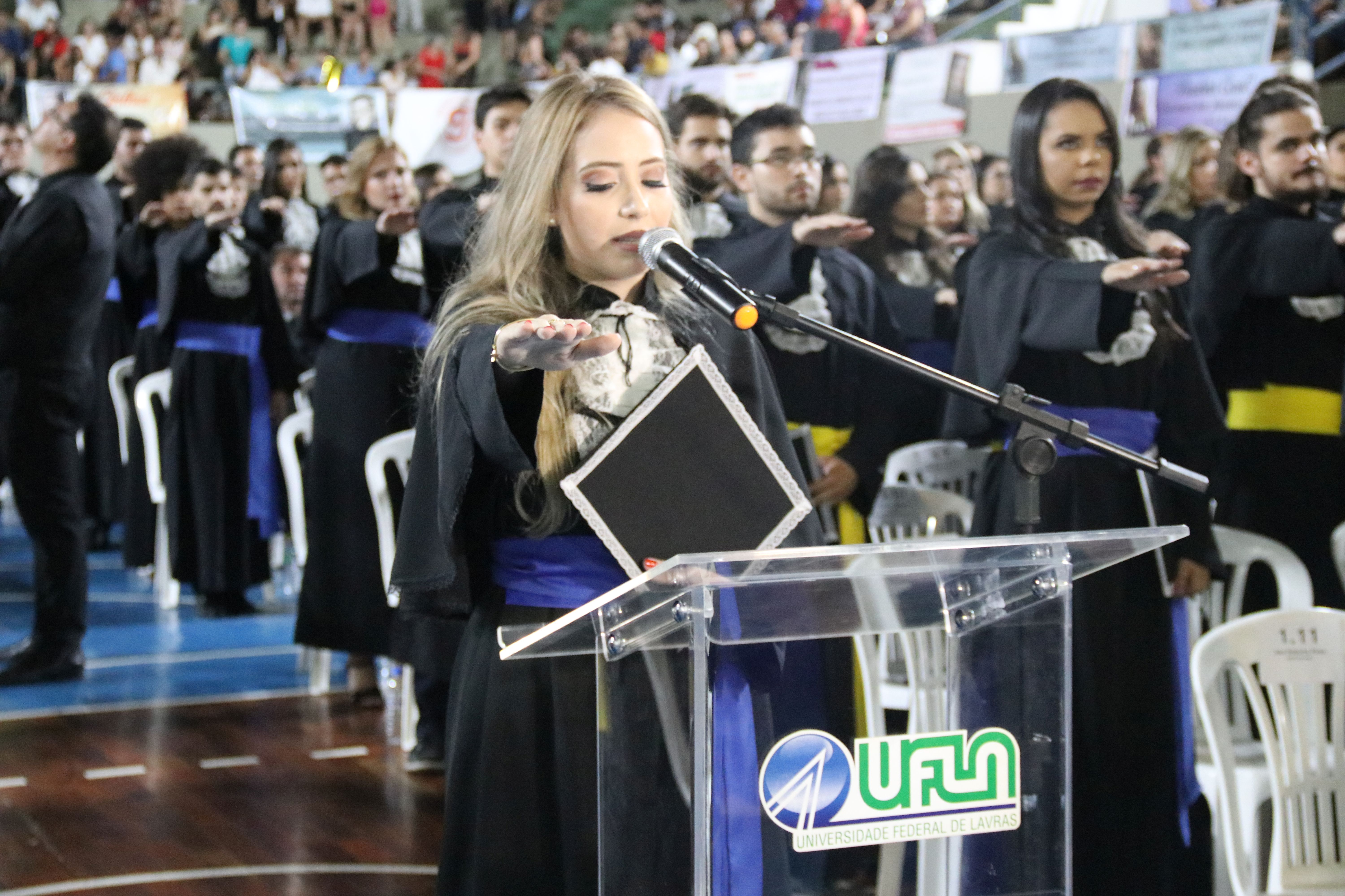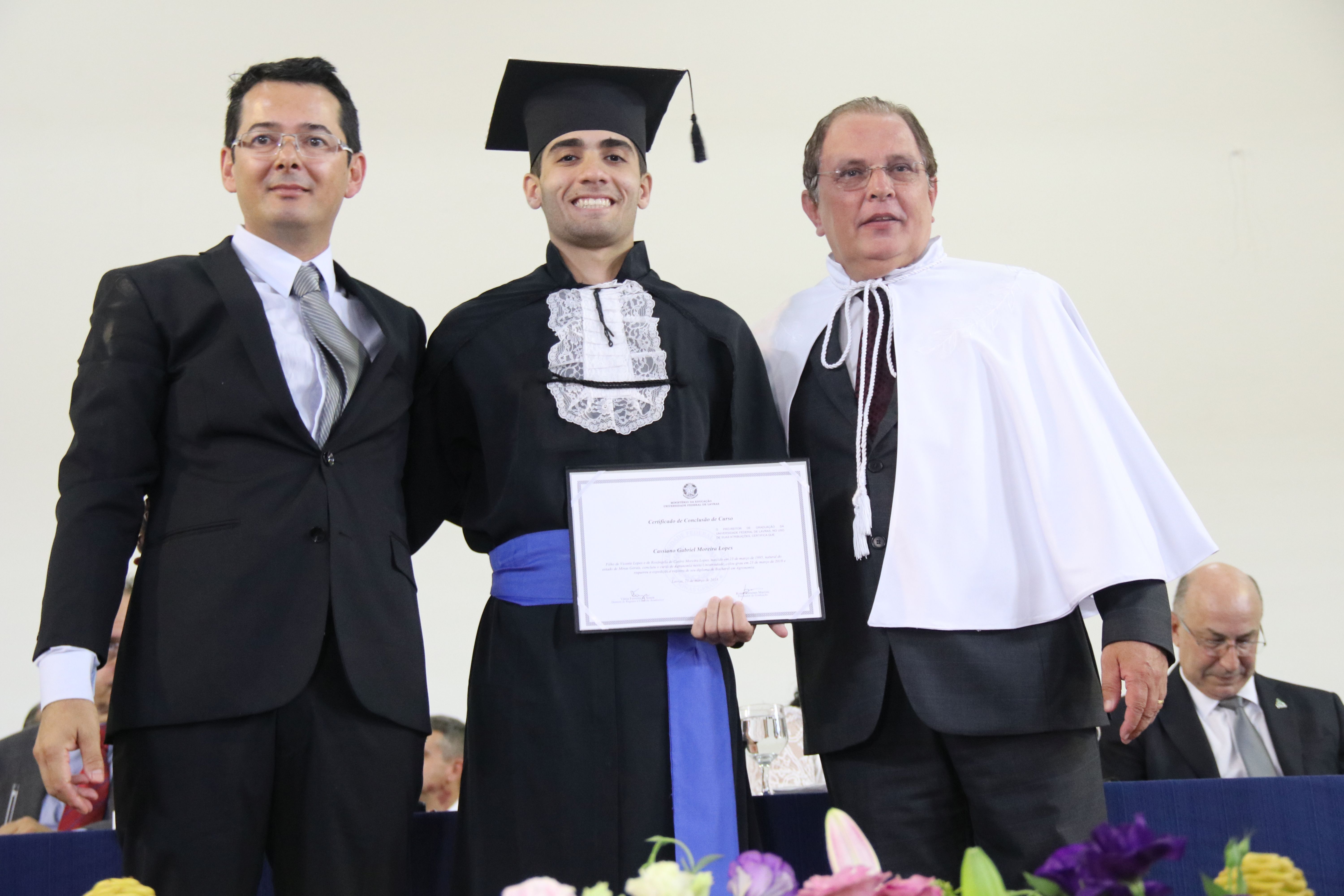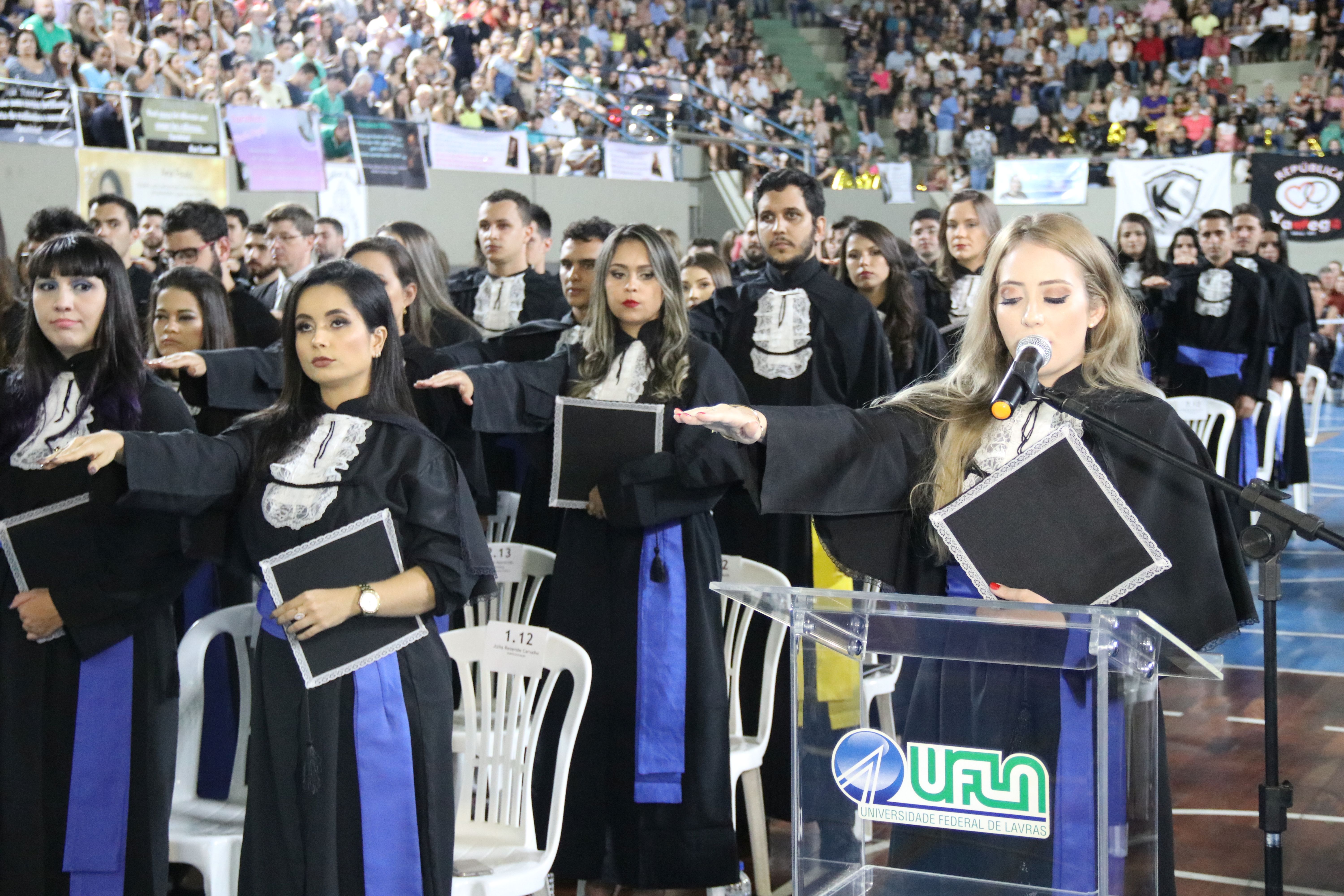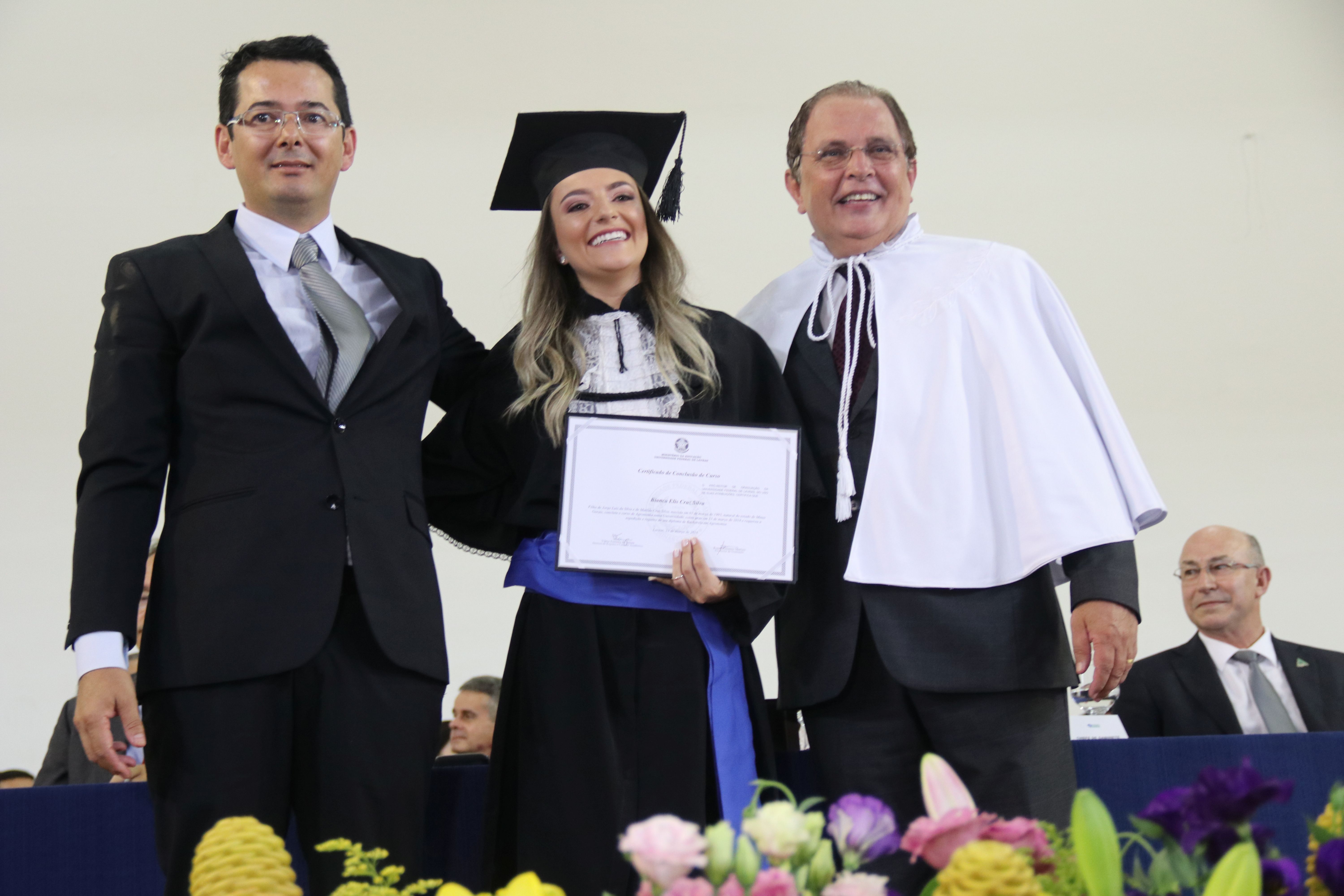 As solenidades foram presididas pelo reitor e presidente do CUNI, professor José Roberto Soares Scolforo. Após fazer referência à tradução das cerimônias na Língua Brasileira de Sinais (Libras), manifestou orgulho pelo fato de a UFLA trabalhar primando pela inclusão e pelo respeito às diversidades. Para os formandos, reforçou a importância do juramento que fizeram, especialmente pelo compromisso com a ética, a justiça e a defesa da liberdade e da paz. “Vocês tiveram a felicidade de se formar sob o investimento do povo brasileiro. Por isso devem se empenhar em cumprir esses compromissos carregados de valores que são hoje tão necessários à sociedade brasileira”. Scolforo também incentivou os novos profissionais a seguirem em frente: “vençam o medo deste momento posterior à conclusão do curso e lutem, busquem alcançar seus sonhos, sejam cidadãos de valor, pratiquem solidariedade e continuem a caminhada com garra e persistência, sempre respeitando as diferenças”.
