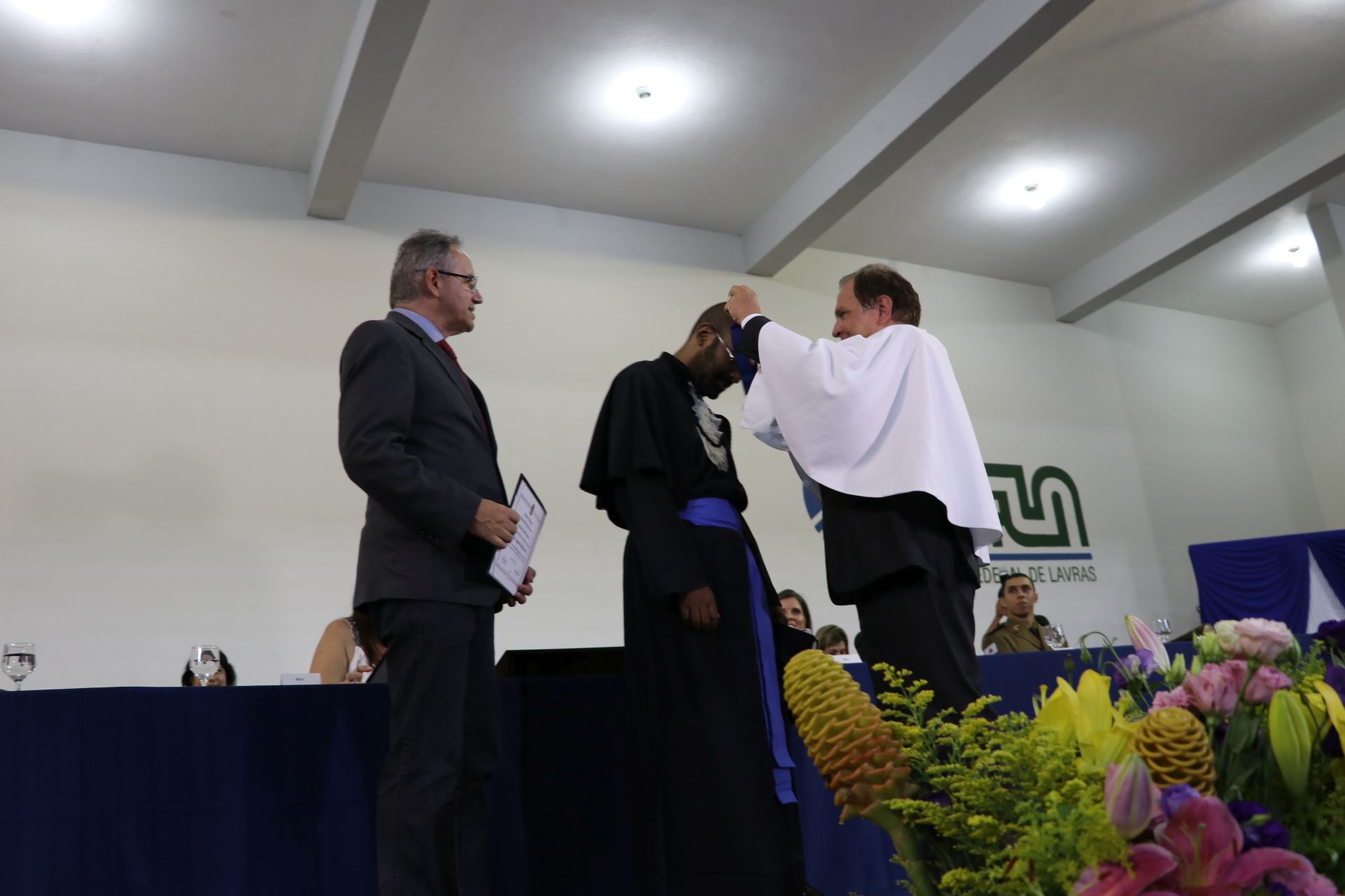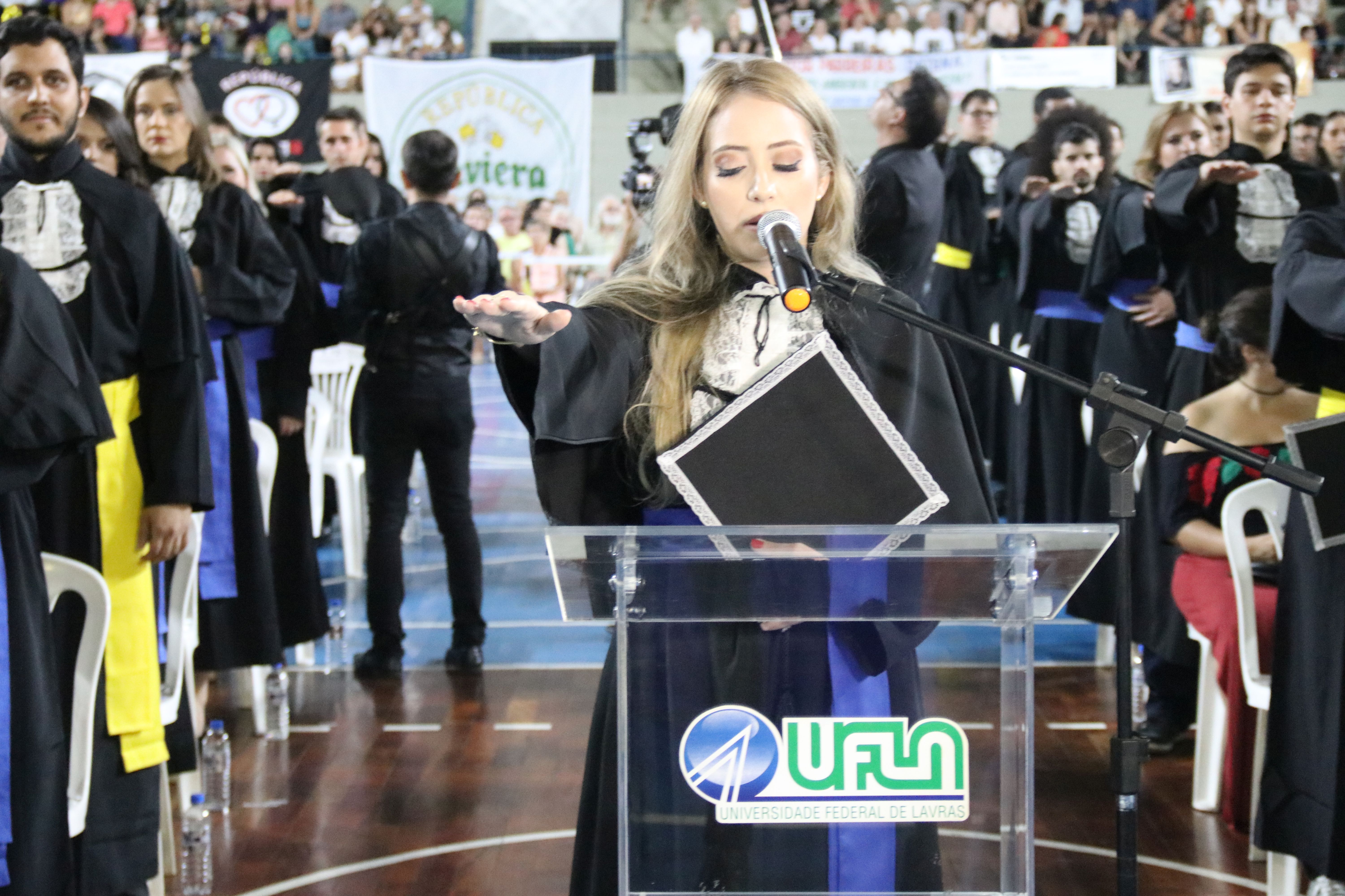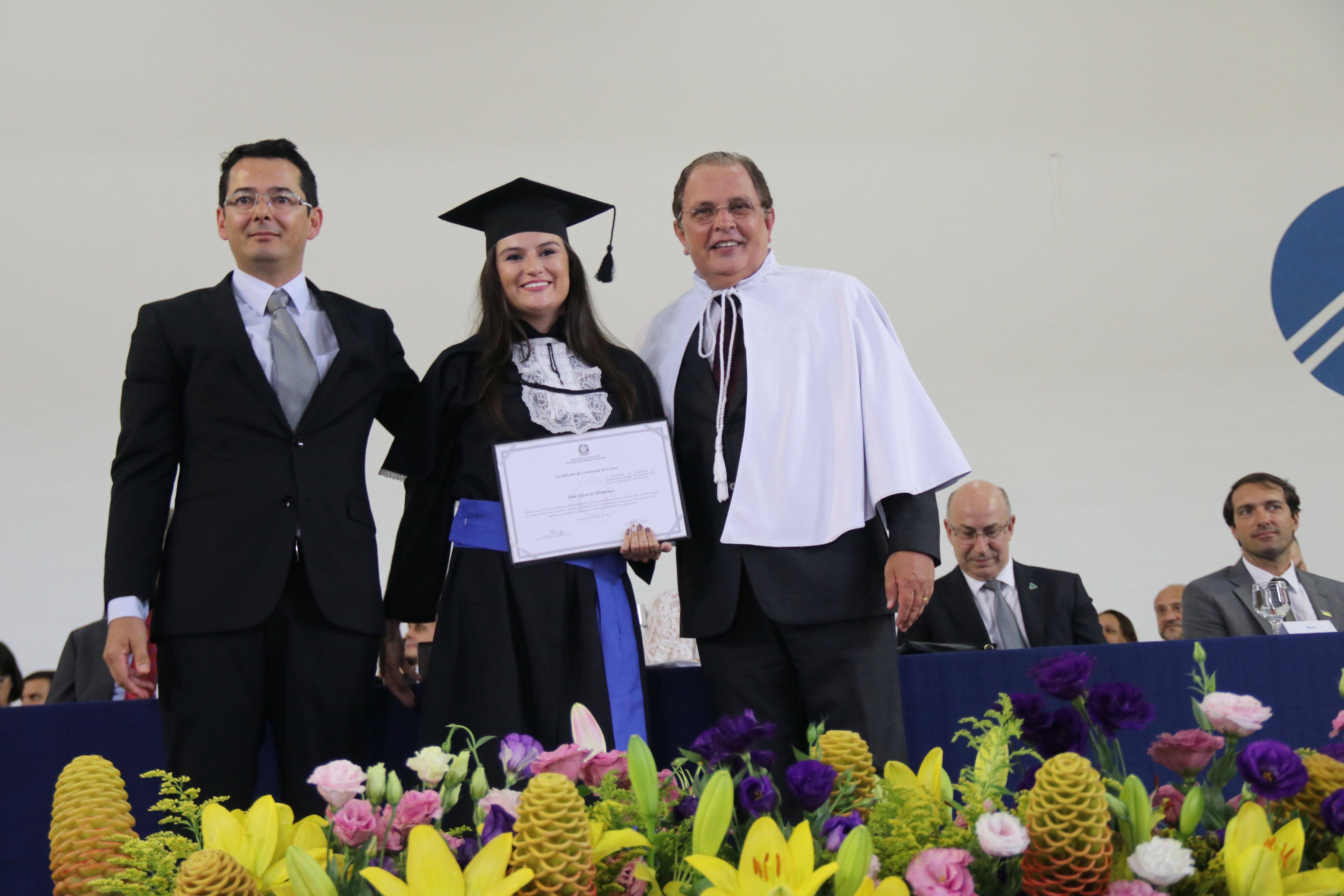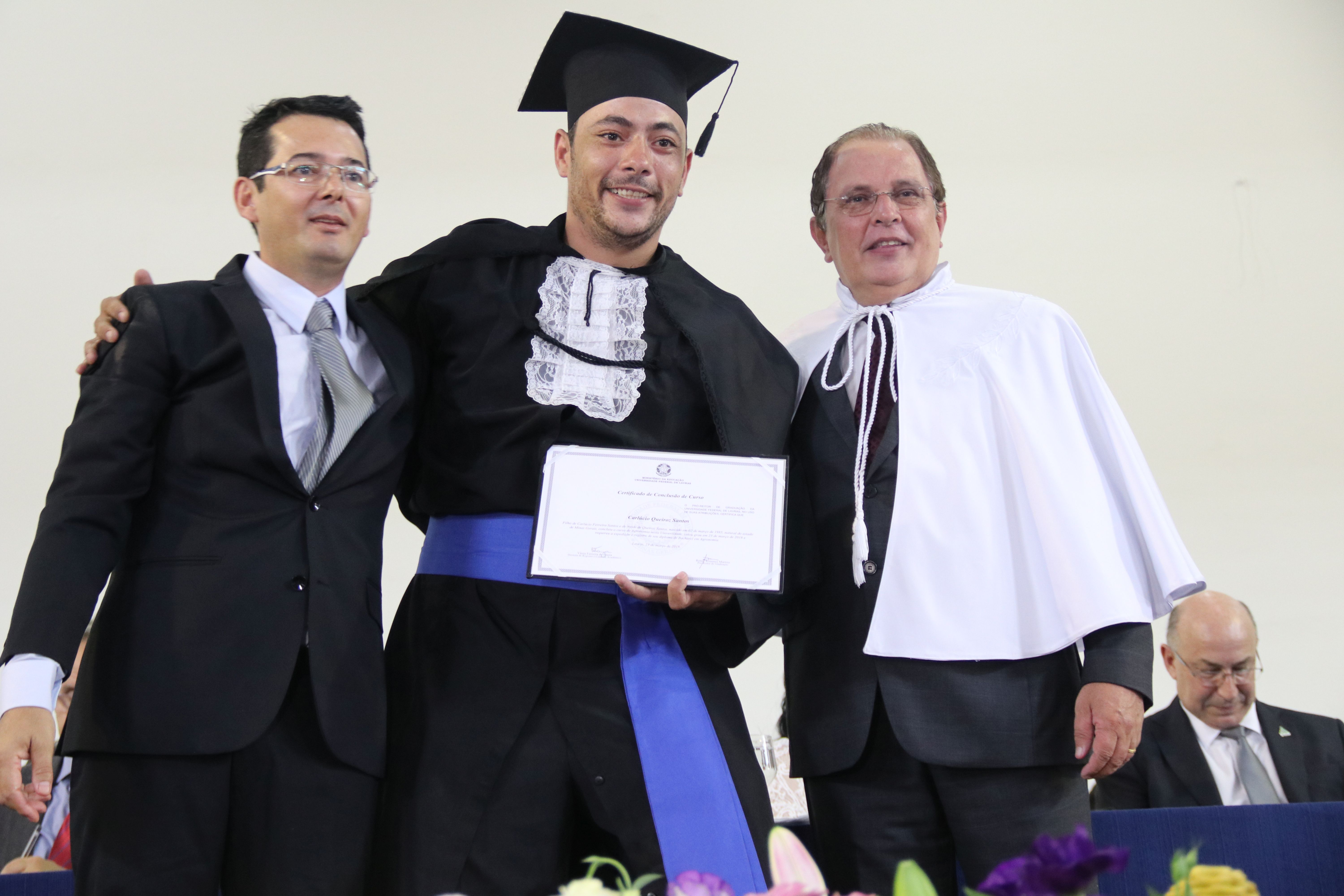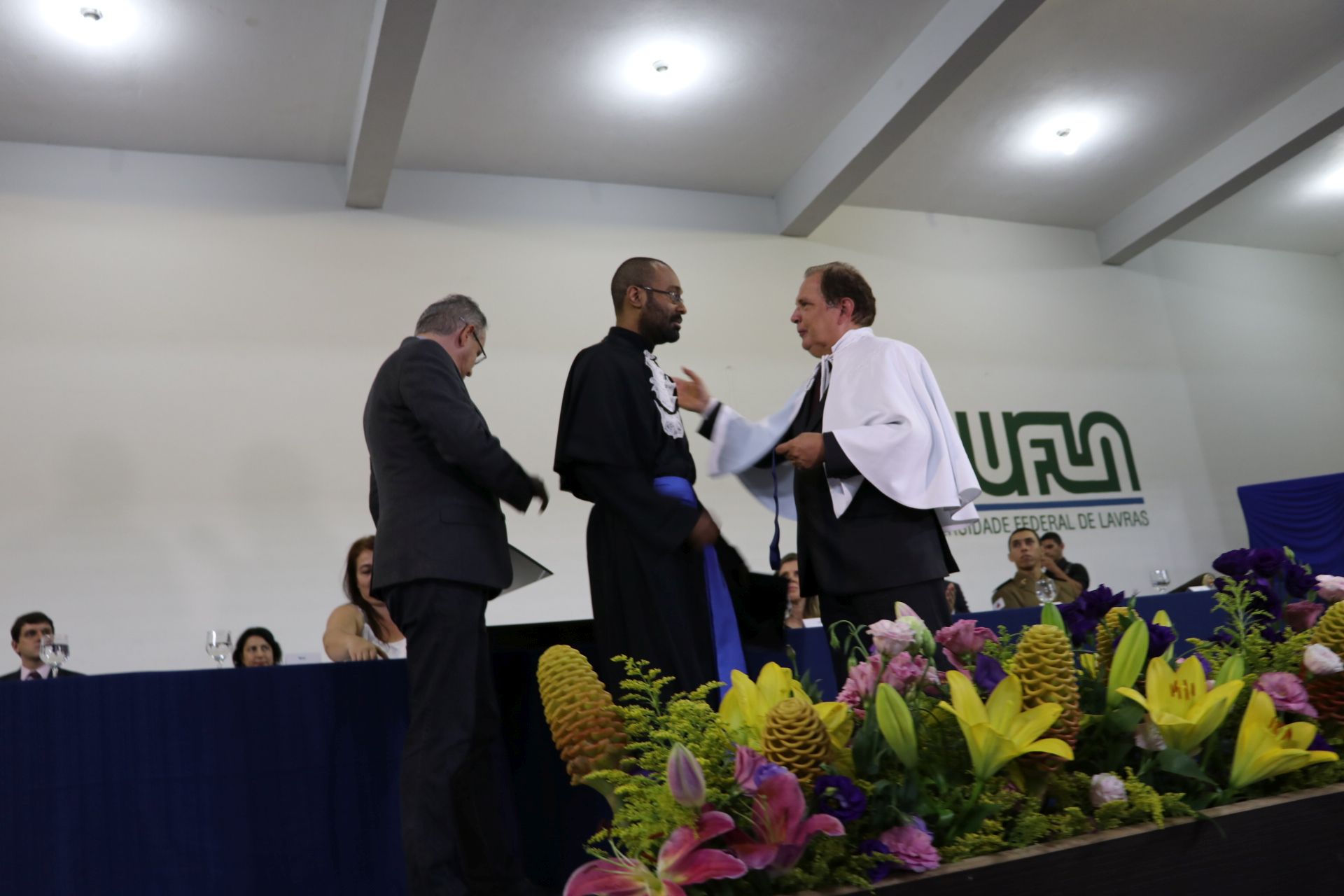 As solenidades foram presididas pelo reitor e presidente do CUNI, professor José Roberto Soares Scolforo. Após fazer referência à tradução das cerimônias na Língua Brasileira de Sinais (Libras), manifestou orgulho pelo fato de a UFLA trabalhar primando pela inclusão e pelo respeito às diversidades. Para os formandos, reforçou a importância do juramento que fizeram, especialmente pelo compromisso com a ética, a justiça e a defesa da liberdade e da paz. “Vocês tiveram a felicidade de se formar sob o investimento do povo brasileiro. Por isso devem se empenhar em cumprir esses compromissos carregados de valores que são hoje tão necessários à sociedade brasileira”. Scolforo também incentivou os novos profissionais a seguirem em frente: “vençam o medo deste momento posterior à conclusão do curso e lutem, busquem alcançar seus sonhos, sejam cidadãos de valor, pratiquem solidariedade e continuem a caminhada com garra e persistência, sempre respeitando as diferenças”.