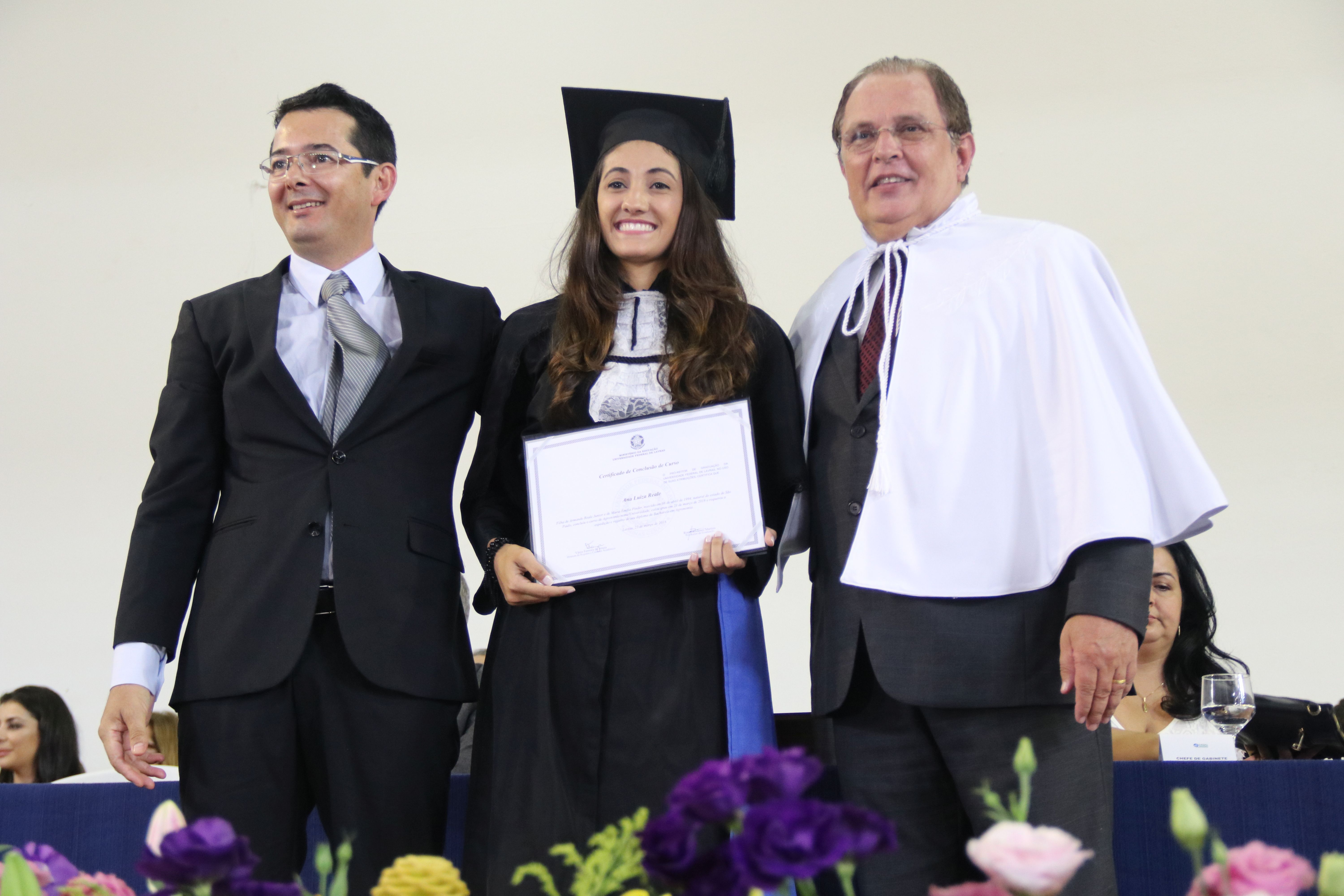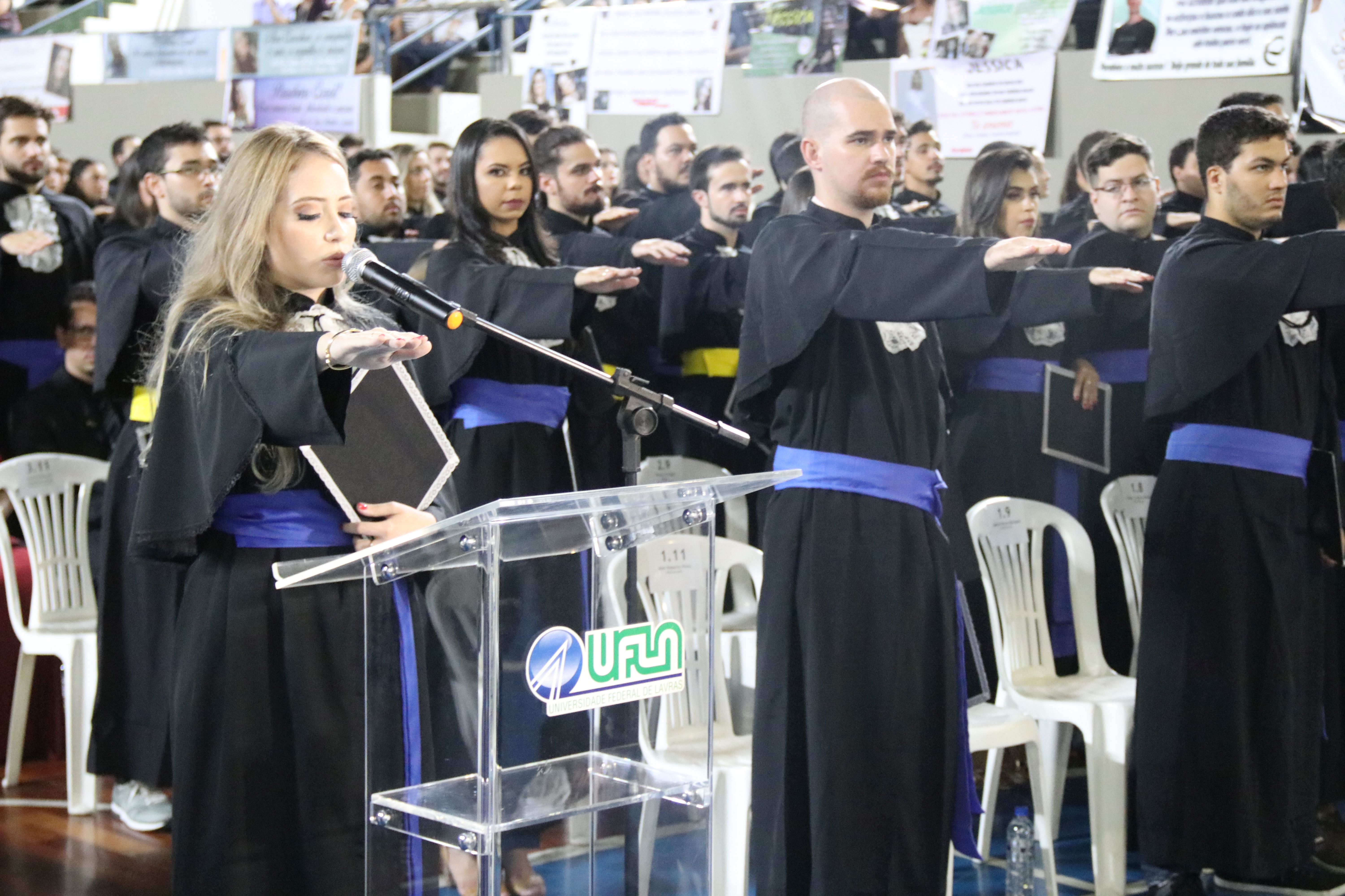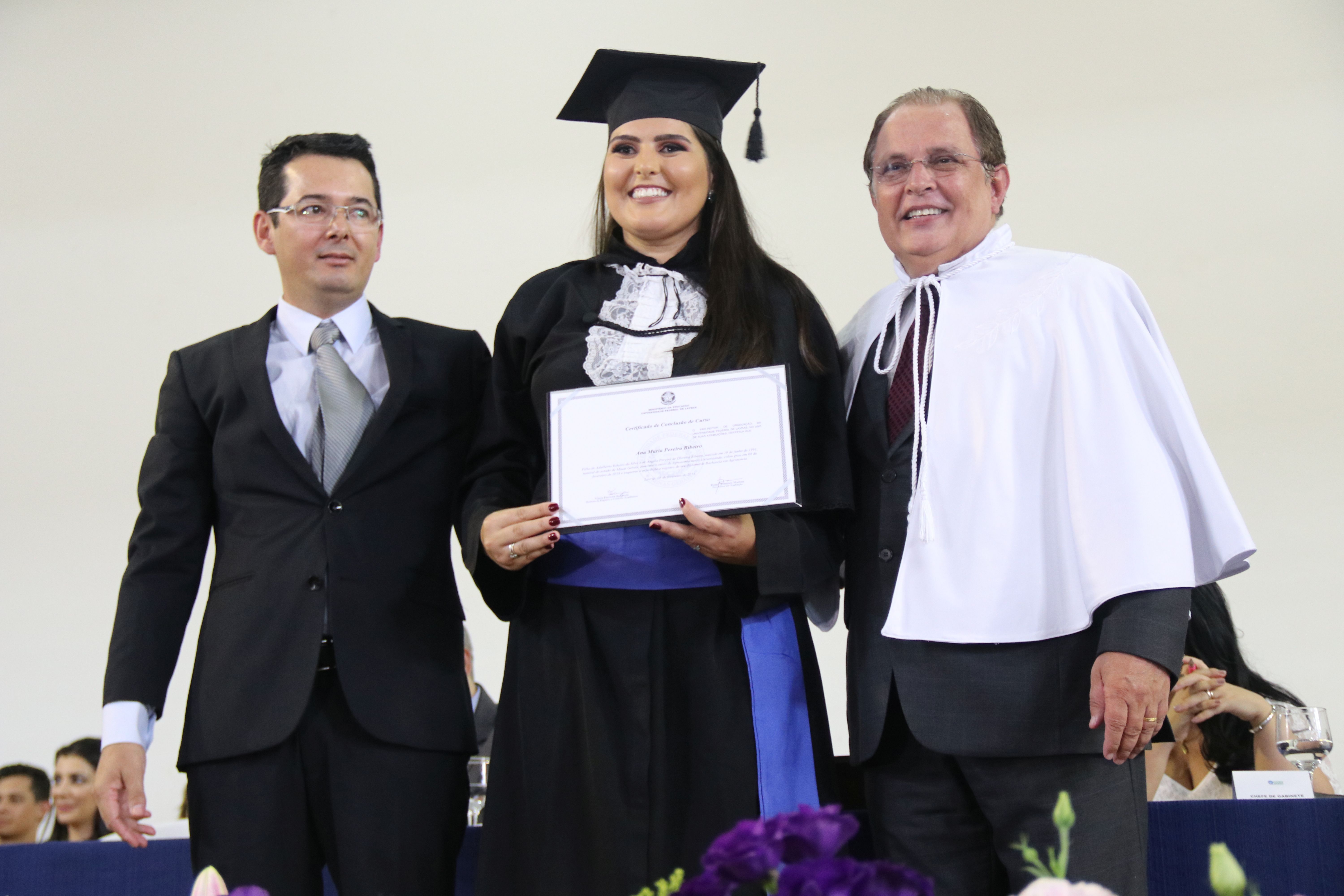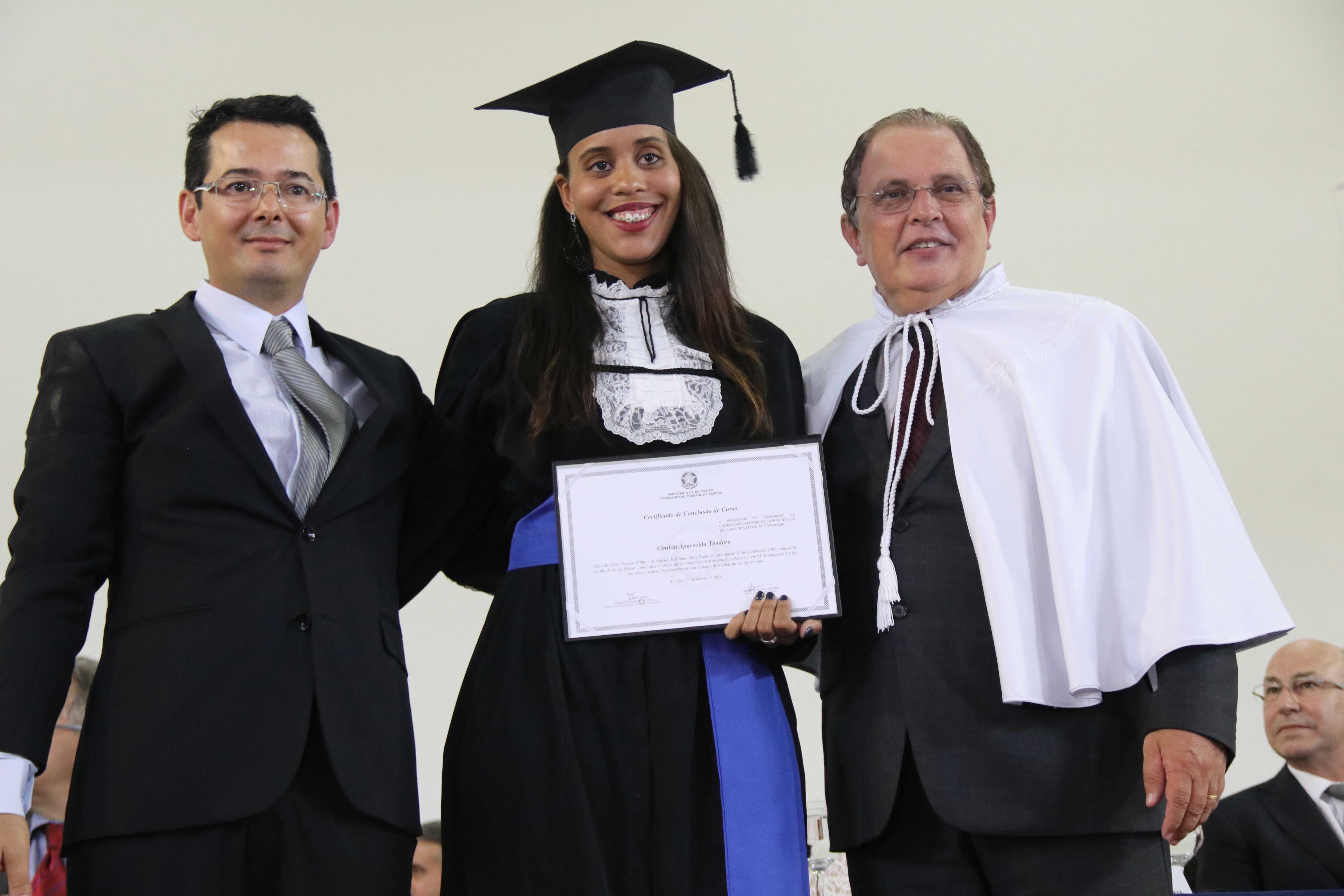As solenidades foram presididas pelo reitor e presidente do CUNI, professor José Roberto Soares Scolforo. Após fazer referência à tradução das cerimônias na Língua Brasileira de Sinais (Libras), manifestou orgulho pelo fato de a UFLA trabalhar primando pela inclusão e pelo respeito às diversidades. Para os formandos, reforçou a importância do juramento que fizeram, especialmente pelo compromisso com a ética, a justiça e a defesa da liberdade e da paz. “Vocês tiveram a felicidade de se formar sob o investimento do povo brasileiro. Por isso devem se empenhar em cumprir esses compromissos carregados de valores que são hoje tão necessários à sociedade brasileira”. Scolforo também incentivou os novos profissionais a seguirem em frente: “vençam o medo deste momento posterior à conclusão do curso e lutem, busquem alcançar seus sonhos, sejam cidadãos de valor, pratiquem solidariedade e continuem a caminhada com garra e persistência, sempre respeitando as diferenças”.