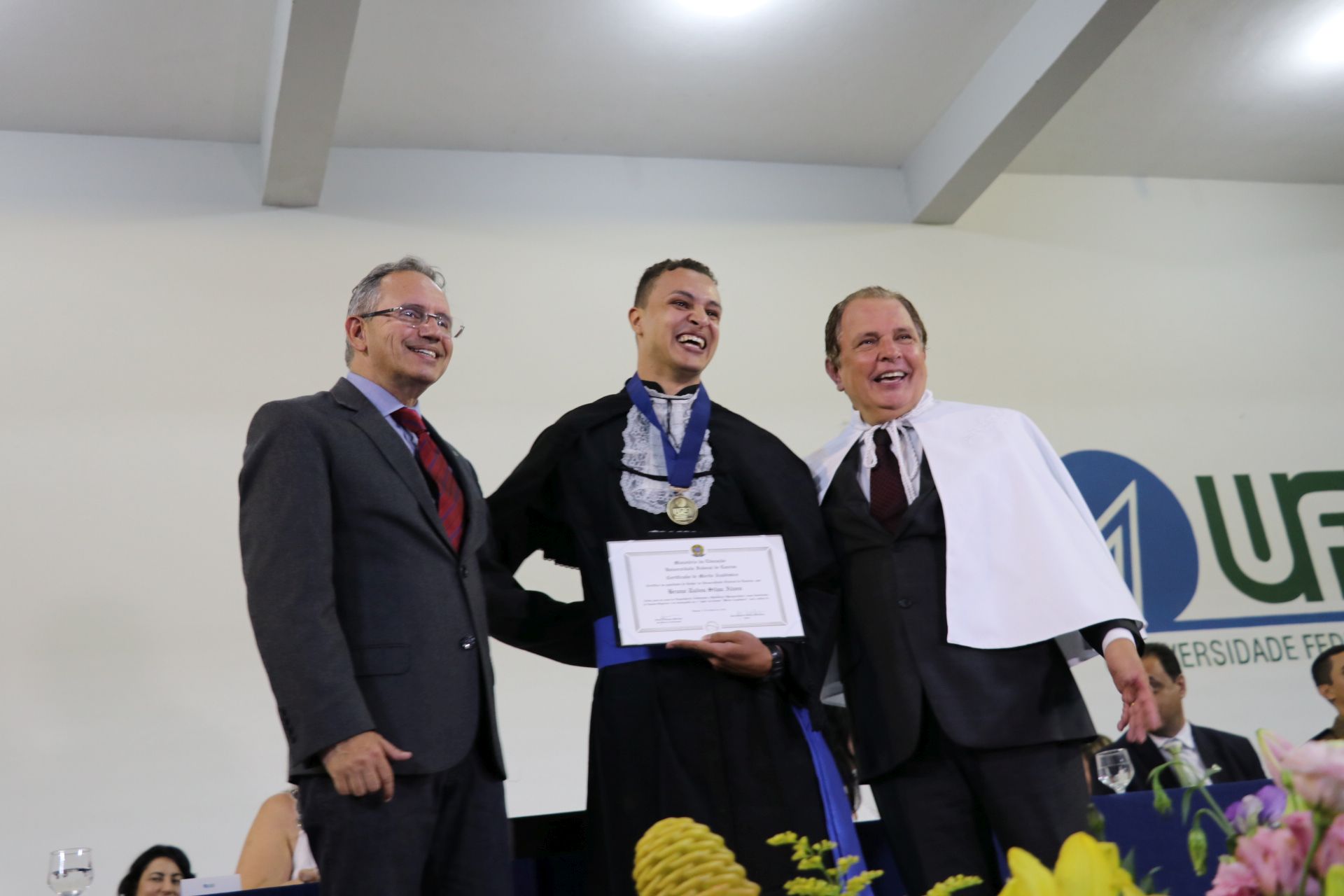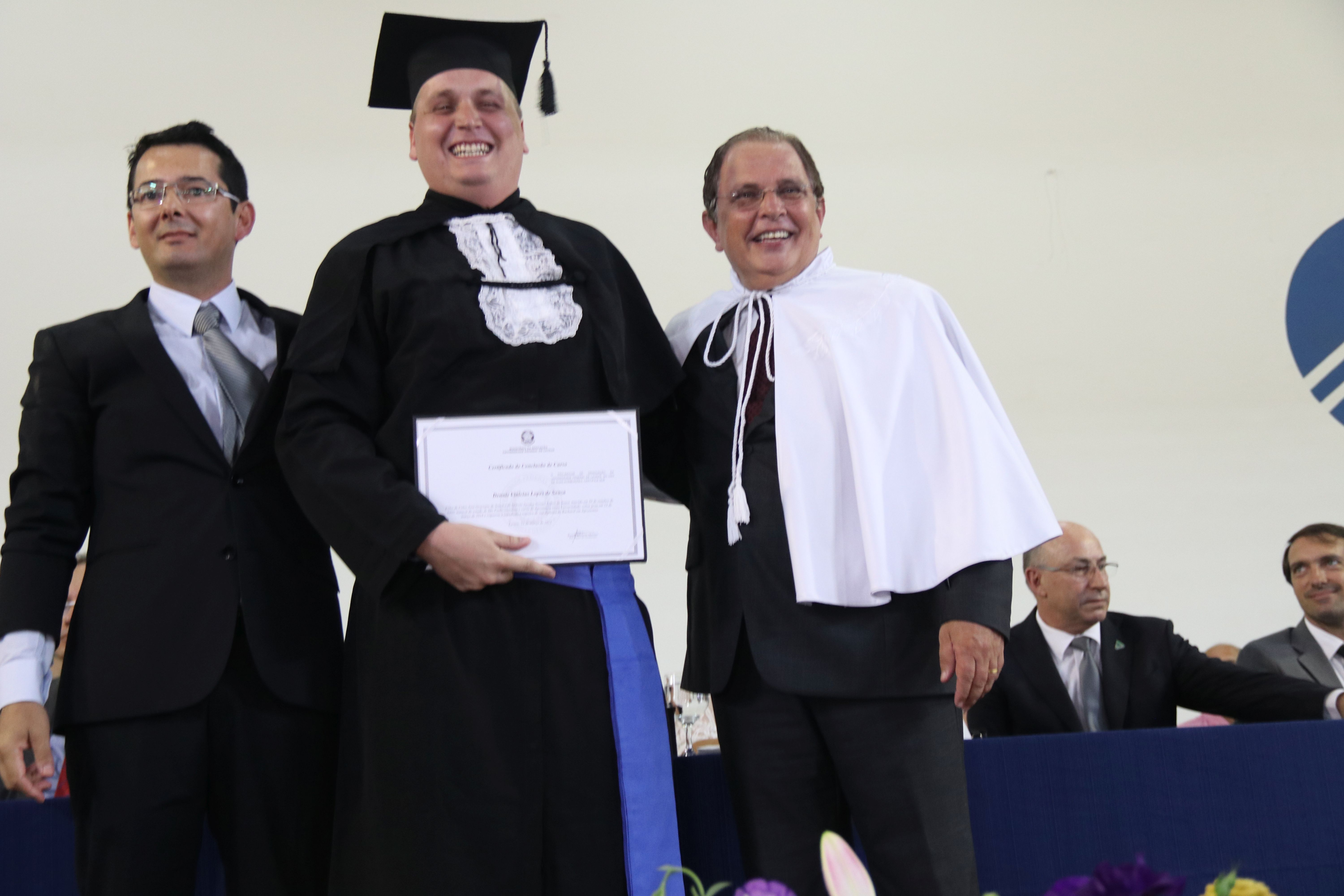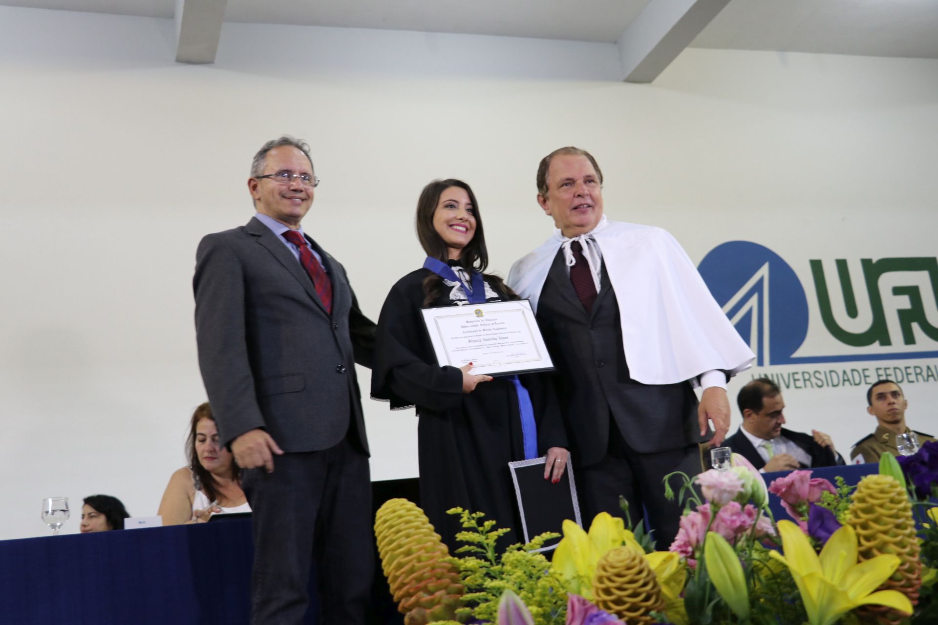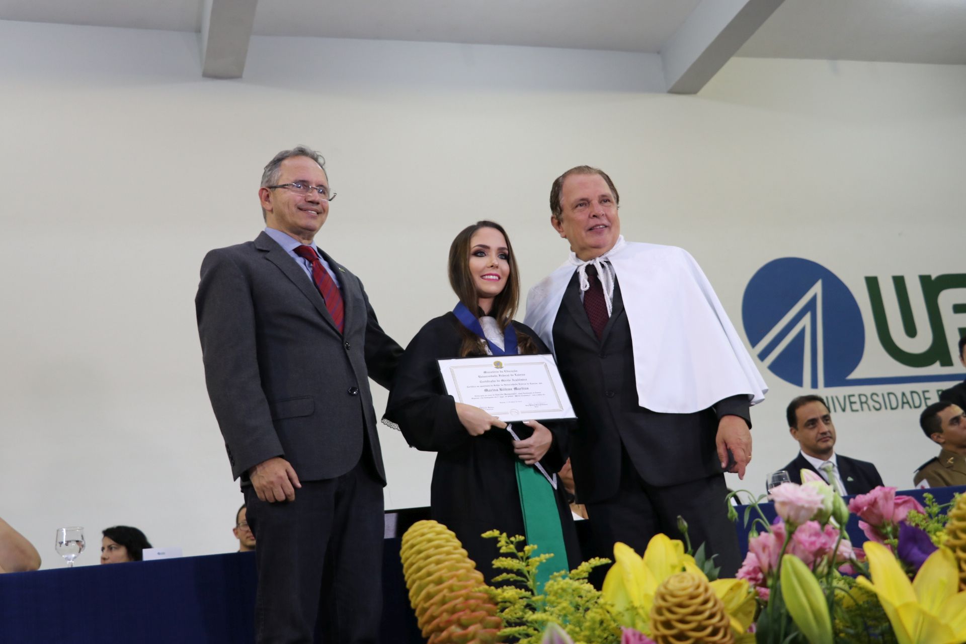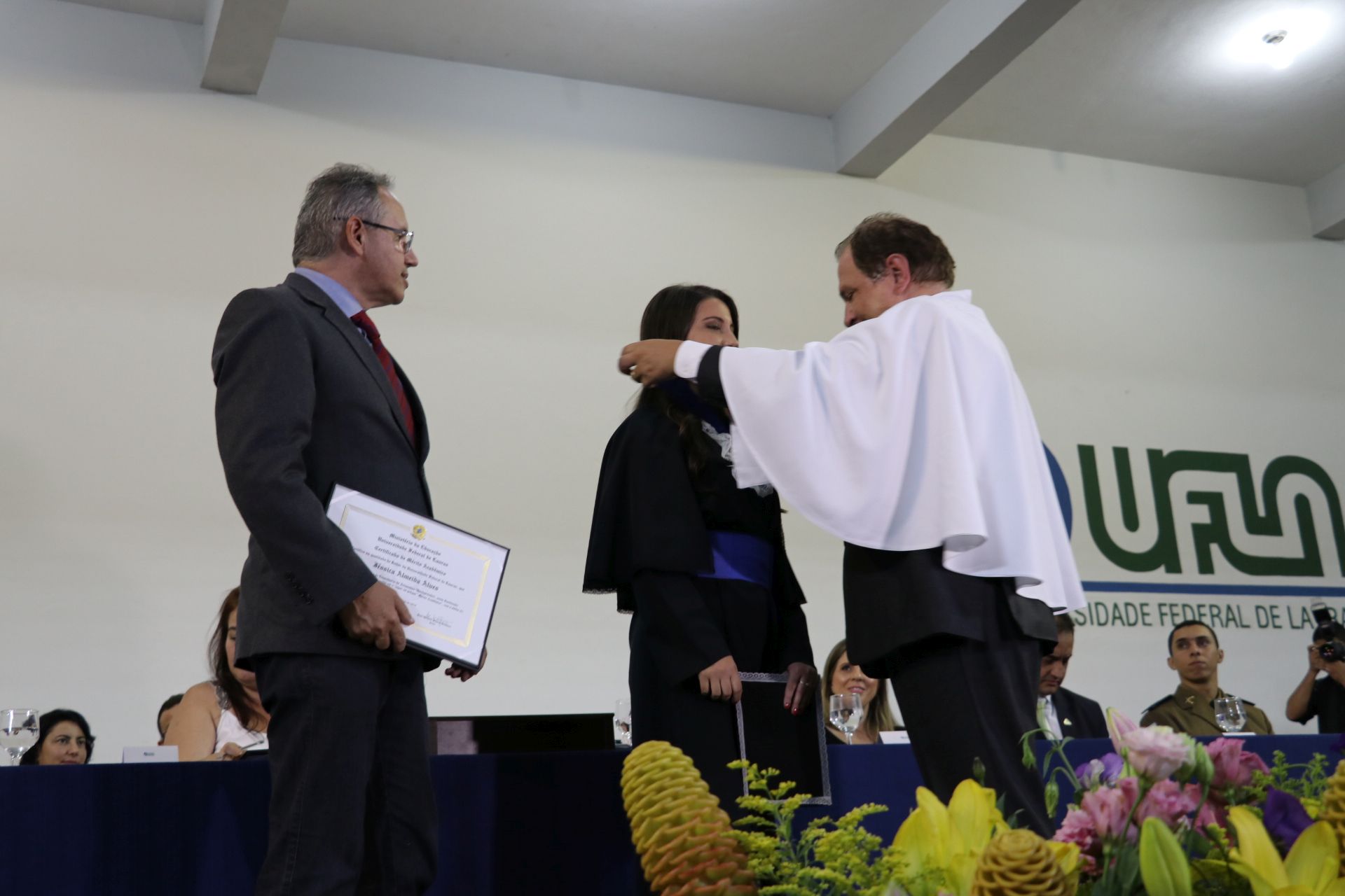 As solenidades foram presididas pelo reitor e presidente do CUNI, professor José Roberto Soares Scolforo. Após fazer referência à tradução das cerimônias na Língua Brasileira de Sinais (Libras), manifestou orgulho pelo fato de a UFLA trabalhar primando pela inclusão e pelo respeito às diversidades. Para os formandos, reforçou a importância do juramento que fizeram, especialmente pelo compromisso com a ética, a justiça e a defesa da liberdade e da paz. “Vocês tiveram a felicidade de se formar sob o investimento do povo brasileiro. Por isso devem se empenhar em cumprir esses compromissos carregados de valores que são hoje tão necessários à sociedade brasileira”. Scolforo também incentivou os novos profissionais a seguirem em frente: “vençam o medo deste momento posterior à conclusão do curso e lutem, busquem alcançar seus sonhos, sejam cidadãos de valor, pratiquem solidariedade e continuem a caminhada com garra e persistência, sempre respeitando as diferenças”.