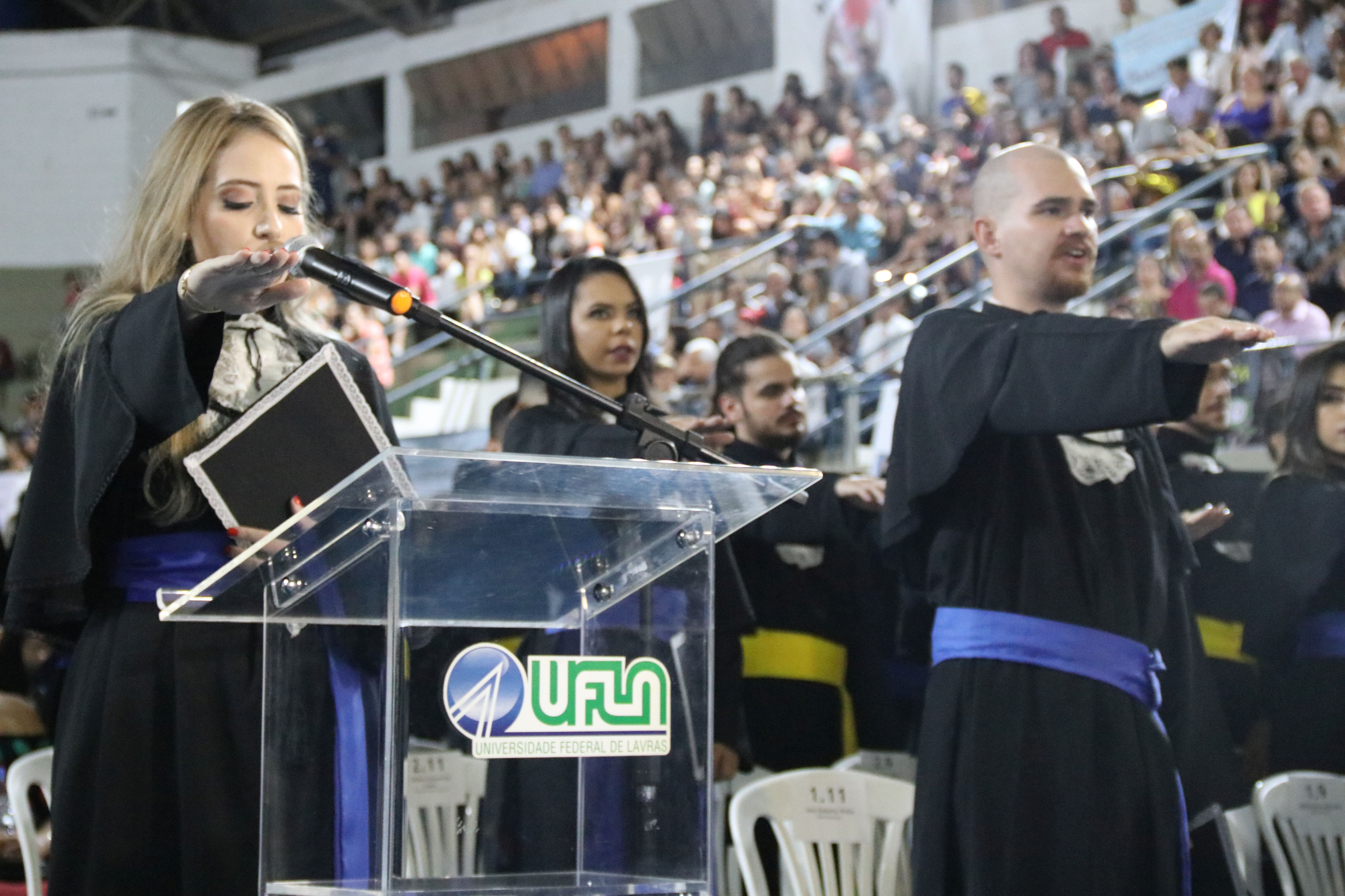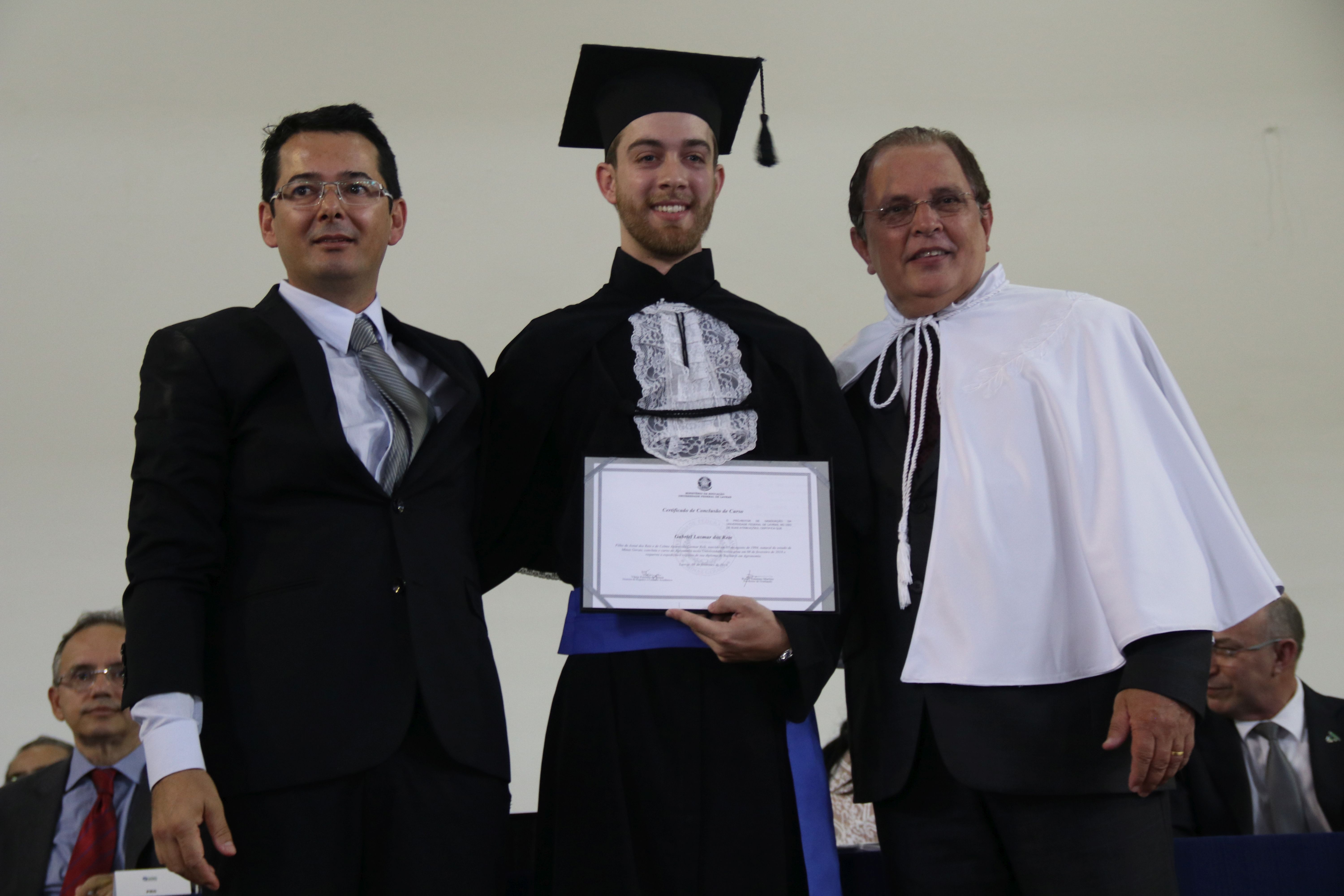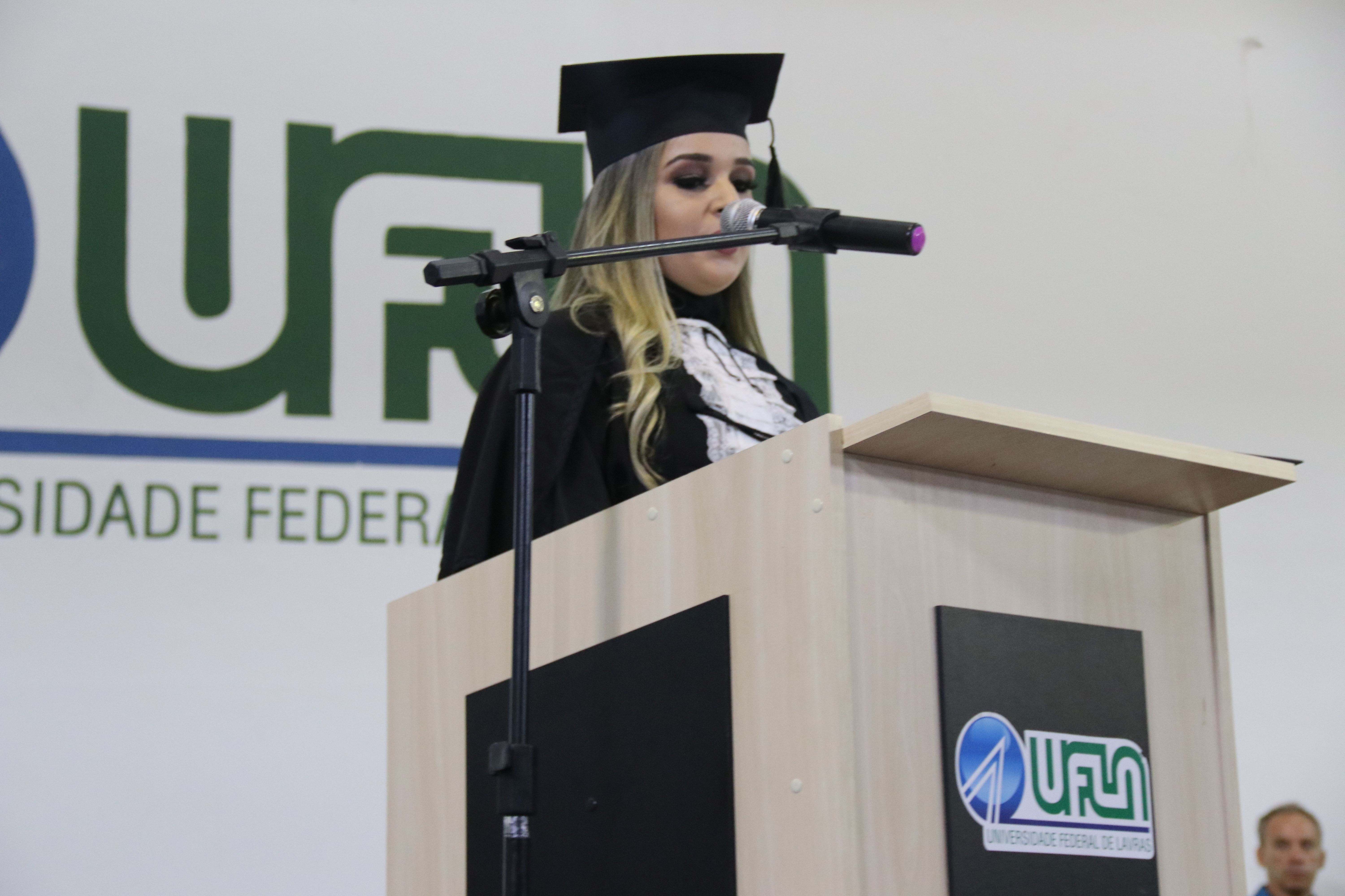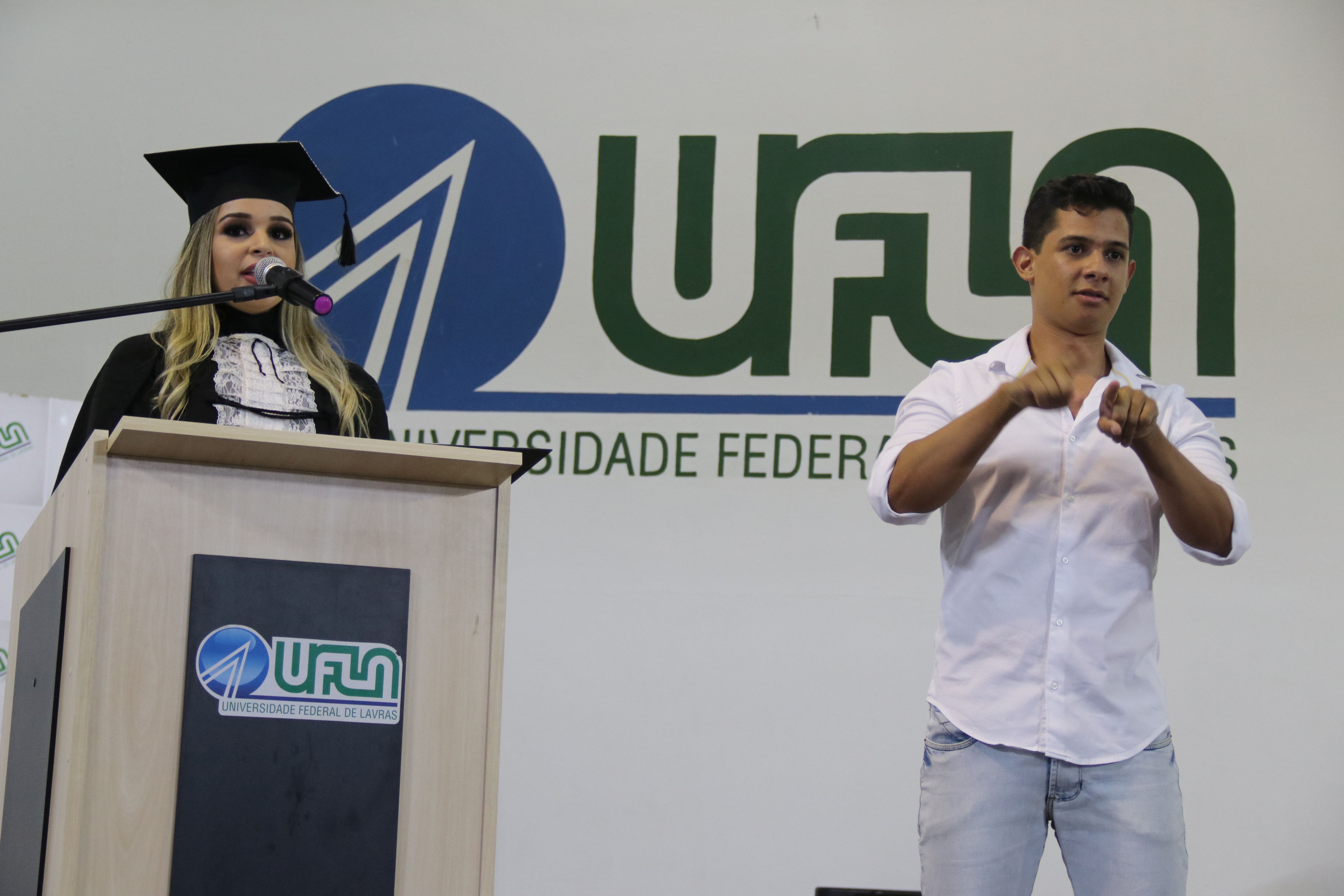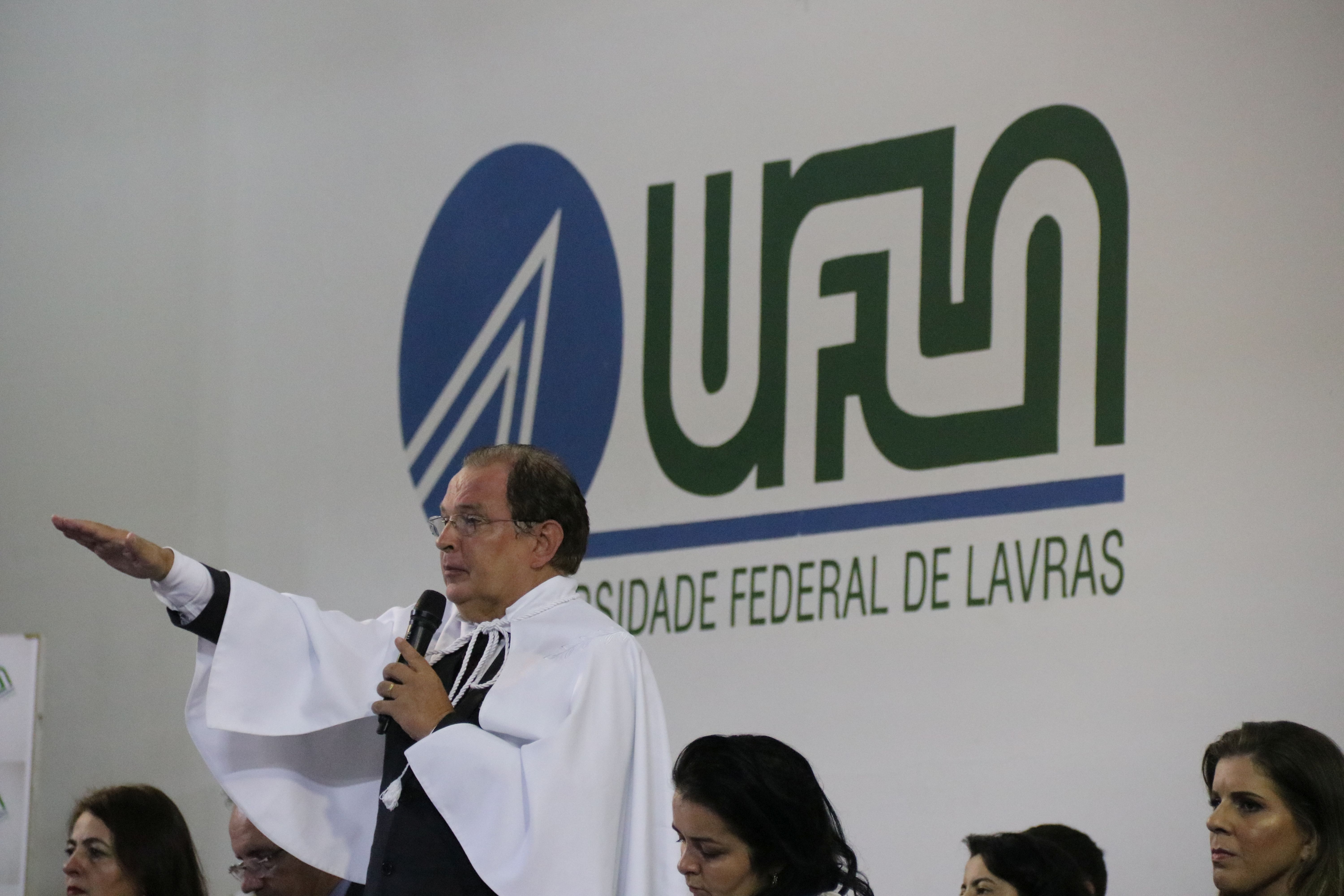 As solenidades foram presididas pelo reitor e presidente do CUNI, professor José Roberto Soares Scolforo. Após fazer referência à tradução das cerimônias na Língua Brasileira de Sinais (Libras), manifestou orgulho pelo fato de a UFLA trabalhar primando pela inclusão e pelo respeito às diversidades. Para os formandos, reforçou a importância do juramento que fizeram, especialmente pelo compromisso com a ética, a justiça e a defesa da liberdade e da paz. “Vocês tiveram a felicidade de se formar sob o investimento do povo brasileiro. Por isso devem se empenhar em cumprir esses compromissos carregados de valores que são hoje tão necessários à sociedade brasileira”. Scolforo também incentivou os novos profissionais a seguirem em frente: “vençam o medo deste momento posterior à conclusão do curso e lutem, busquem alcançar seus sonhos, sejam cidadãos de valor, pratiquem solidariedade e continuem a caminhada com garra e persistência, sempre respeitando as diferenças”.