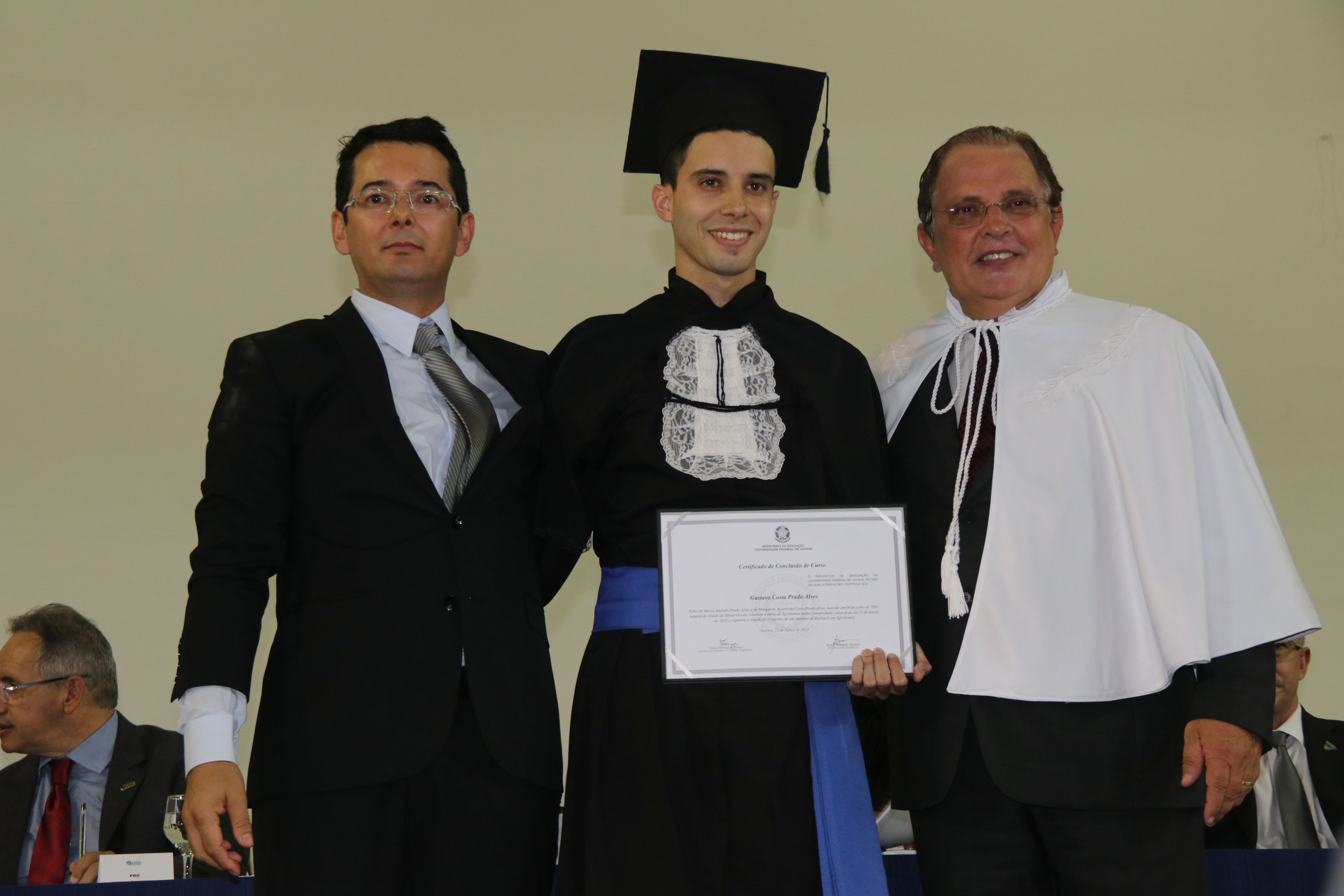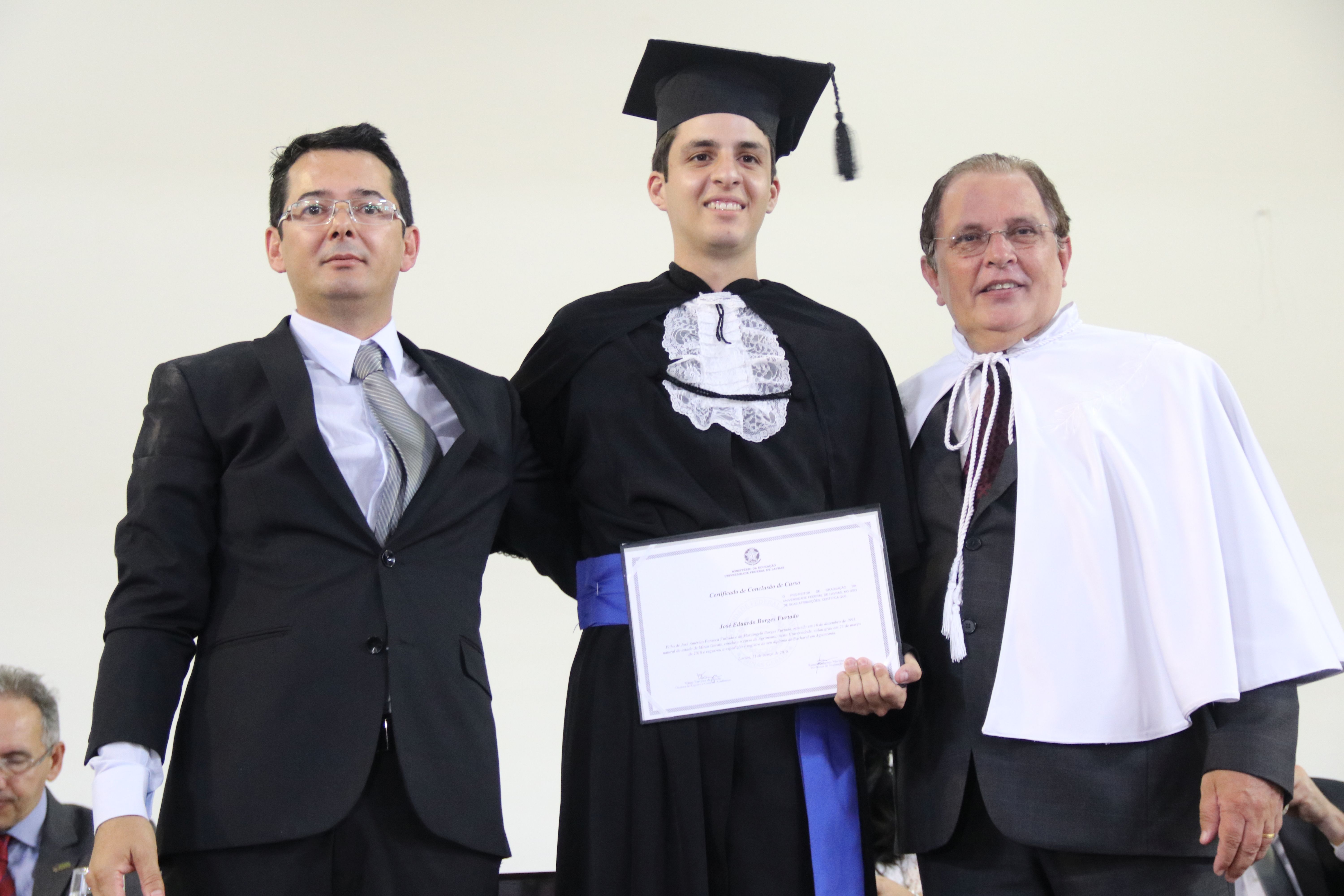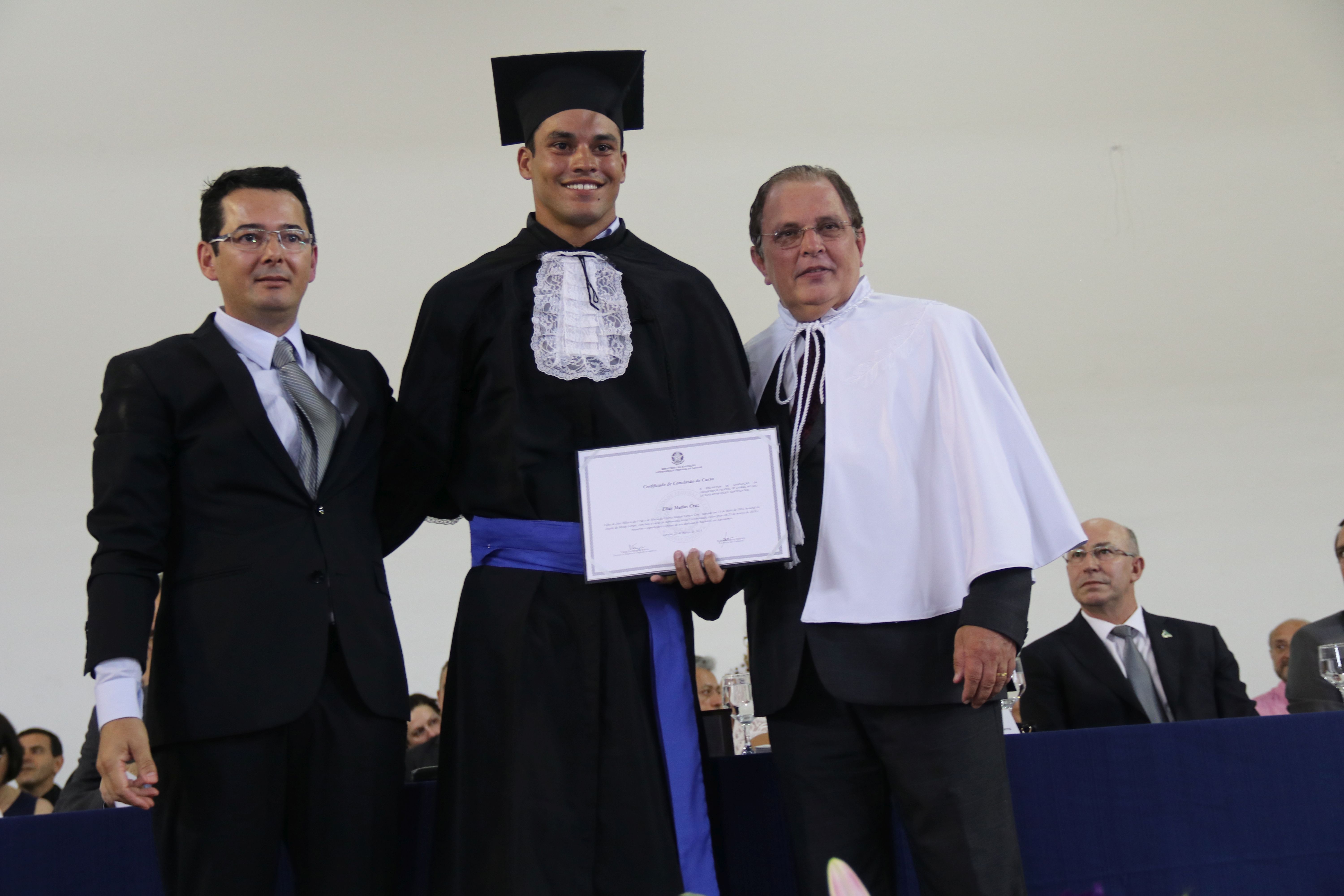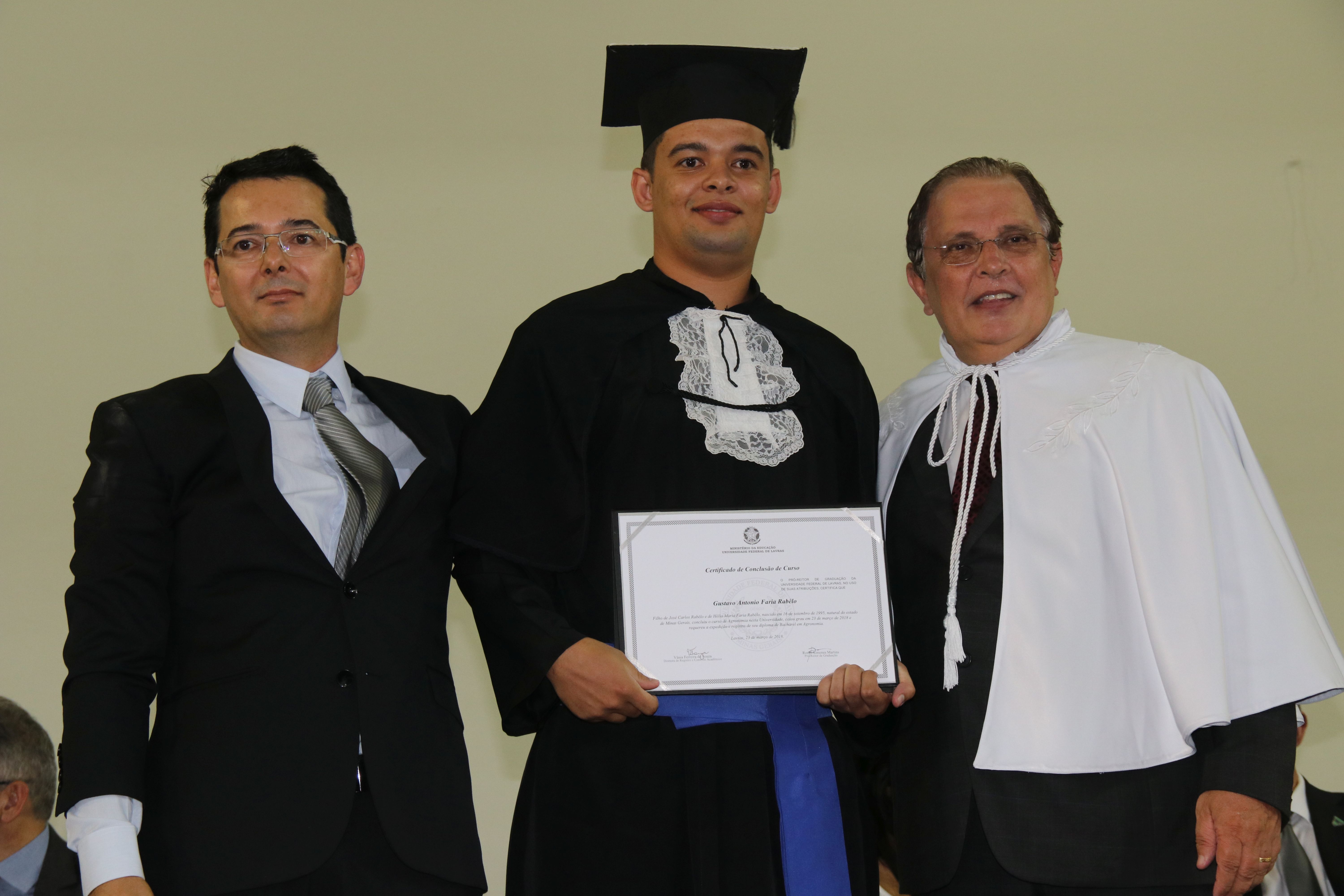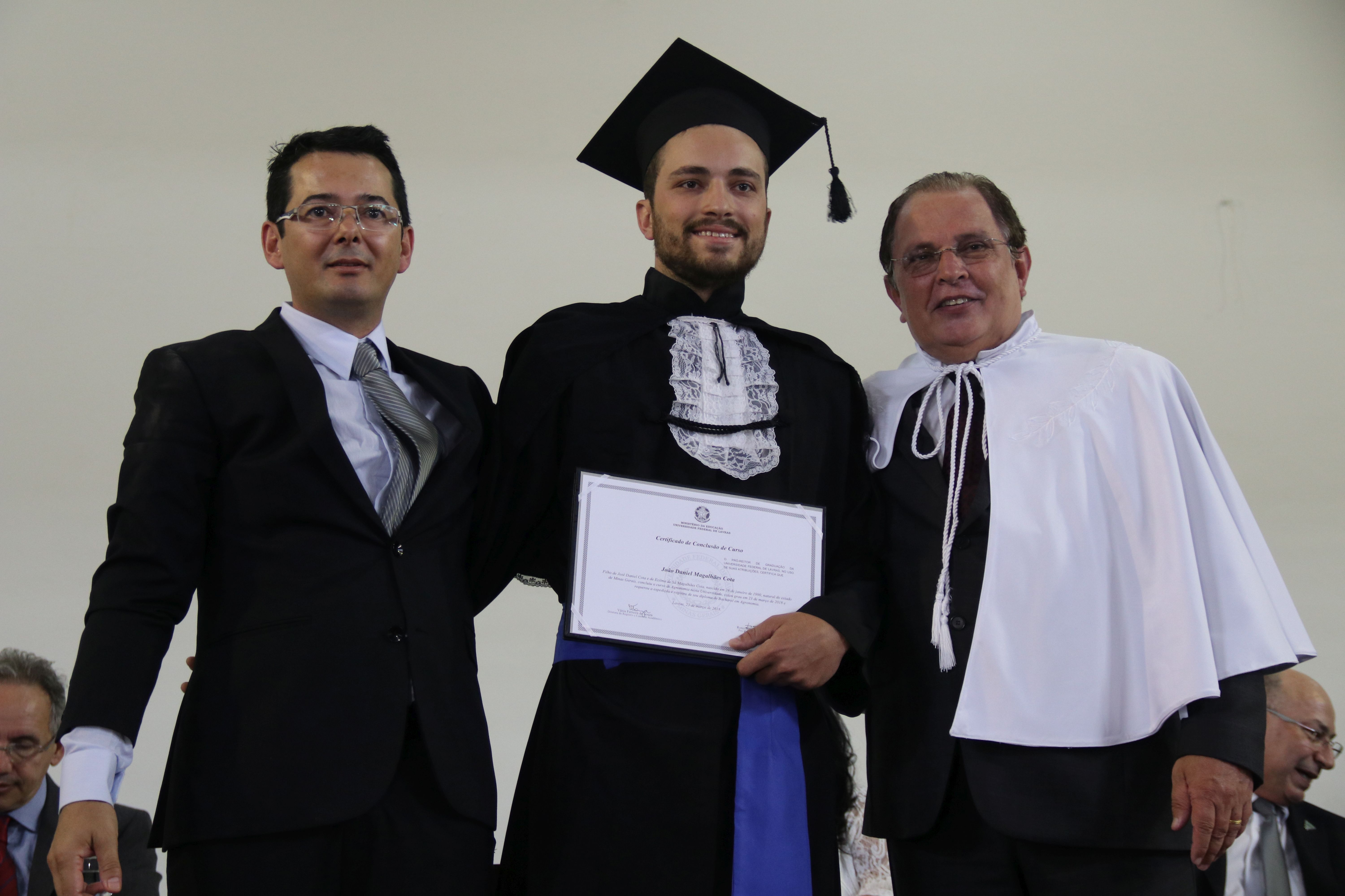 As solenidades foram presididas pelo reitor e presidente do CUNI, professor José Roberto Soares Scolforo. Após fazer referência à tradução das cerimônias na Língua Brasileira de Sinais (Libras), manifestou orgulho pelo fato de a UFLA trabalhar primando pela inclusão e pelo respeito às diversidades. Para os formandos, reforçou a importância do juramento que fizeram, especialmente pelo compromisso com a ética, a justiça e a defesa da liberdade e da paz. “Vocês tiveram a felicidade de se formar sob o investimento do povo brasileiro. Por isso devem se empenhar em cumprir esses compromissos carregados de valores que são hoje tão necessários à sociedade brasileira”. Scolforo também incentivou os novos profissionais a seguirem em frente: “vençam o medo deste momento posterior à conclusão do curso e lutem, busquem alcançar seus sonhos, sejam cidadãos de valor, pratiquem solidariedade e continuem a caminhada com garra e persistência, sempre respeitando as diferenças”.