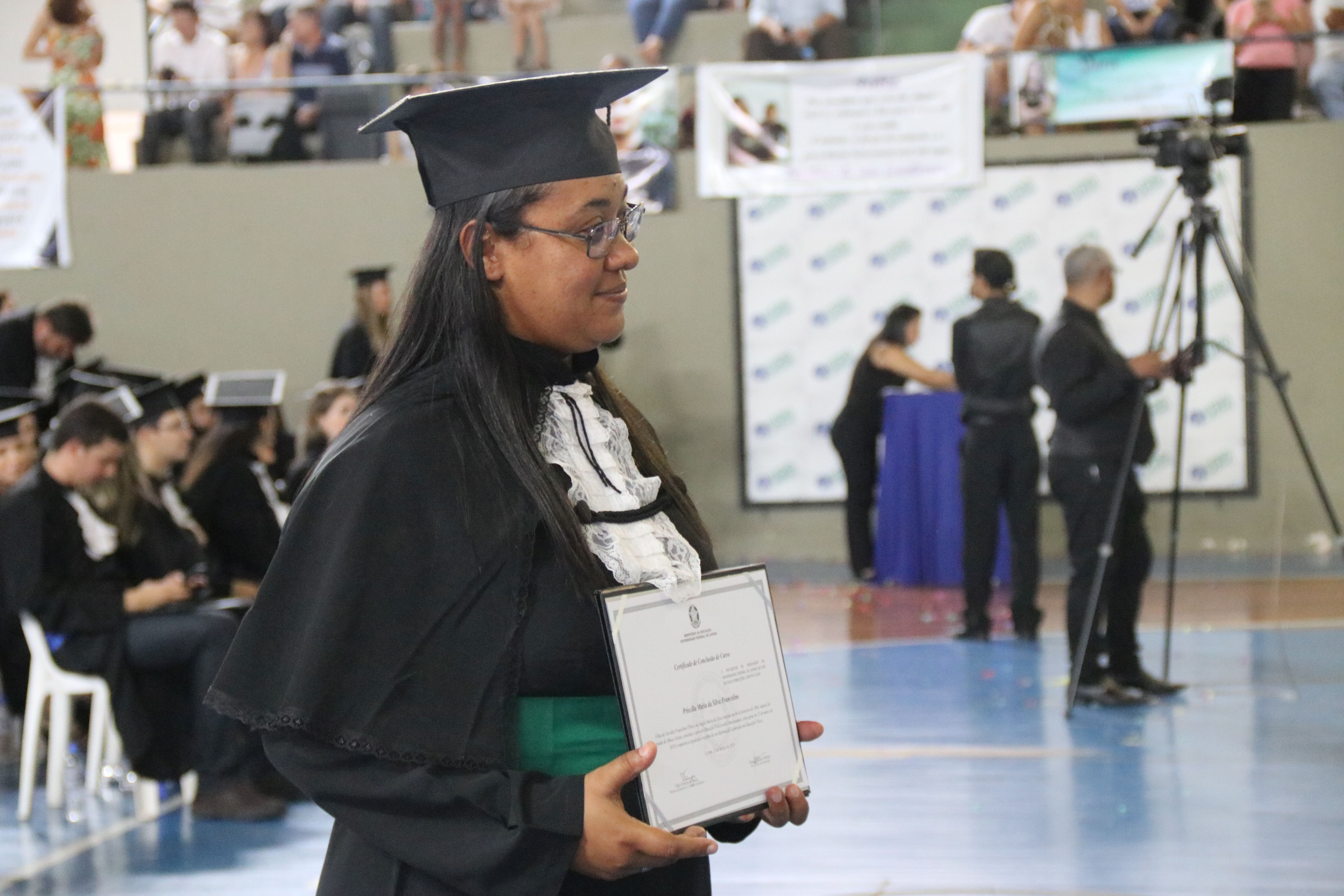 Se o momento é de tanta emoção para formados e familiares, foi ainda mais especial para quem precisou de uma dose a mais de esforço para concluir o curso. Exemplo de superação, a formanda em Educação Física Priscilla Maria da Silva Francelino, que possui Necessidades Educacionais Especiais (NEE), comemorou a conquista do diploma. “Muitas vezes, diante das dificuldades, eu me perguntei por que estava investindo nesse projeto, mas valeu a pena o sacrifício. Agora quero atuar em escolas, não importa se no ensino fundamental ou médio”. Priscilla Maria da Silva Francelino tem Transtorno de Déficit de Atenção (TDA), autismo leve e um pouco de perda de audição. A estrutura inicial do Núcleo de Acessibilidade da UFLA, e mais tarde a Coordenadoria de Acessibilidade, deram o apoio que Priscila precisava para avançar nos estudos. “Esse apoio – com monitores, tempo diferenciado para realização das atividades e outros planejamentos – fez toda a diferença”, disse.