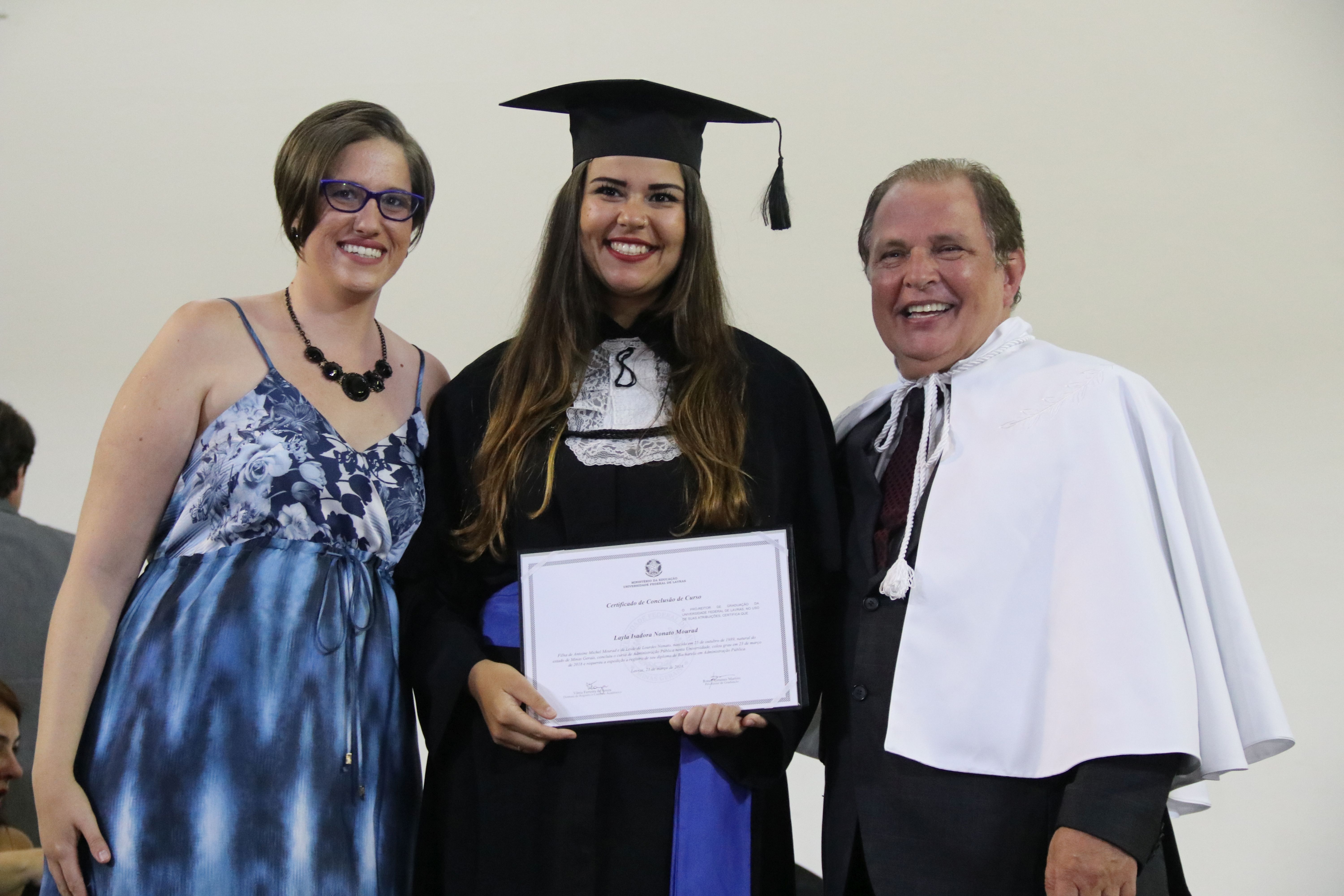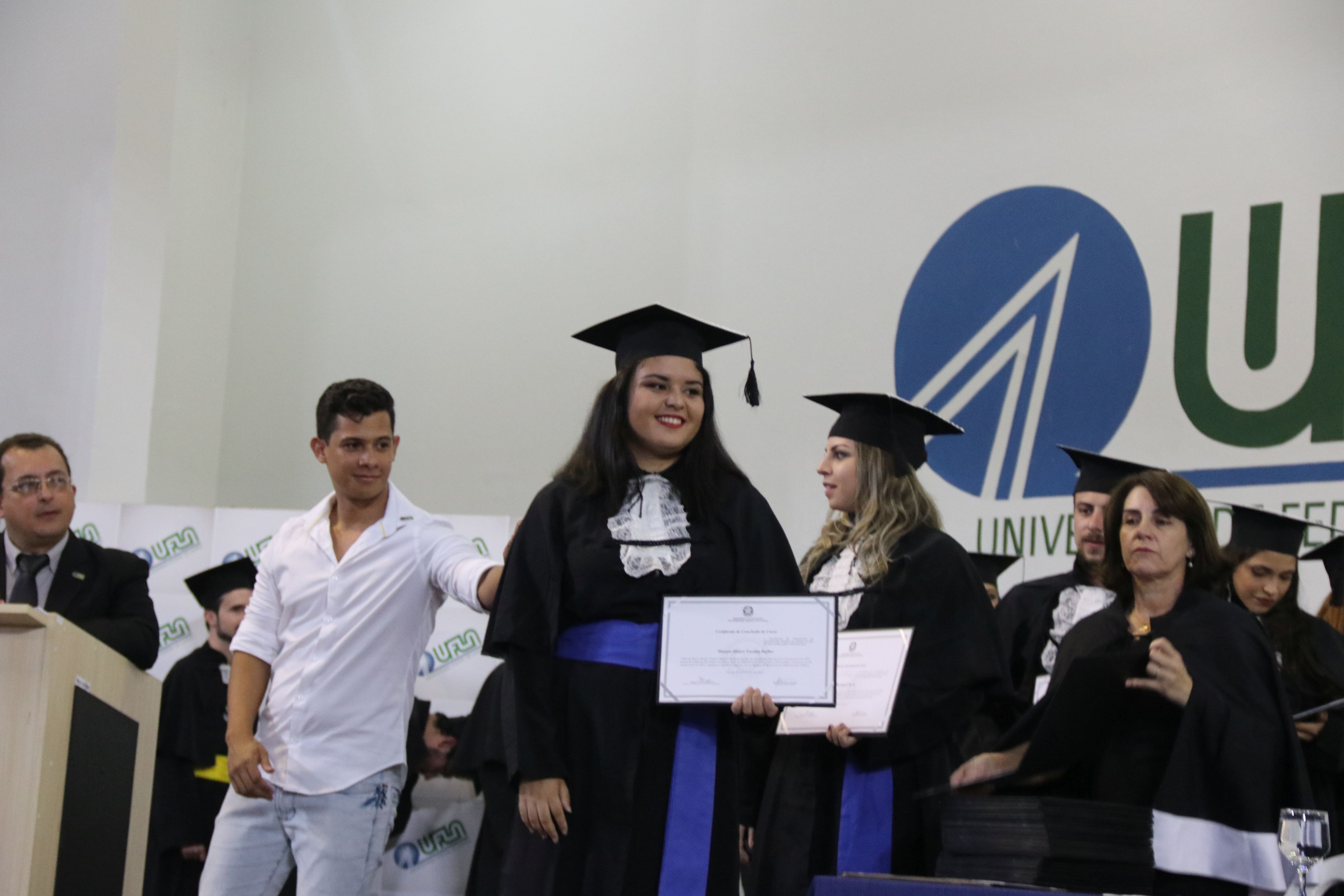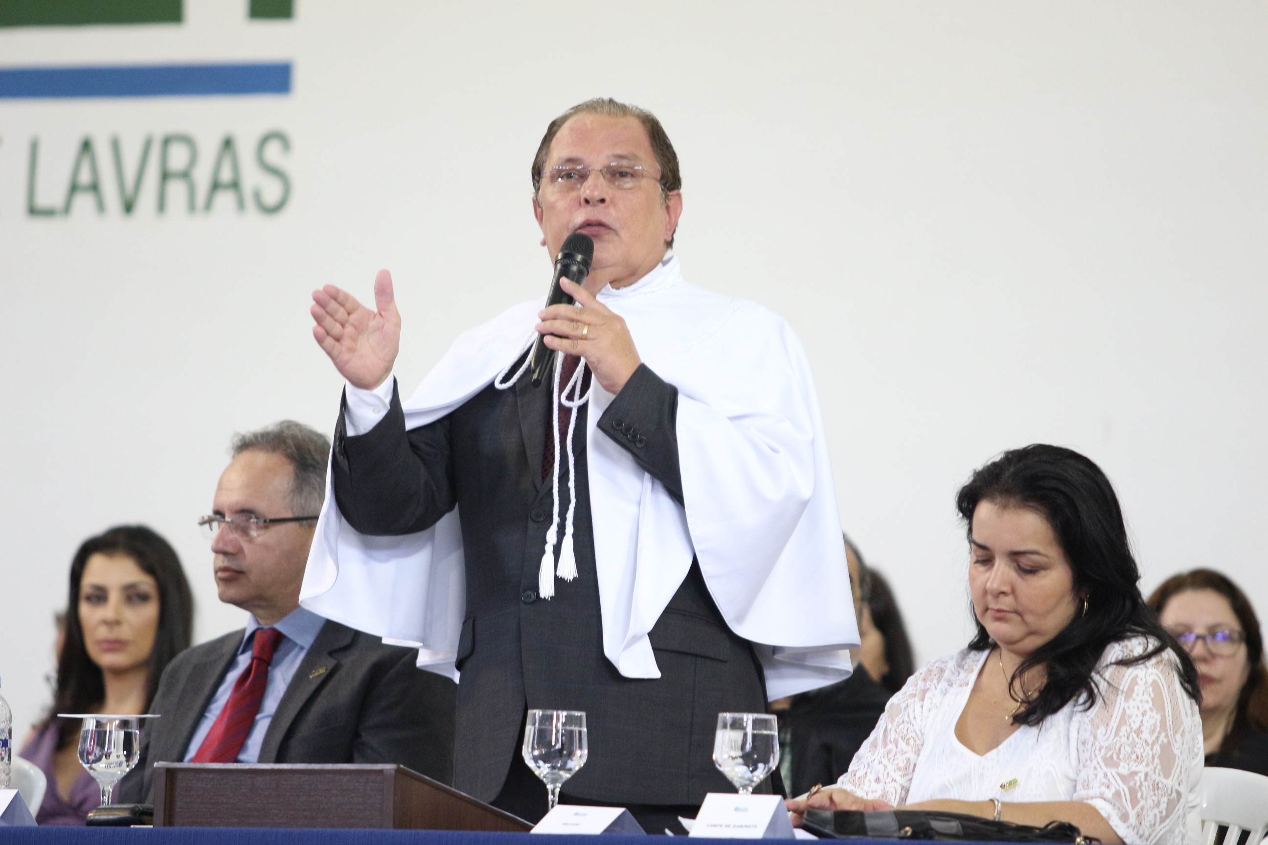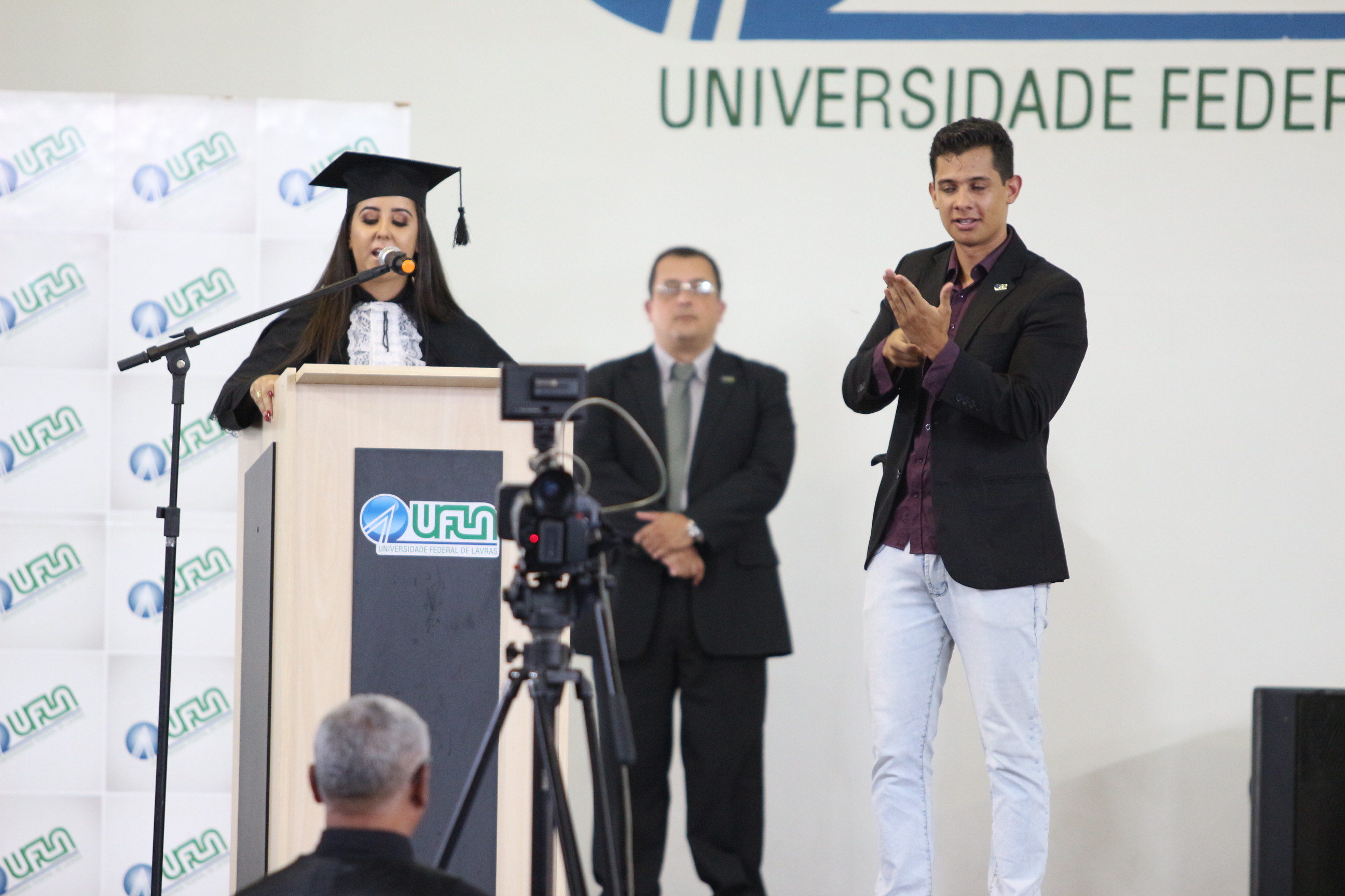 As solenidades foram presididas pelo reitor e presidente do CUNI, professor José Roberto Soares Scolforo. Após fazer referência à tradução das cerimônias na Língua Brasileira de Sinais (Libras), manifestou orgulho pelo fato de a UFLA trabalhar primando pela inclusão e pelo respeito às diversidades. Para os formandos, reforçou a importância do juramento que fizeram, especialmente pelo compromisso com a ética, a justiça e a defesa da liberdade e da paz. “Vocês tiveram a felicidade de se formar sob o investimento do povo brasileiro. Por isso devem se empenhar em cumprir esses compromissos carregados de valores que são hoje tão necessários à sociedade brasileira”. Scolforo também incentivou os novos profissionais a seguirem em frente: “vençam o medo deste momento posterior à conclusão do curso e lutem, busquem alcançar seus sonhos, sejam cidadãos de valor, pratiquem solidariedade e continuem a caminhada com garra e persistência, sempre respeitando as diferenças”.