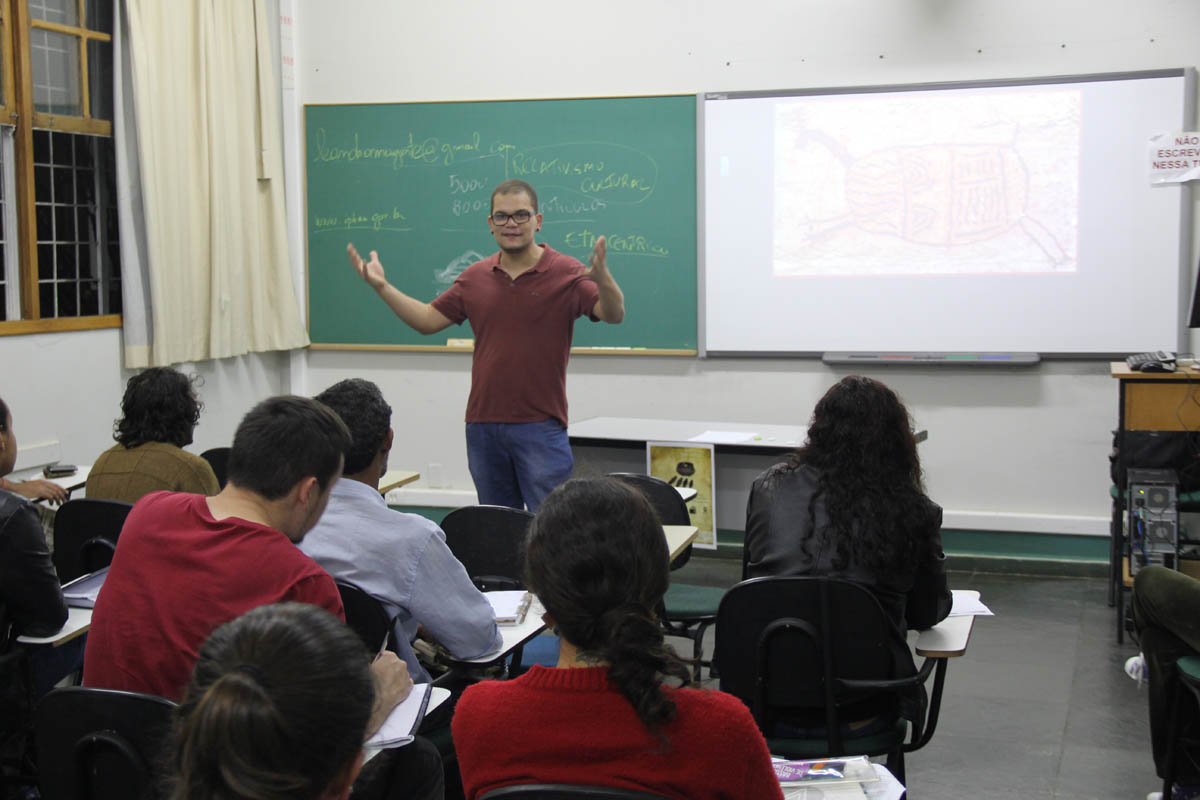 No primeiro dia, Leandro falou sobre conceitos básicos da Arqueologia, ciência que estuda os grupos humanos a partir dos vestígios das coisas que foram produzidas e manipuladas, tentando entender como viveram. Os espaços que contêm indícios de populações humanas são os sítios arqueológicos, estudados pelos profissionais da área. O material arqueológico como fonte de pesquisa e a relação da Arqueologia com outras disciplinas foram temas dos demais módulos.