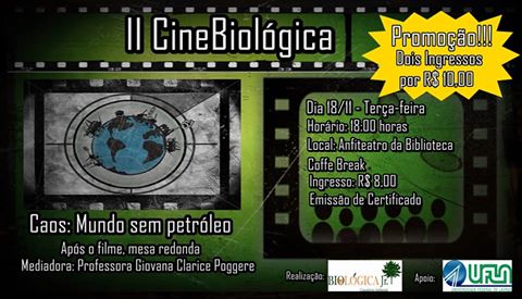 A Biológica Jr Consultoria Ambiental realizará nesta terça-feira, 18/11, a segunda edição do CineBiológica. Com início às 18 horas, o evento, no Anfiteatro da Biblioteca, será constituído pela exibição do documentário “Caos: Mundo sem petróleo”, seguido por uma mesa-redonda. Os professores Giovana Clarice Poggere e Yuri Lopes Zinn (DCS) serão os mediadores da discussão, acerca da influência econômica e ambiental do petróleo no planeta.