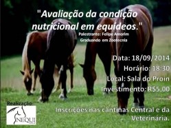 Já estão abertas as inscrições para o II Simpósio Mineiro de Equinocultura e o III Curso Teórico-prático sobre Treinamento do Cavalo Esportivo. Os eventos ocorrerão entre os dias 24 e 26 de novembro de 2016 e são organizados pelo Núcleo de Estudos em Equideocultura (Nequi), ligado ao Departamento de Zootecnia da Universidade Federal de Lavras (DZO/UFLA).