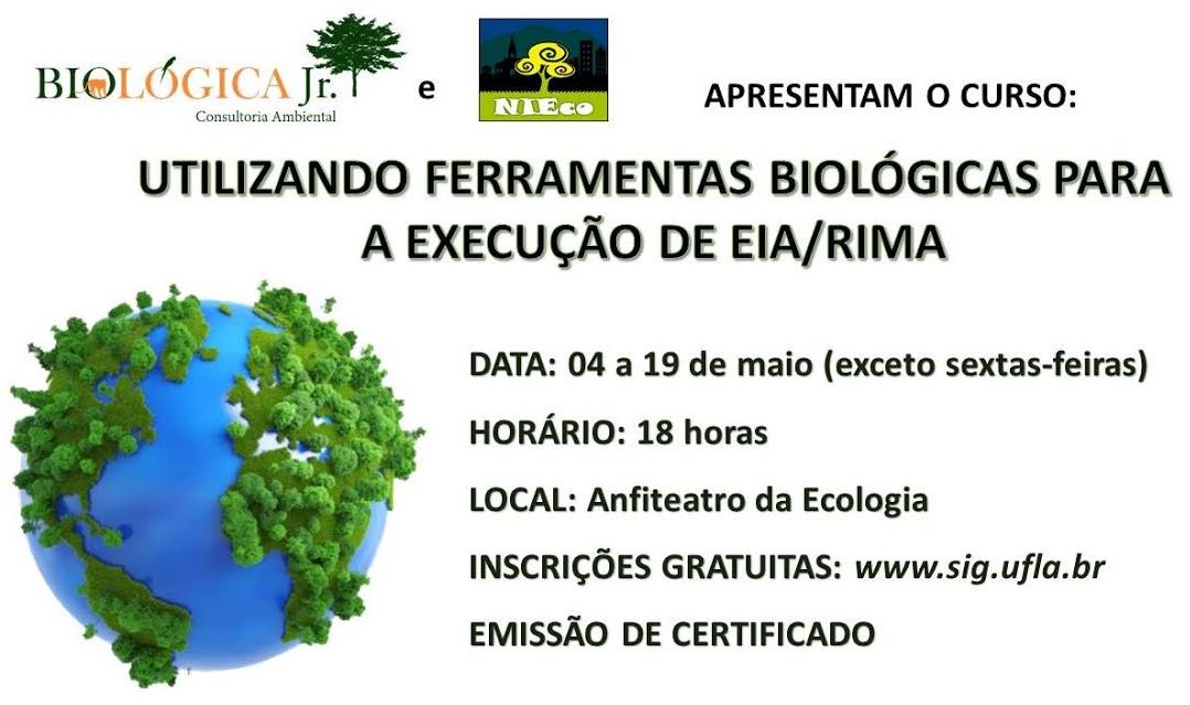 Em 4/5 terá início na Universidade Federal de Lavras (UFLA) o curso “Utilizando Ferramentas Biológicas para a Execução de EIA/RIMA”. Graduandos e pós-graduandos interessados no tema, assim como profissionais da área, poderão se inscrever a partir de segunda-feira (6/4) por este link.
