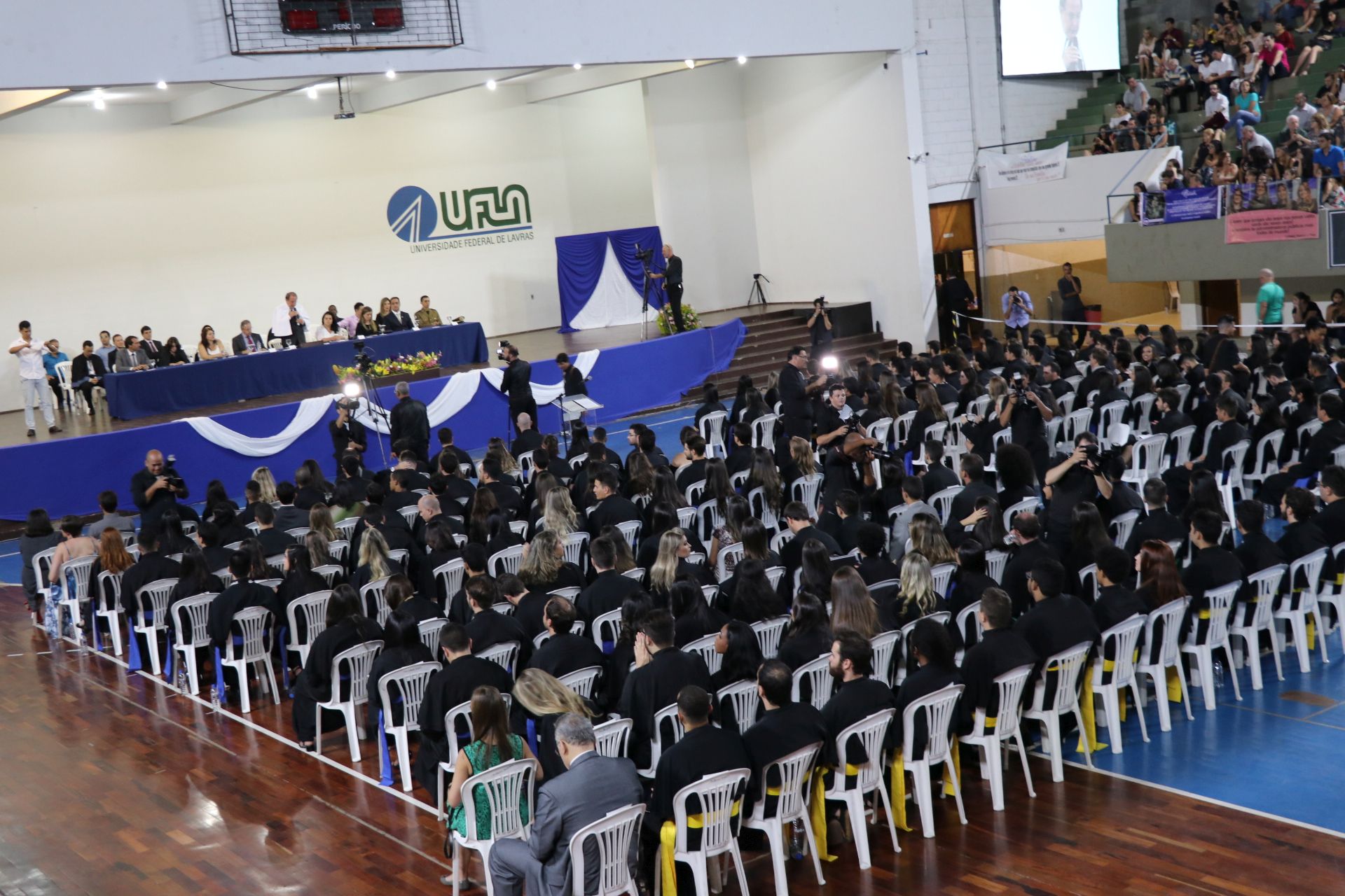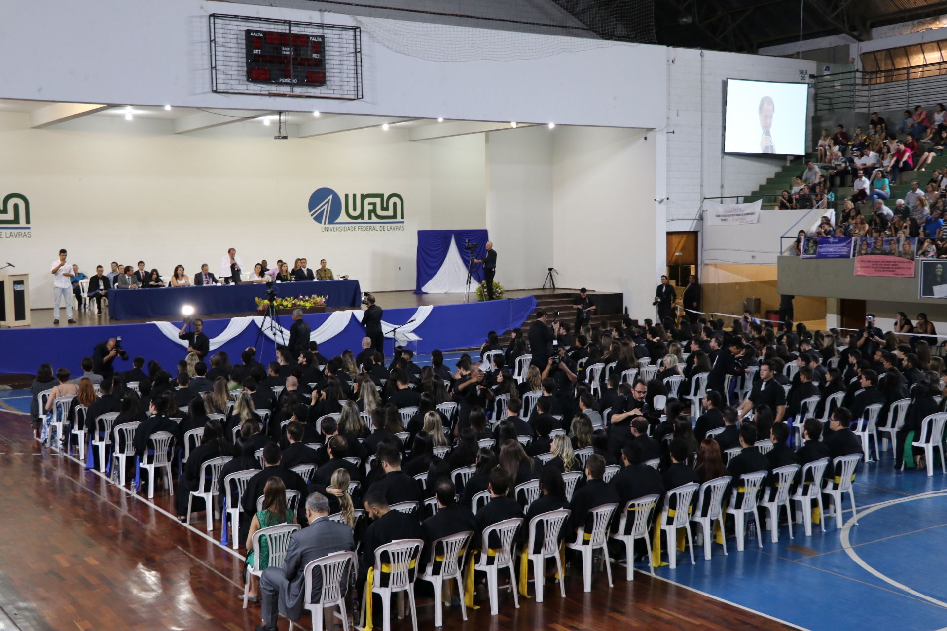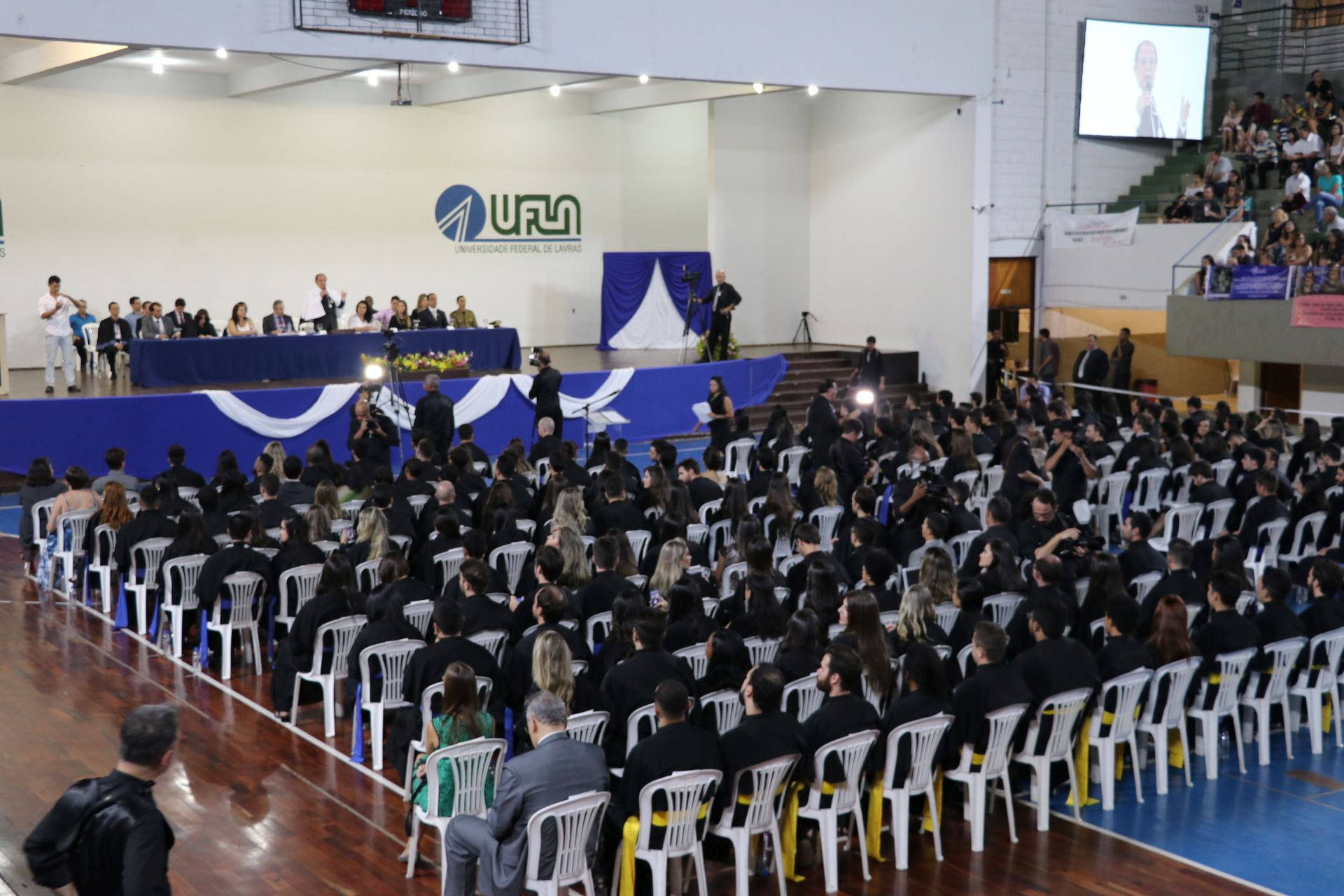 A sexta-feira (23/3) foi de celebração para a Universidade Federal de Lavras (UFLA) e para os 464 formandos que colaram grau durante sessão solene do Conselho Universitário (CUNI). A cerimônia foi realizada no ginásio poliesportivo da instituição, em dois horários – às 14h e às 18h. A outorga de grau garantiu o ingresso no mercado de trabalho de profissionais que concluíram sua formação em 24 cursos.