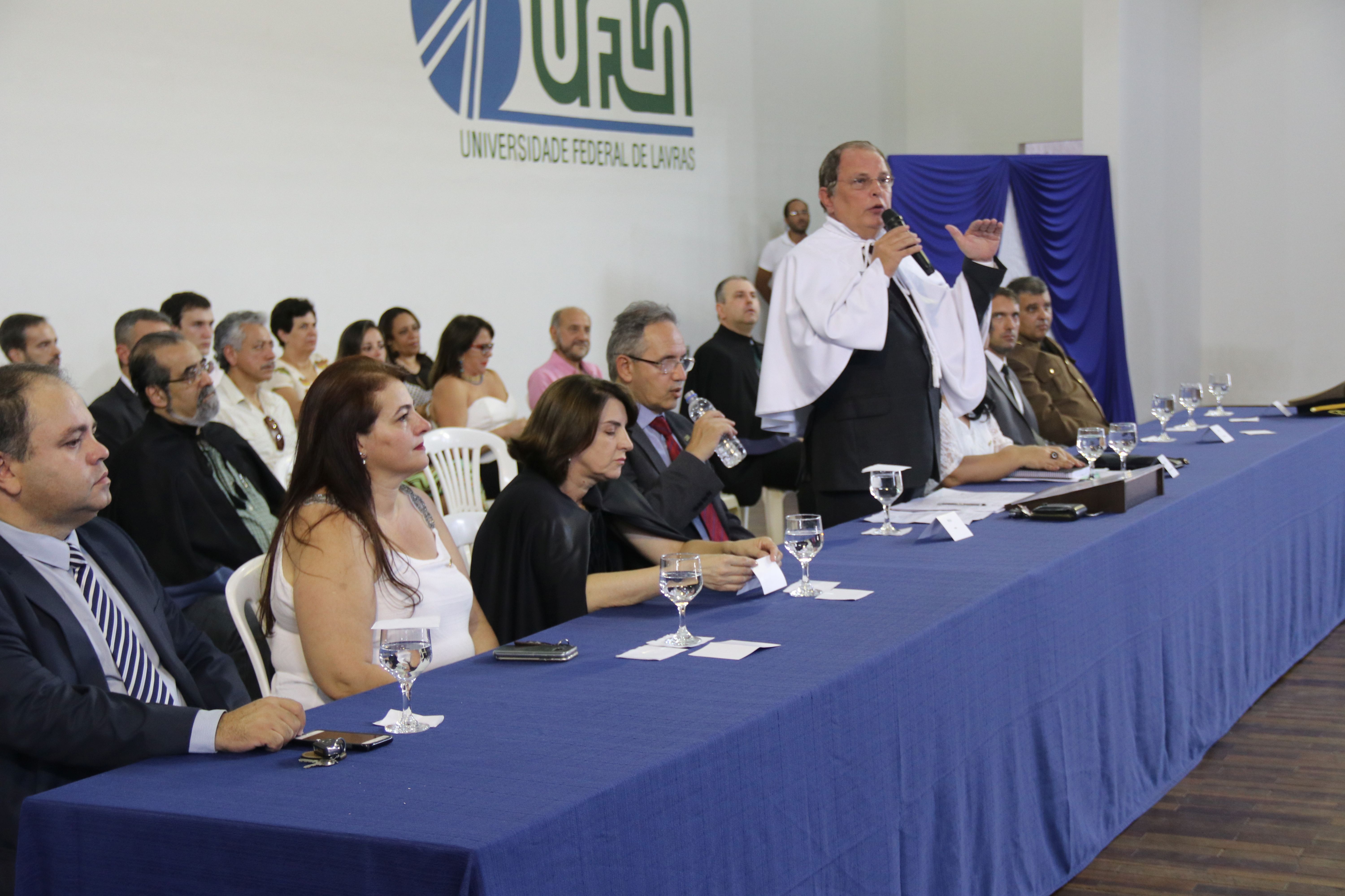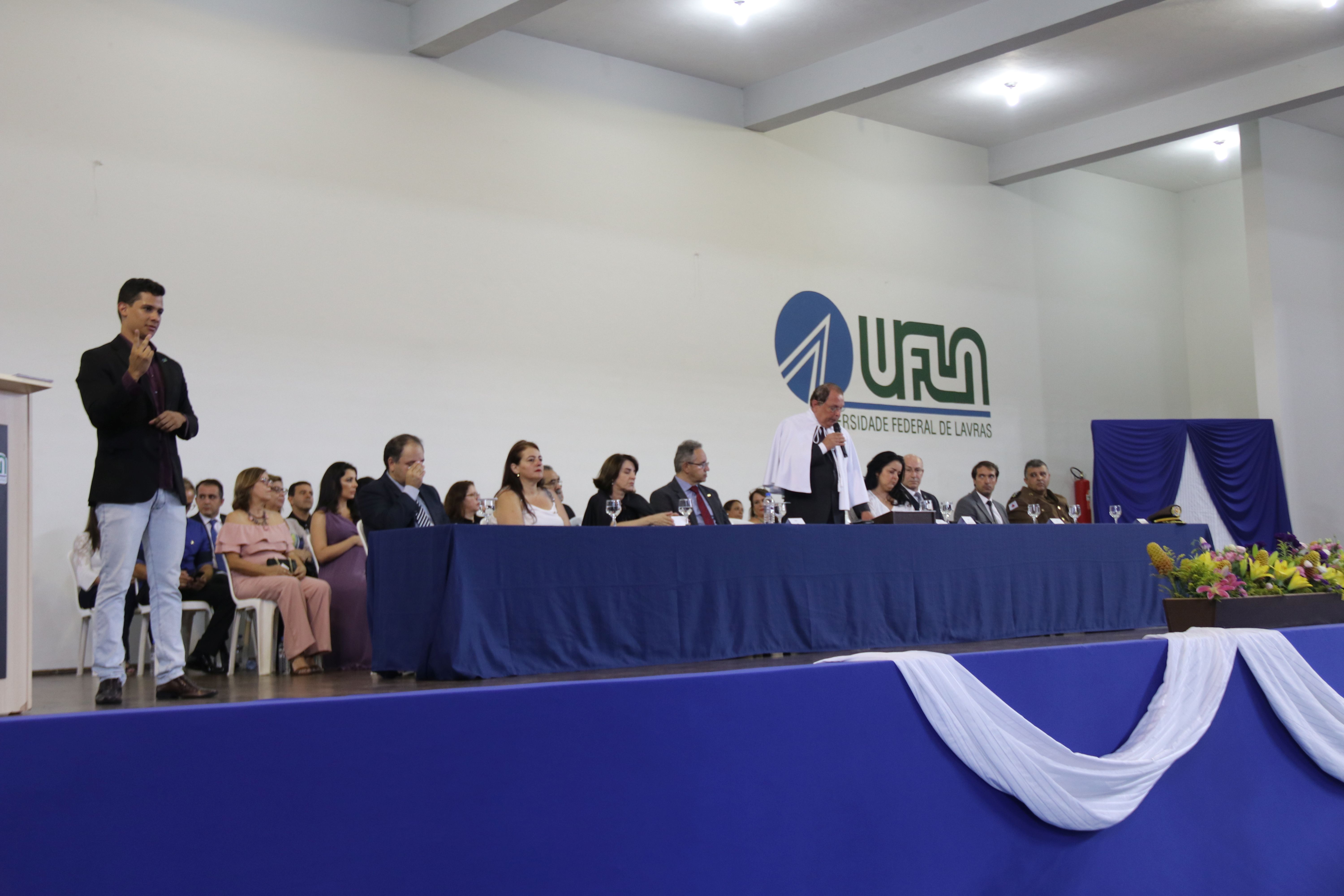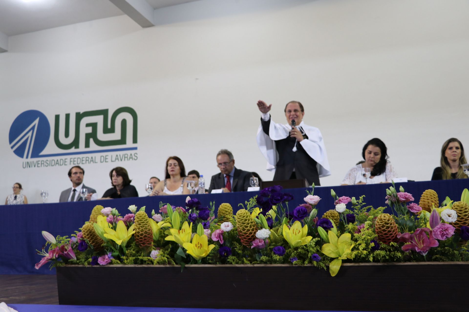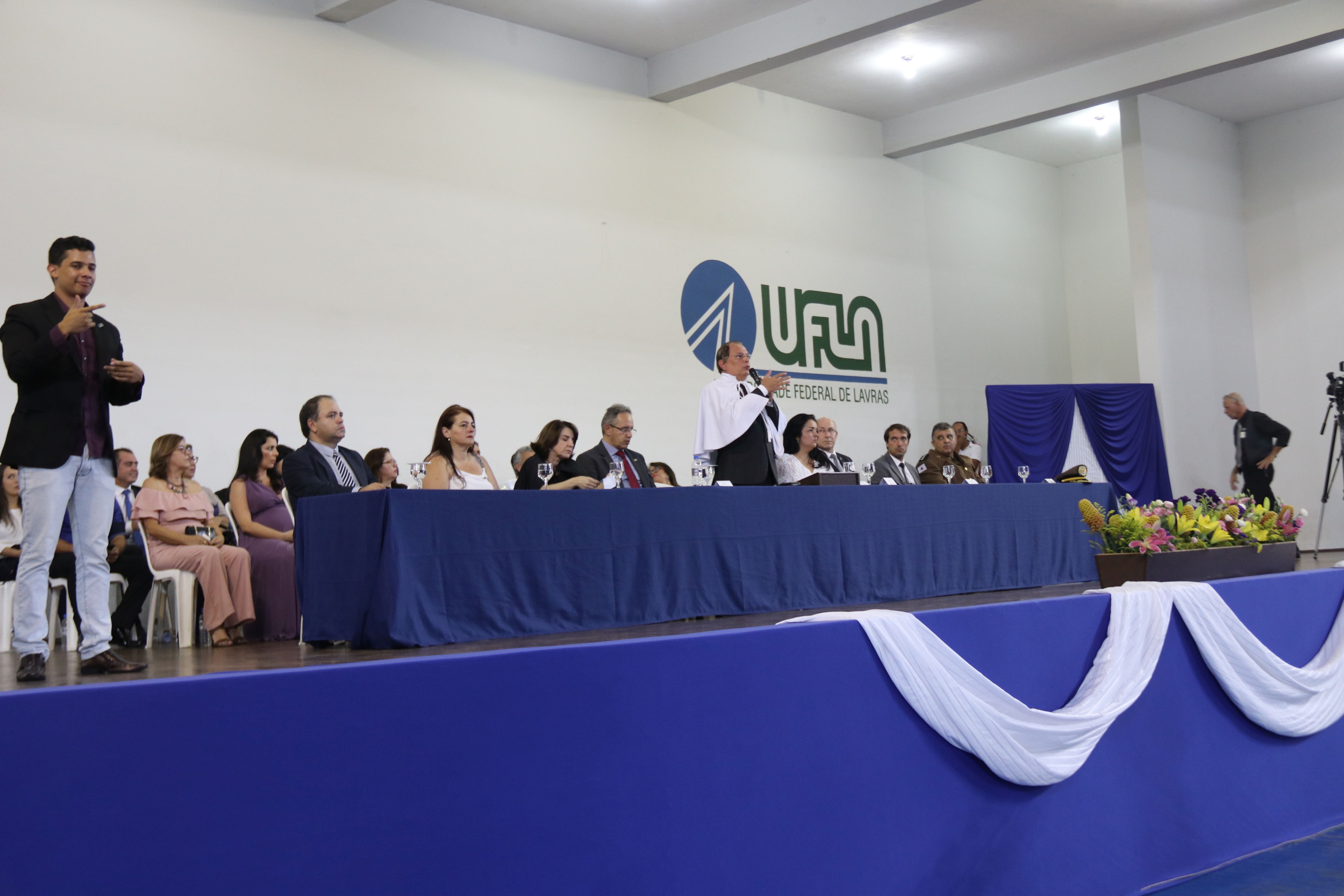 As solenidades foram presididas pelo reitor e presidente do CUNI, professor José Roberto Soares Scolforo. Após fazer referência à tradução das cerimônias na Língua Brasileira de Sinais (Libras), manifestou orgulho pelo fato de a UFLA trabalhar primando pela inclusão e pelo respeito às diversidades. Para os formandos, reforçou a importância do juramento que fizeram, especialmente pelo compromisso com a ética, a justiça e a defesa da liberdade e da paz. “Vocês tiveram a felicidade de se formar sob o investimento do povo brasileiro. Por isso devem se empenhar em cumprir esses compromissos carregados de valores que são hoje tão necessários à sociedade brasileira”. Scolforo também incentivou os novos profissionais a seguirem em frente: “vençam o medo deste momento posterior à conclusão do curso e lutem, busquem alcançar seus sonhos, sejam cidadãos de valor, pratiquem solidariedade e continuem a caminhada com garra e persistência, sempre respeitando as diferenças”.