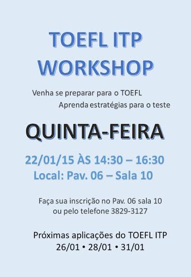 Vale destacar que a partir de maio de 2015, a única forma de inscrição para as vagas em cursos presenciais de inglês será a realização do Toefl ITP. O nivelamento do aluno nesses cursos será exclusivamente feito por essa avaliação.